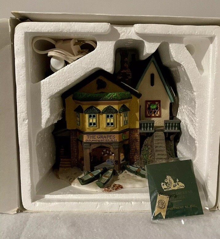 This is a pre-owned Department 56 Heritage/Dickens' Village piece called "The Grapes Inn" from the 5th edition, manufactured in 1996. It is a hand-painted ceramic and porcelain Christmas village house suitable for display on a window, furniture, or shelf. The asymmetrical-shaped house is multicolored and features Charles Dickens' character, with a Victorian style. It measures 11 inches in length, 8.5 inches in height, and 10 inches in width, weighing 6 pounds. It comes boxed and is a retired piece from the Dickens Village collection.