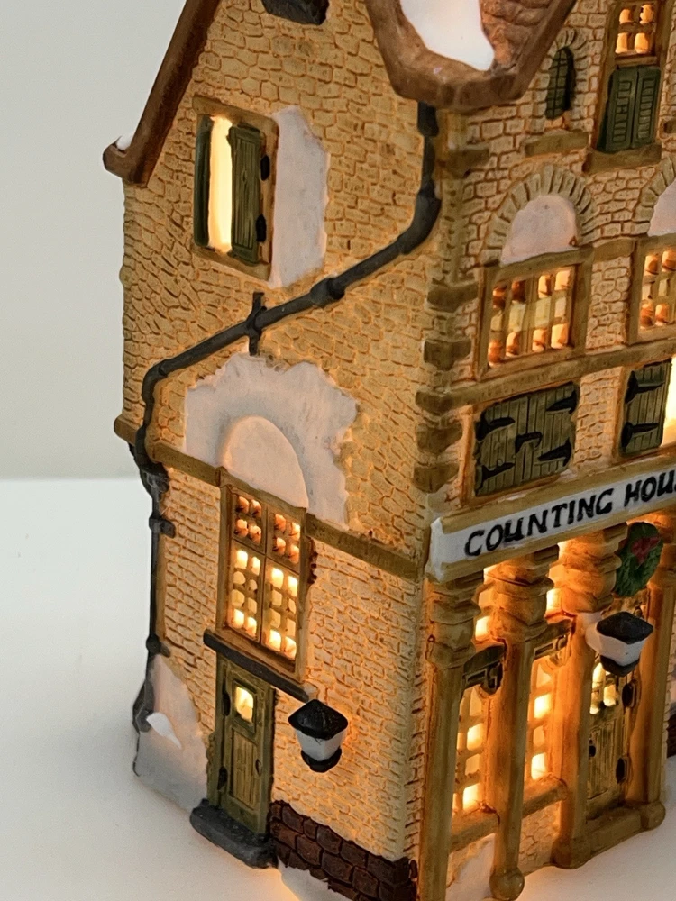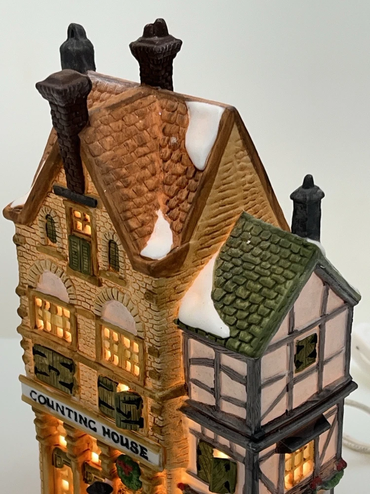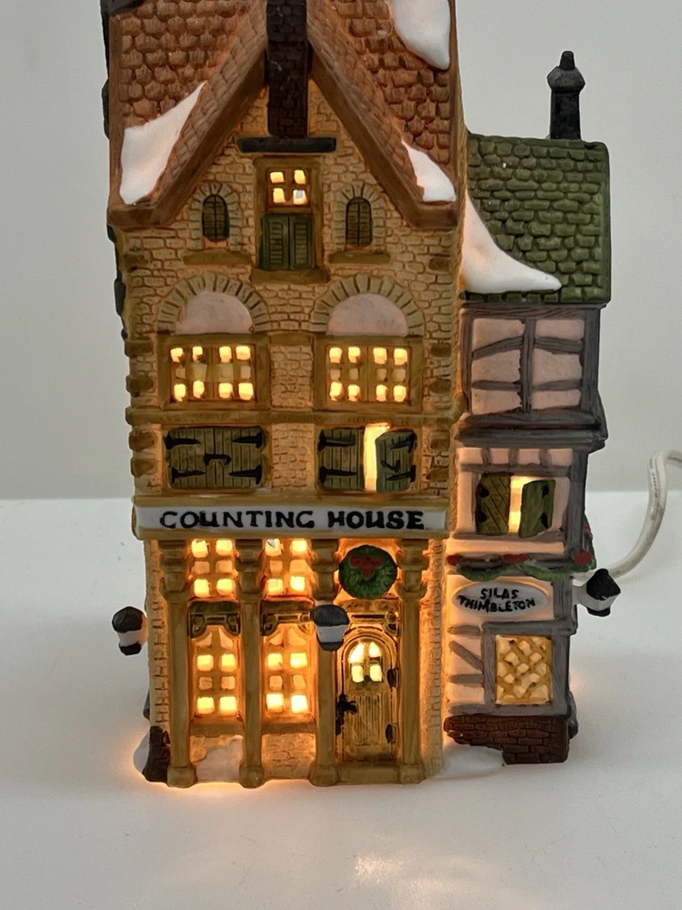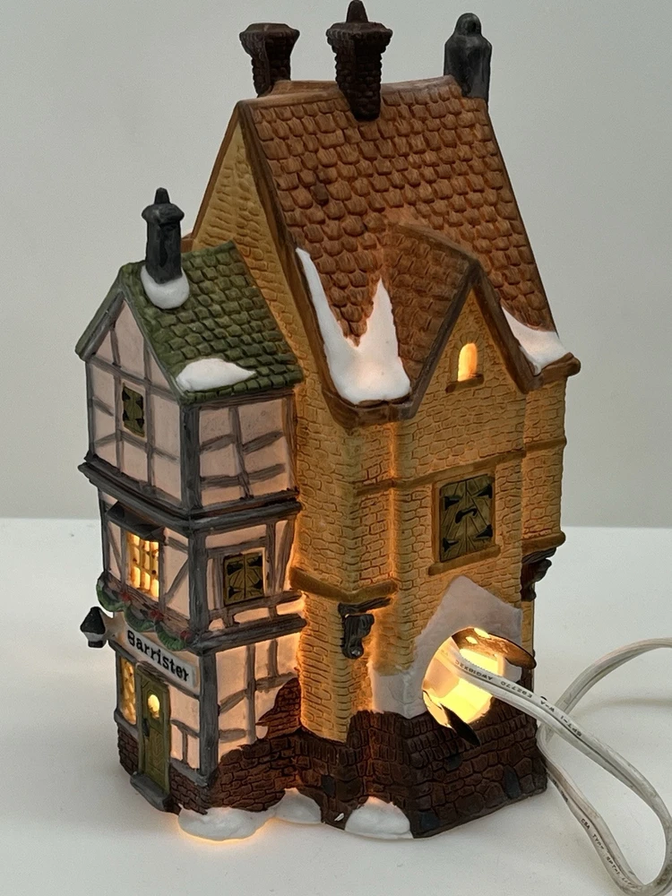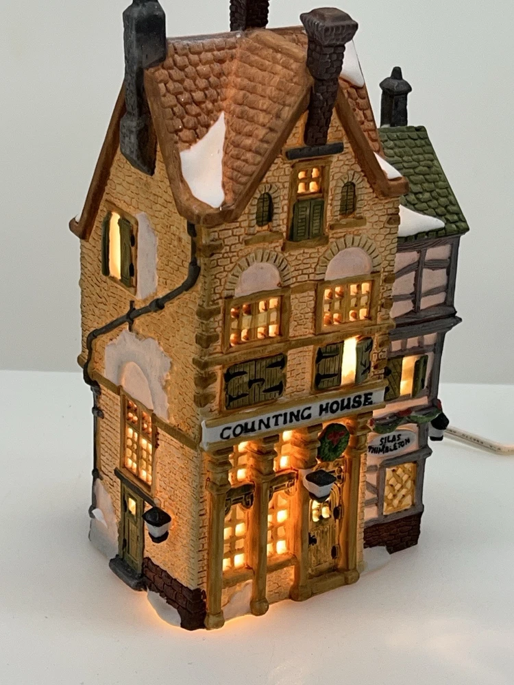 Add a touch of Victorian charm to your Christmas decor with this exquisite Dept 56 Heritage Village Collection piece. This hand-painted porcelain figurine features Silas Thimbleton Barrister, a beloved character from the Dickens Village series. The asymmetrical piece measures 4-1/2" in length, 8" in height, and 4" in width, making it a medium-sized addition to your collection. This retired, illuminated figurine is boxed and in excellent condition, ready to be displayed in any room of your home. Its whimsical pattern and multicolor finish make it a delightful addition to any Christmas village collection. Celebrate the season with this unique, original piece from the late 20th century, manufactured in Taiwan. Pristine condition with all original packaging including cord & light