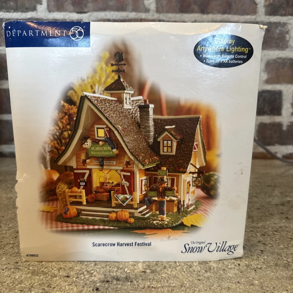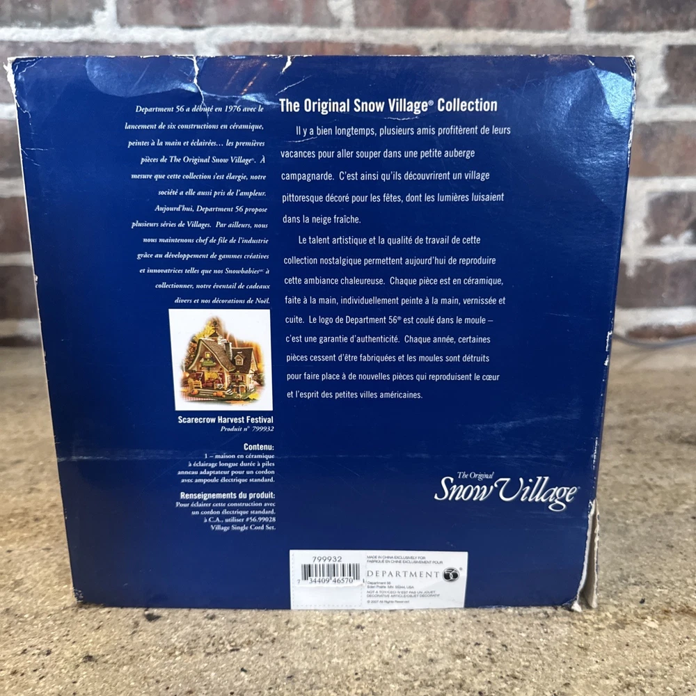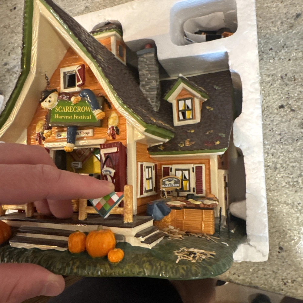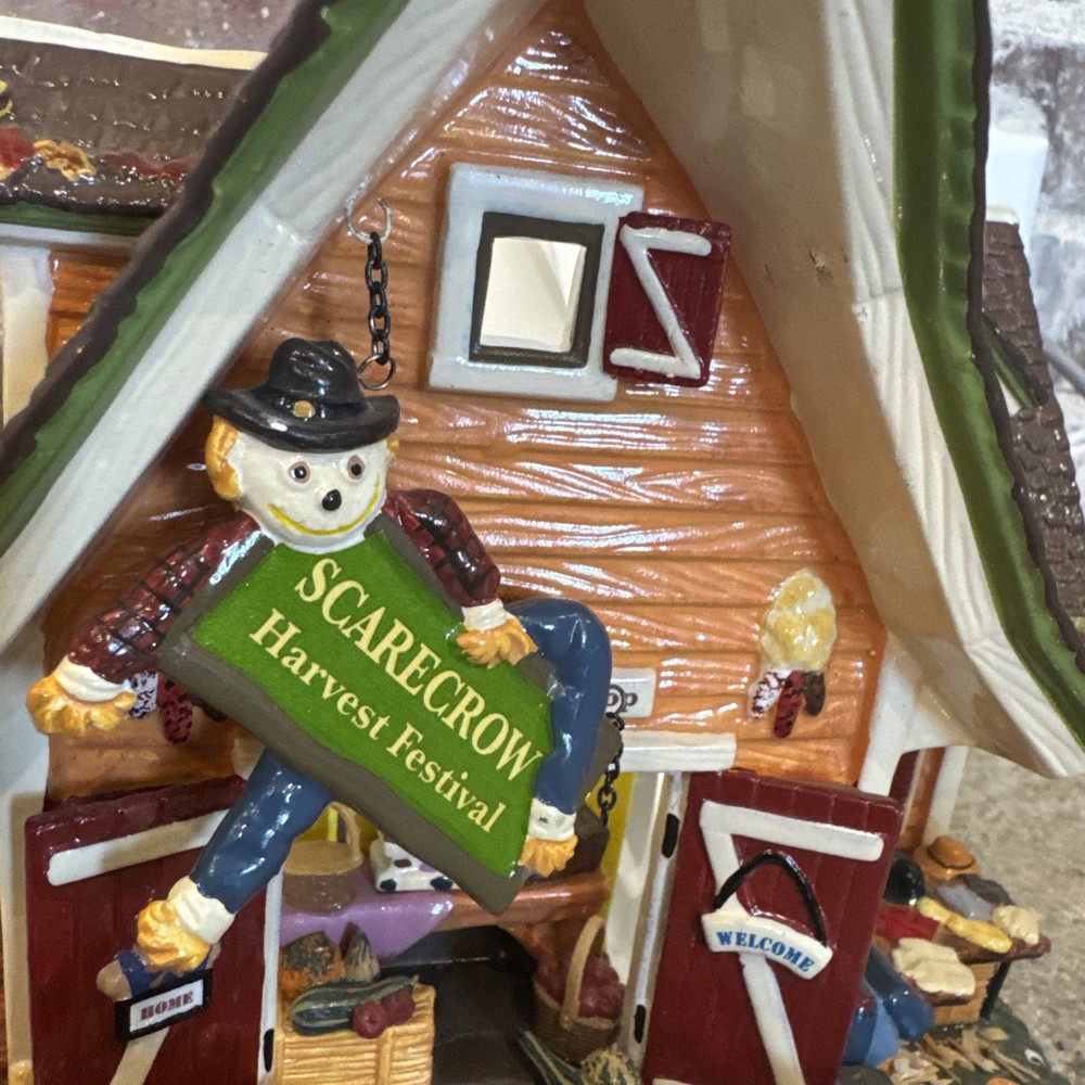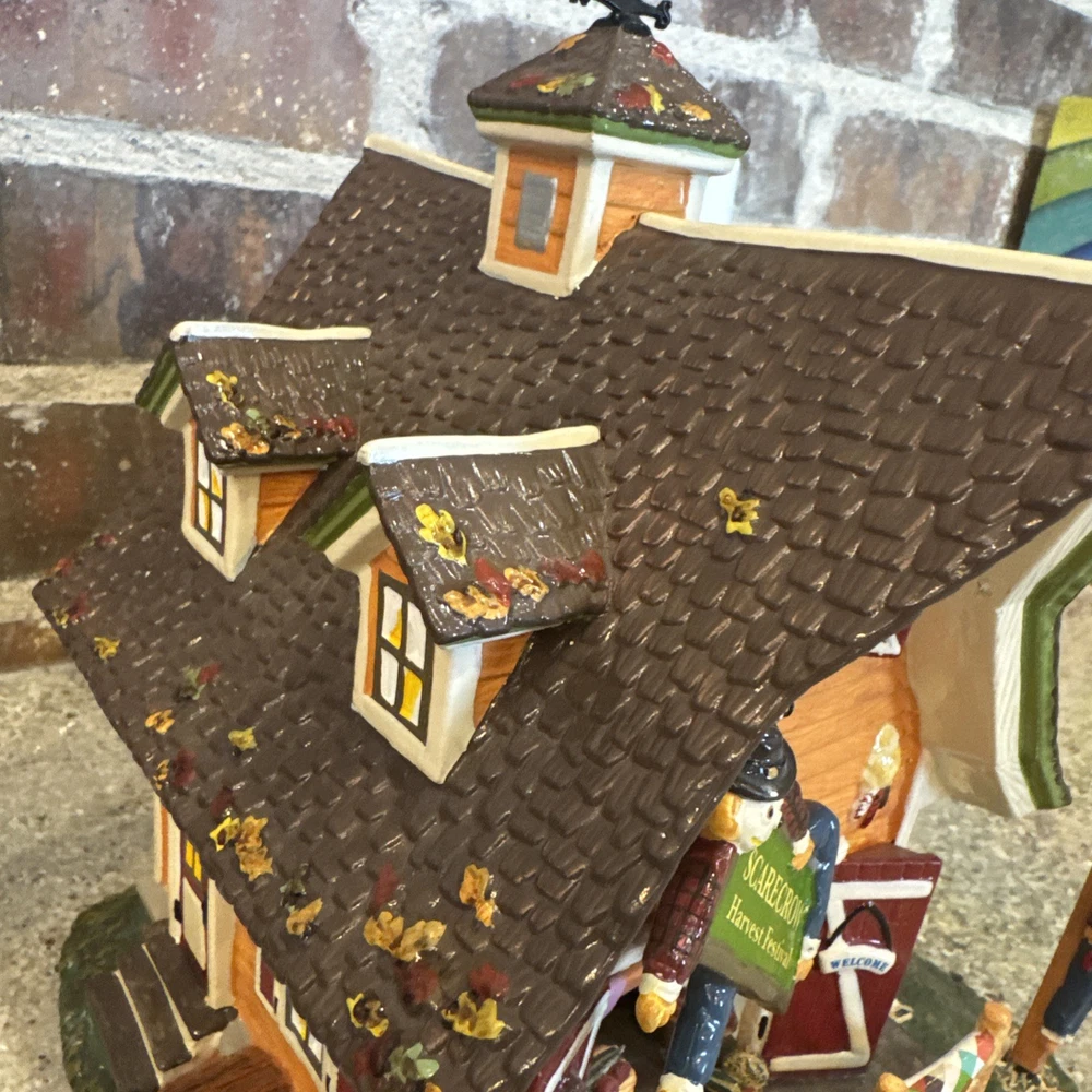 The Dept 56 Snow Village Scarecrow Harvest Festival 2007 # 799932 is a medium-sized collectible house from the Department 56 brand, part of the Snow Village collection. This original piece features a multi-color design with a seasonal fall theme, perfect for adult collectors. It comes in its original box packaging from 2007, making it a unique addition to any village display. Made in China in the 21st century, this scarecrow-themed house captures the essence of autumn villages in a charming and detailed design. The festival sign doesn’t hook on the right side. Please see pictures. I’ll include the small hook that fell off and it could possibly be re-added. Includes all other signs etc. Lighting does work as well. The weather vane is broken at the bottom. Please see the pictures. It’s still fits in the slot, but at times it can lean.