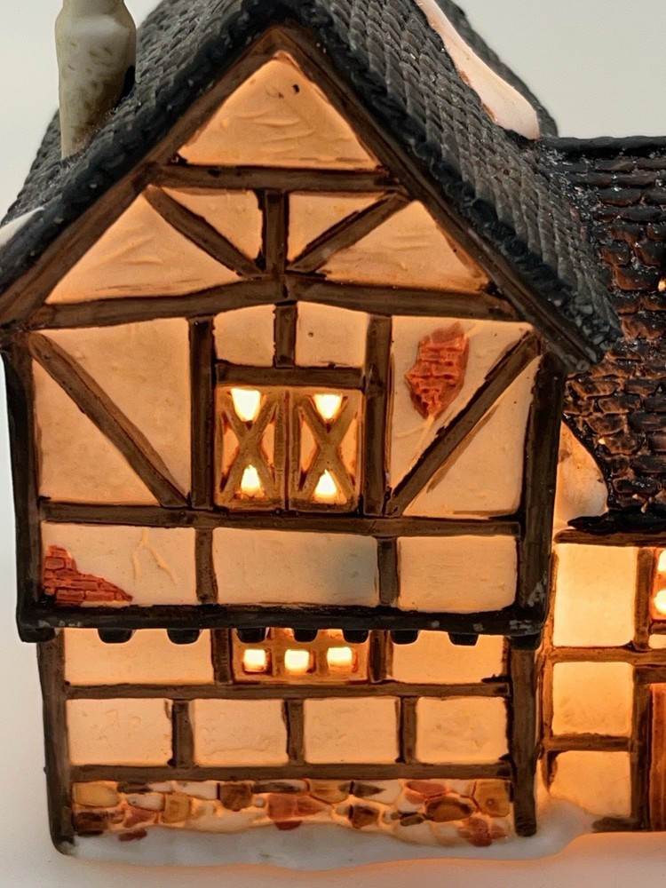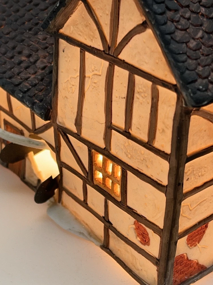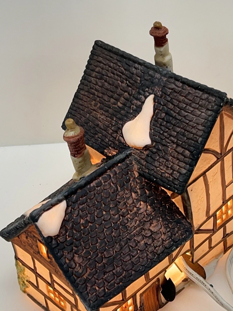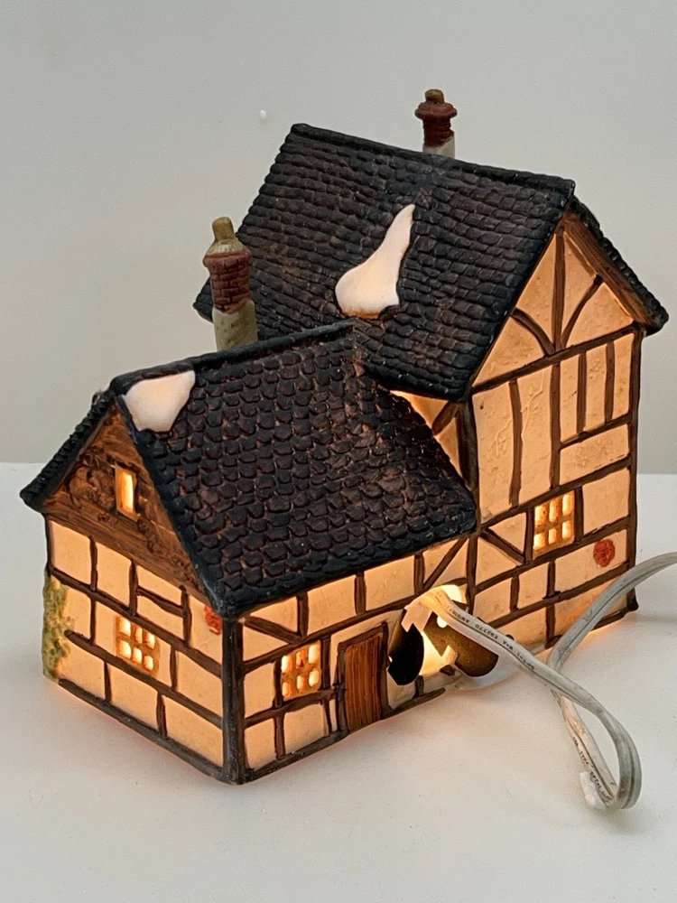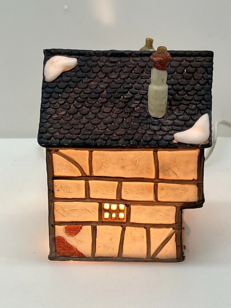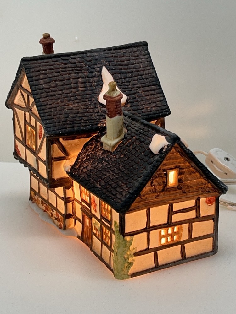 This beautiful porcelain cottage from the Department 56 Heritage Village Collection is a must-have for any collector of Christmas village houses. The Tudor Cottage, also known as the Dickens Village, features intricate hand-painted details and is illuminated for a cozy and charming display. The cottage is medium-sized, measuring 6 inches in length, 6 inches in height, and 4 inches in width, and is suitable for any room in your home. The cottage is a retired piece from 1985 and comes in its original box with the slip sleeve and styrofoam container. It is perfect for seasonal village displays and would make a great addition to any Dickens Village collection. The cottage is multi-colored and depicts a whimsical scene from Charles Dickens' Victorian era. This collectible item is a great gift for any lover of Christmas and Dickensian culture. Perfect condition with all original packaging including light & cord