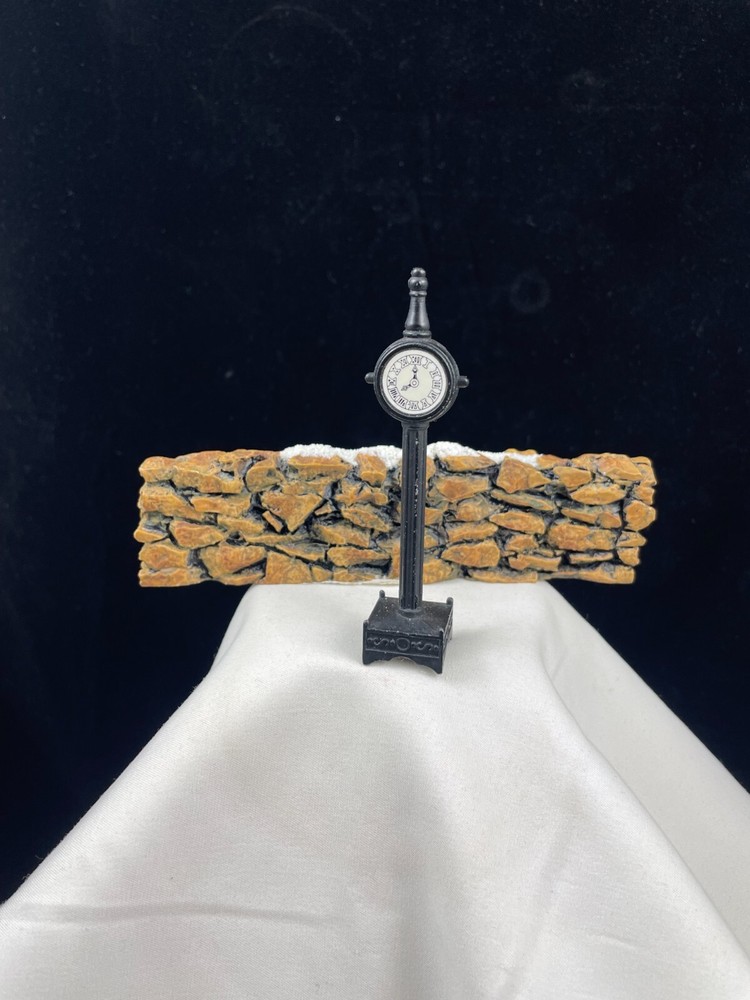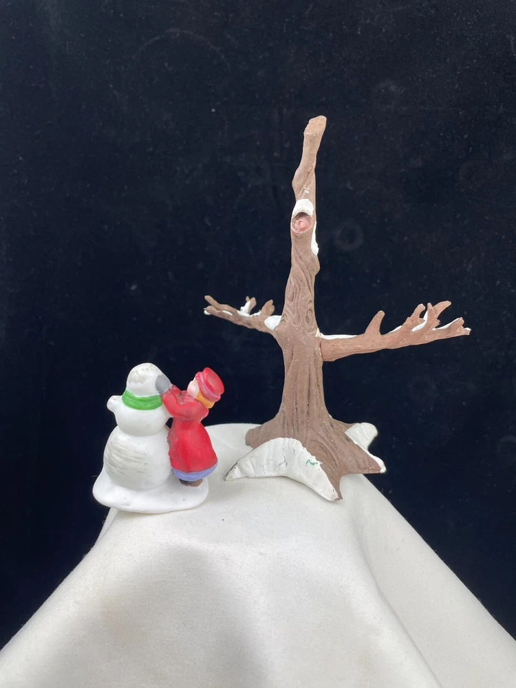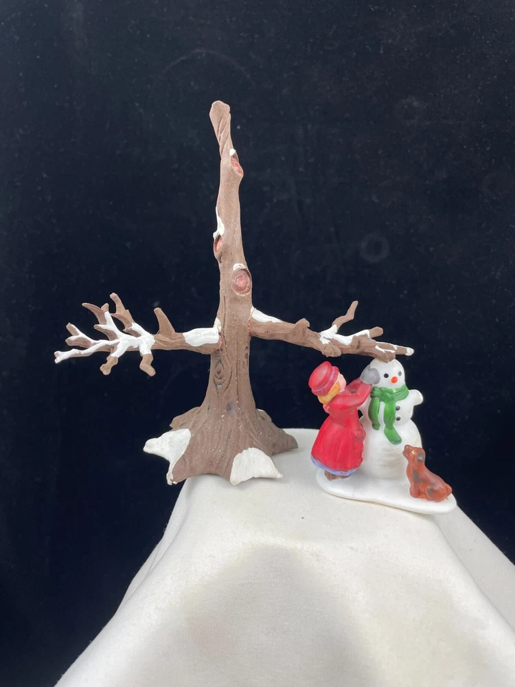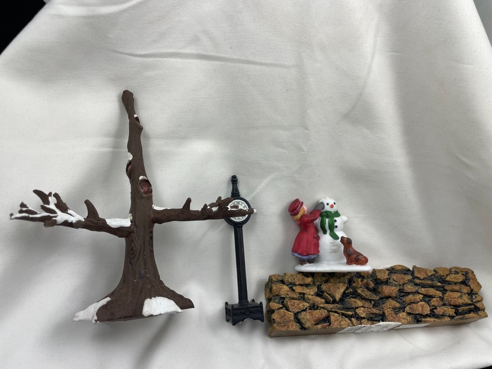 Lot of 4 Dept. 56 items figurines Variations made in Taiwan, Thailand, and China. 1. Stonewall 2.Small child, pet dog building a snowman 3. Steel street clock at 8pm 4. Leafless winter tree all items for one price. Located in ornament box on Georgia shelf #1