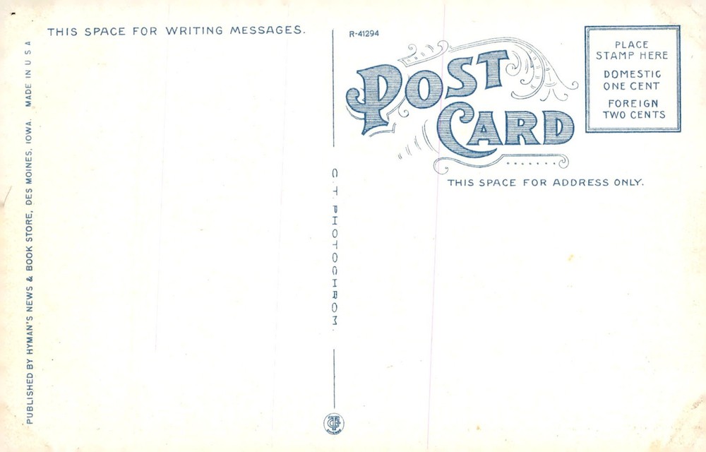 Vintage postcard featuring the Municipal Building in Des Moines, Iowa, published by Hyman's News & Book Store. Made in the USA with space for writing messages and address. Domestic postage one cent, foreign two cents.