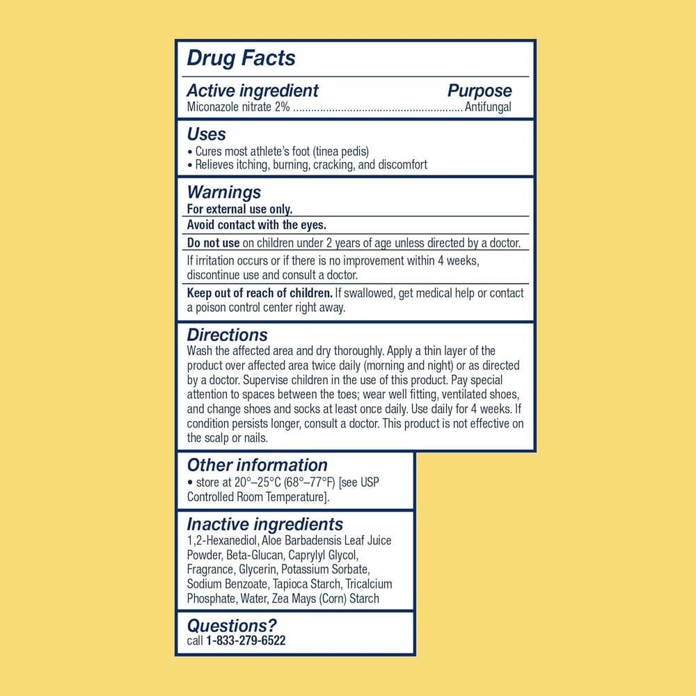 Desenex Anti-Fungal Foot Powder, Cures Most Athlete’s 3 Ounce (Pack of 1) Product Details Product Dimensions : 2 x 2 x 6.09 inches; 3 ounces Brand: Desenex Item Form: Powder Scent: Unscented Material Type Free: Talc Free Special Feature: Odor Protection, All Day Protection This effective powder cures most athlete's foot. It gives you lasting relief from the itching, burning, and scaling caused by athlete's foot. Powerful, prescription-strength 2% Miconazole Nitrate targets fungus that causes athlete’s foot. Triple-Action Formula: 1) Relieves athlete's foot symptoms, 2) Attacks and absorbs moisture to discourage fungal growth and keep you feeling comfortable, and 3) Provides all-day odor control for foot freshness. When you’re working hard, you want a foot powder that gets the job done. 96% of users agreed Desenex absorbed sweat and moisture immediately and 93% agreed powder destroys & neutralizes odor (Data on file). Free from talc, parabens, and aluminum. Since World War II, we’ve been a reliable choice for hardworking people dealing with athlete's foot. Trusted for decades, Desenex powder relieves the symptoms of athlete’s foot so you can get back on your feet with confidence. Desenex’s antifungal formula attacks excess moisture and soothes the itching, burning and cracking associated with athlete’s foot.