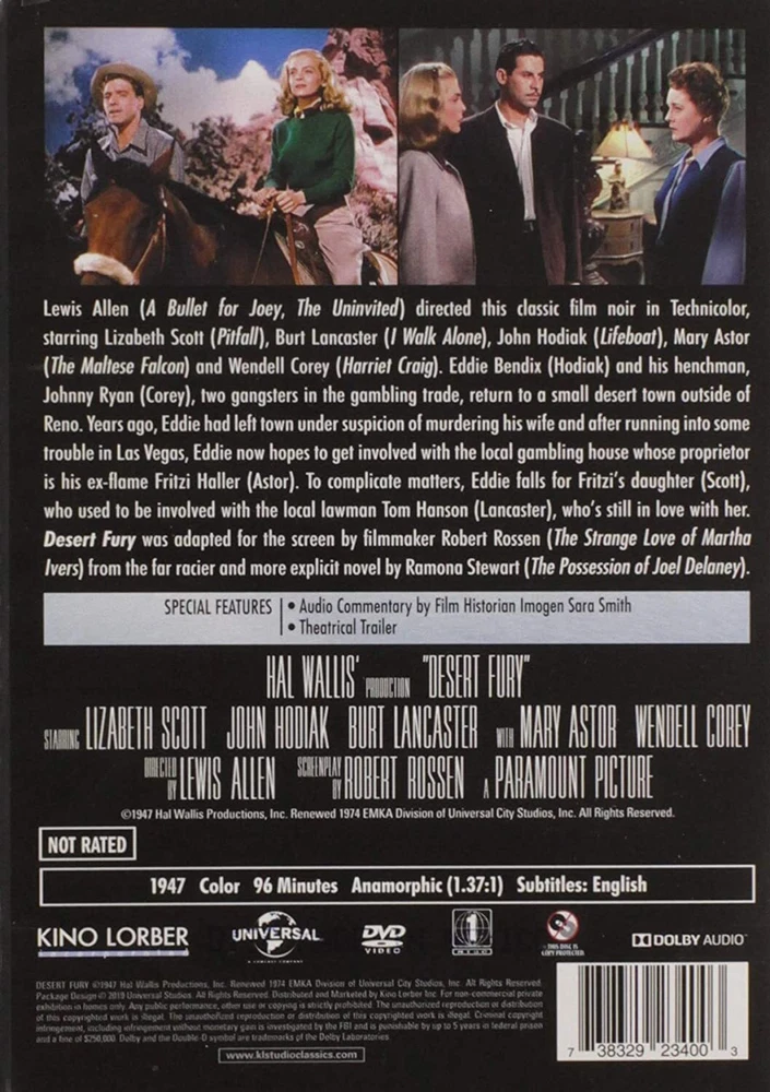 Studio: KL Studio Classics Release Year: 1947 Region Code: DVD: 1 (US, Canada...) Rating: NR Language: English UPC: 0738329234003 gtin13: 0738329234003 Release Date: 02/26/2019 Director: Lewis Allen Actor: Wendell Corey Title: Desert Fury Subtitle Language: English EAN: 0738329234003 Country/Region of Manufacture: USA Format: DVD Run Time: 96 min. Aspect Ratio: 1.37:1 No Of Discs: 1 Sub-Genre: Film Noir Movie/TV Title: Desert Fury Genre: Mystery / Suspense