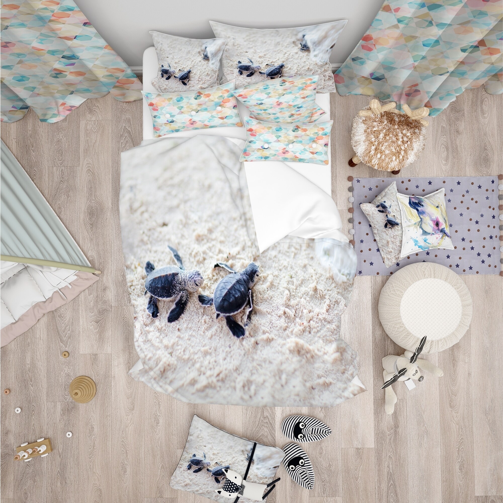 Bring the beauty of the ocean into your bedroom with this gorgeous Designart 'Baby Green Turtles on Sand' Animal Bedding Set. Made from ultra-soft and lightweight 100% microfiber polyester, this animal print bedding set is wrinkle-resistant and printed using high density Italian ink to create vibrant colors. The set includes one duvet cover and two shams, making it easy to create a complete and stylish look in your bedroom. Available in twin, queen, and king sizes, this Coastal bed set is both trendy and fun, perfect for updating your bedroom decor. Please note that the pillow cases and comforter insert are not included.Features: Vibrant colors created using High Density Italian Ink Ultra-soft and lightweight 100% microfiber polyester material Includes one bed cover and two standard Free Shipping Over $49.99* Details Designart 'Baby Green Turtles on Sand' Animal Bedding Set - Duvet Cover & Shams Product Description: Bring the beauty of the ocean into your bedroom with this gorgeous Designart 'Baby Green Turtles on Sand' Animal Bedding Set. Made from ultra-soft and lightweight 100% microfiber polyester, this animal print bedding set is wrinkle-resistant and printed using high density Italian ink to create vibrant colors. The set includes one duvet cover and two shams, making it easy to create a complete and stylish look in your bedroom. Available in twin, queen, and king sizes, this Coastal bed set is both trendy and fun, perfect for updating your bedroom decor. Please note that the pillow cases and comforter insert are not included. Features: Vibrant colors created using High Density Italian Ink Ultra-soft and lightweight 100% microfiber polyester material Includes one bed cover and two standard pillow shams Trendy and fun animal print design Made in Canada Wrinkle-resistant fabric Pillow cases and comforter insert not included Product Details: MaterialPolyester PatternAnimal Print ColorGreen StyleNautical & Coastal Wildlife, Coastal, Animals ReversibleNo Directions: Machine wash on cold gentle cycle. Wash separately on first wash. Use only non-chlorine bleach when needed. Tumble dry low. Remove promptly. King: 1 Duvet Cover104 inches wide x 88 inches long 2 King Shams20 inches wide x 36 inches long Queen: 1 Duvet Cover88 inches wide x 88 inches long 2 Standard Shams16 inches wide x 26 inches long Twin: 1 Duvet Cover68 inches wide x 88 inches long 1 Standard Sham16 inches wide x 26 inches long