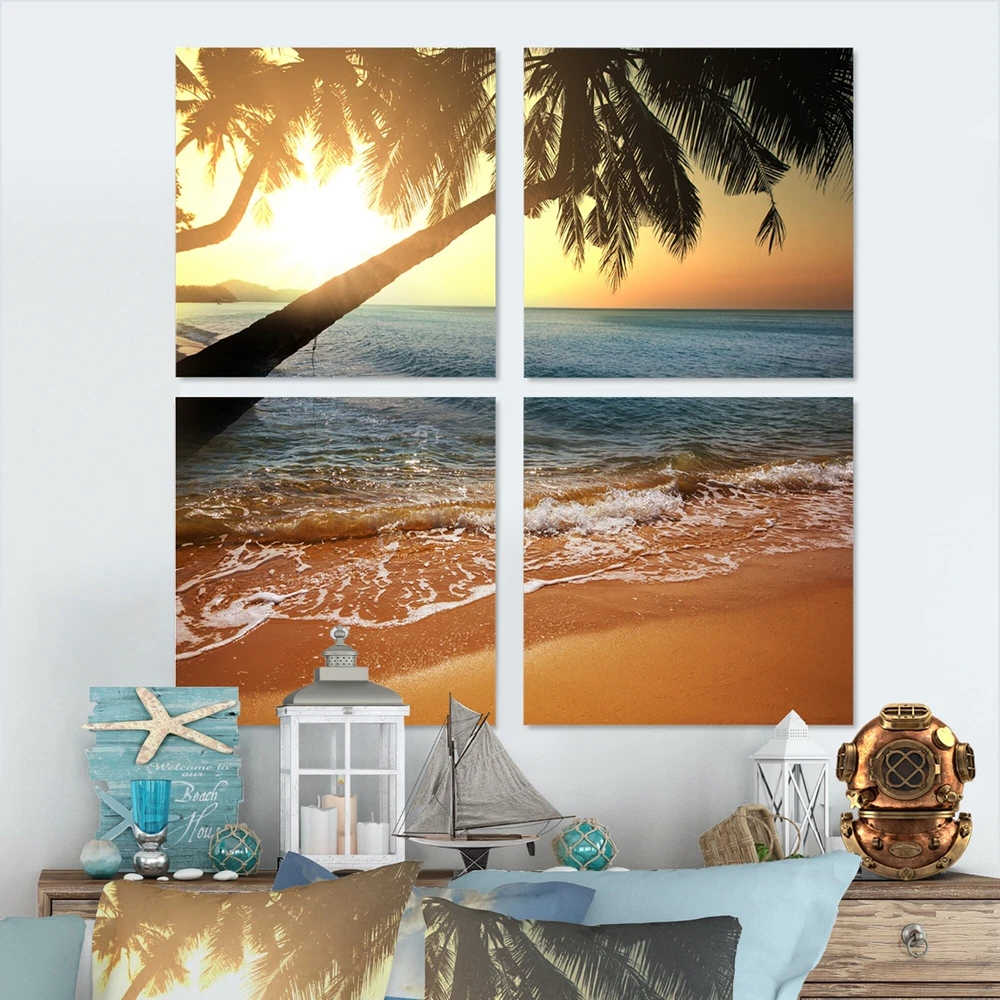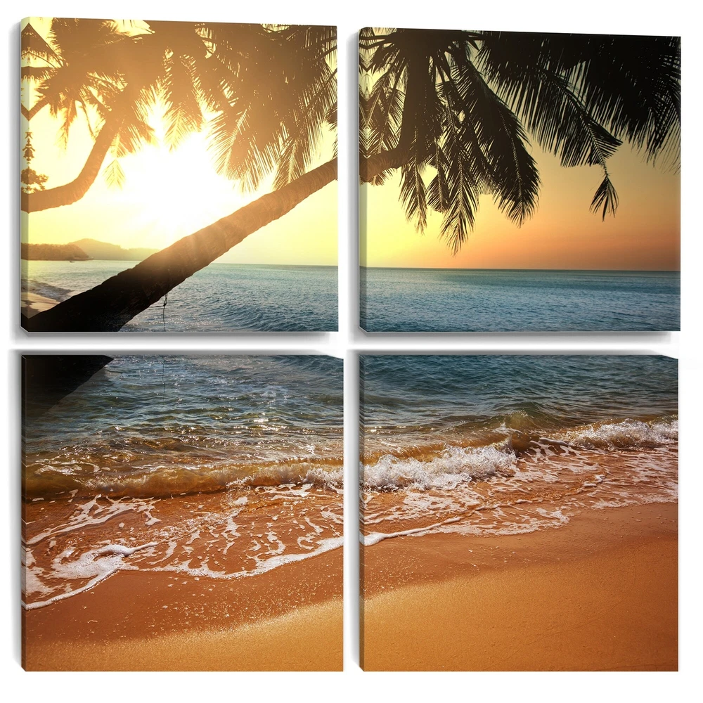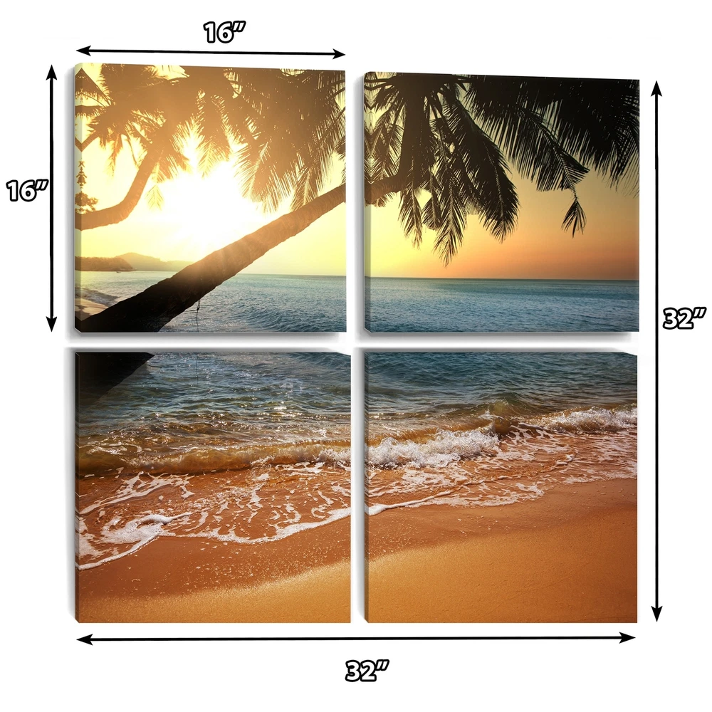 This beautiful Beautiful Sunset on Tropical Beach Multipanels canvas art is printed using the highest quality fade-resistant ink on canvas. Every one of our fine art giclee canvas prints is printed on premium quality cotton canvas, using the finest quality inks which will not fade over time. Each giclee print is stretched tightly over a 1-inch wood subframe ensuring the canvas is taught and does not buckle. This canvas art print is gallery-wrapped (the design continues on the sides), giving it a real art gallery feel. All of our canvas prints are carefully packaged with plastic protection, fragile labeling, and sturdy boxes to ensure safe delivery. Every canvas print arrives ready to hang on the wall, with the hanging kits included.- Style : Nautical & Coastal- Subject : Beach- Color : Free Shipping Over $49.99* Details Designart "Beautiful Sunset on Tropical Beach" Sea & Shore Canvas Wall Art Print Product Description: This beautiful Beautiful Sunset on Tropical Beach Multipanels canvas art is printed using the highest quality fade-resistant ink on canvas. Every one of our fine art giclee canvas prints is printed on premium quality cotton canvas, using the finest quality inks which will not fade over time. Each giclee print is stretched tightly over a 1-inch wood subframe ensuring the canvas is taught and does not buckle. This canvas art print is gallery-wrapped (the design continues on the sides), giving it a real art gallery feel. All of our canvas prints are carefully packaged with plastic protection, fragile labeling, and sturdy boxes to ensure safe delivery. Every canvas print arrives ready to hang on the wall, with the hanging kits included. - Style Nautical & Coastal - Subject Beach - Color Multi-Color - This canvas giclee print is gallery-wrapped (the design continues on the sides) , giving it a real art gallery feel. - Premium quality cotton canvas. - Arrives ready to hang on the wall - Easy to Hang