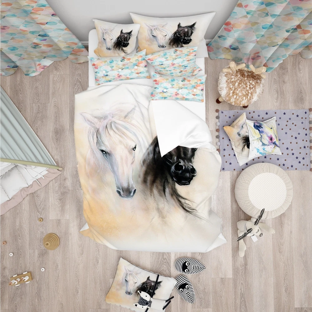Bring the beauty and grace of horses into your bedroom with this stunning duvet cover set. Featuring a striking black and white horse head design, this set comes complete with two matching pillow shams. The wrinkle-resistant and machine-washable microfiber fabric ensures easy maintenance and comfortable sleeping. With its elegant and trendy colors, this set will add a stylish touch to any bedroom decor.Features: High Density Italian Ink produces vibrant colors Ultra-soft, lightweight 100% microfiber polyester for down-like comfort and odorless relaxation Traditional set includes one bed cover and two standard pillow shams for a complete look Made in Canada Decorative wall art and throw pillows available but sold separately Comforter insert and pillow inserts not includedProduct Free Shipping Over $49.99* Details Designart 'Black and White Horse Heads' Animal Bedding Set - Duvet Cover & Shams Product Description: Bring the beauty and grace of horses into your bedroom with this stunning duvet cover set. Featuring a striking black and white horse head design, this set comes complete with two matching pillow shams. The wrinkle-resistant and machine-washable microfiber fabric ensures easy maintenance and comfortable sleeping. With its elegant and trendy colors, this set will add a stylish touch to any bedroom decor. Features: High Density Italian Ink produces vibrant colors Ultra-soft, lightweight 100% microfiber polyester for down-like comfort and odorless relaxation Traditional set includes one bed cover and two standard pillow shams for a complete look Made in Canada Decorative wall art and throw pillows available but sold separately Comforter insert and pillow inserts not included Product Details: MaterialPolyester PatternAnimal Print ColorBlack StyleCountry Wildlife, Cottage/Country, Animals ReversibleNo King: Duvet Cover104 inches wide x 88 inches long King Shams20 inches wide x 36 inches long (2) Queen: Duvet Cover88 inches wide x 88 inches long Standard Shams16 inches wide x 26 inches long (2) Twin: Duvet Cover68 inches wide x 88 inches long Standard Sham16 inches wide x 26 inches long Care Instructions: Machine wash on cold gentle cycle. Wash separately on first wash. Use only non-chlorine bleach when needed. Tumble dry low. Remove promptly.
