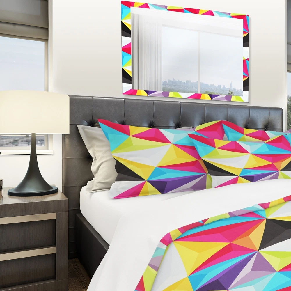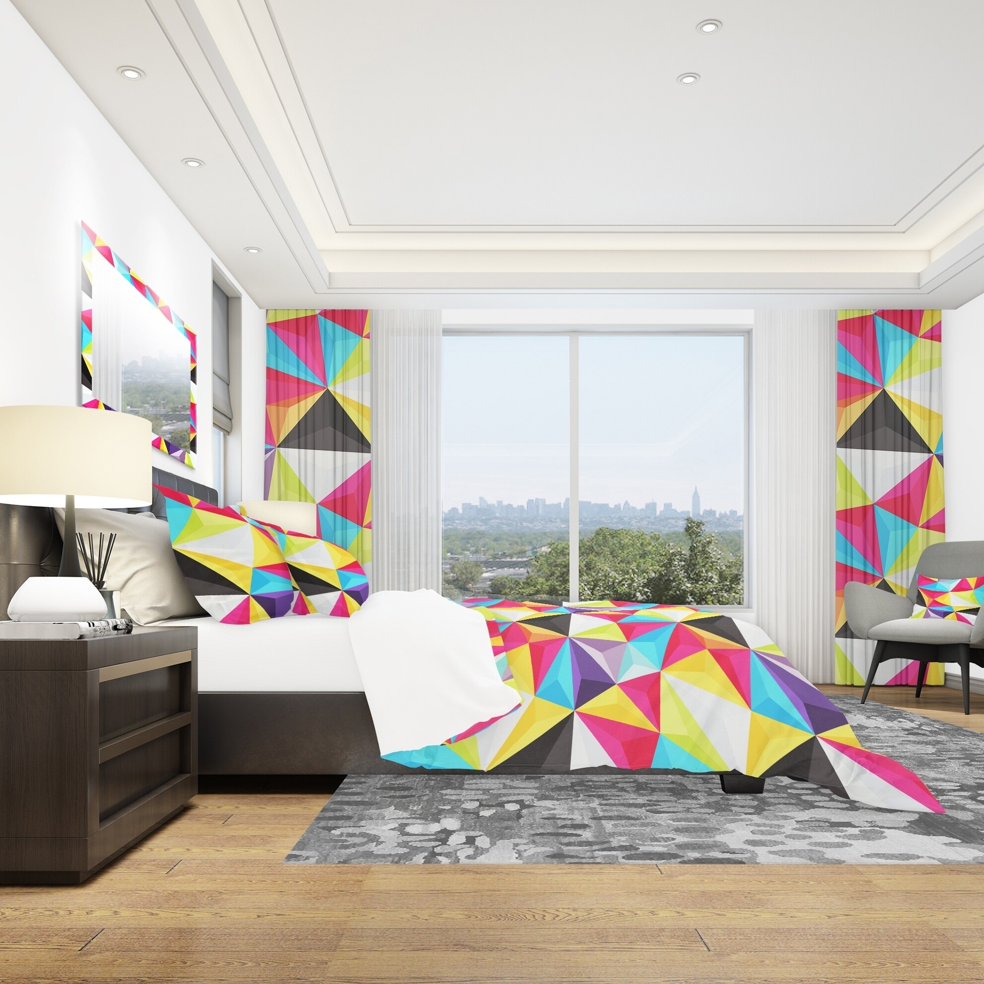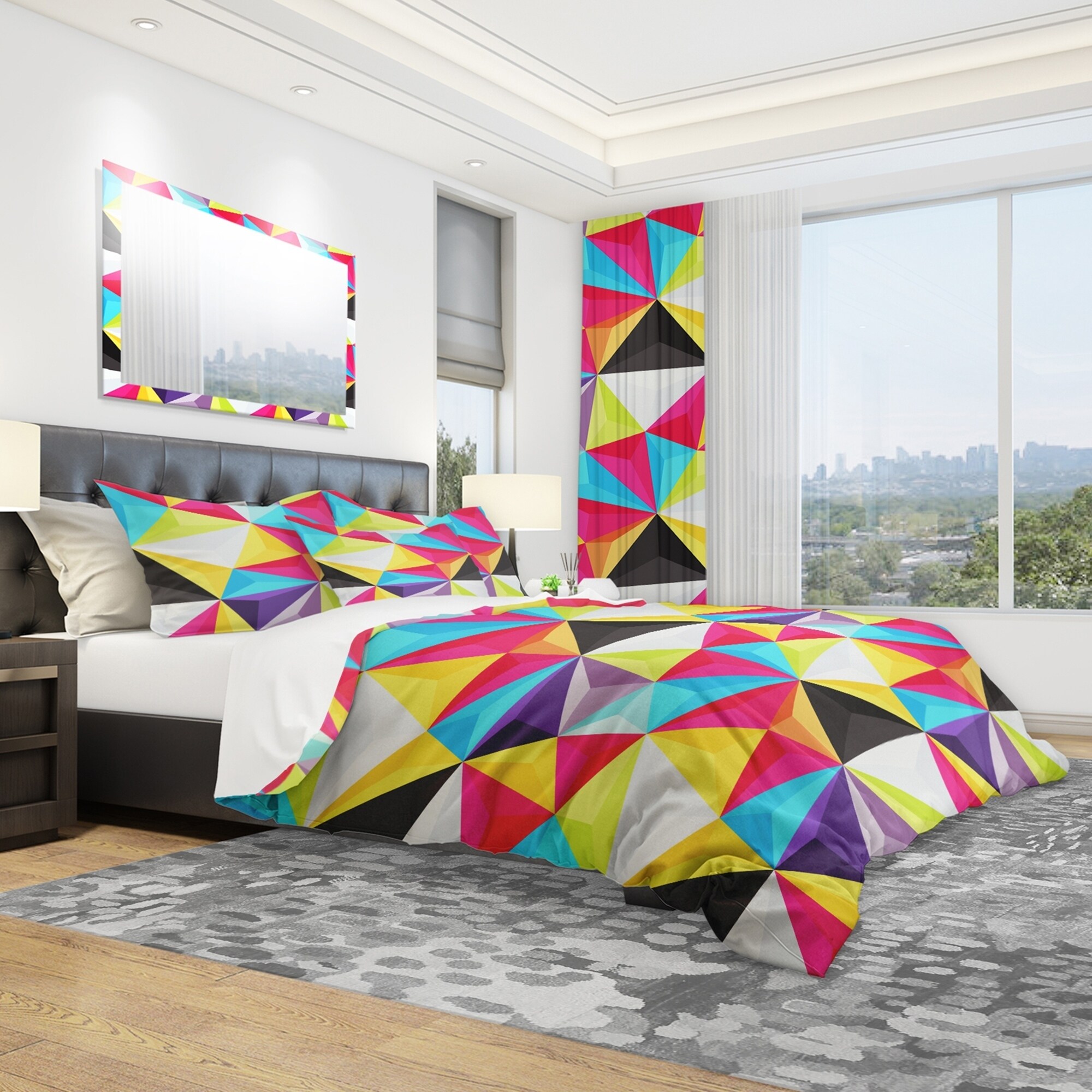 Experience the ultimate comfort and style with this Modern & Contemporary bedding set. The abstract design is created using high density Italian ink and printed on 100% microfiber polyester, ensuring a luxurious and soft feel that promises a good night's sleep. This set includes one duvet cover and two shams, available in twin, queen, and king sizes. The wrinkle-resistant fabric and down-like comfort make this bedding set a must-have addition to your bedroom. Plus, the elegant colors are both trendy and fun, perfect for sprucing up your space.Features: Vibrant colors printed using High Density Italian Ink Made from ultra-soft, lightweight 100% microfiber polyester Includes one duvet cover and two standard pillow shams for a complete and stylish look Elegant and soft colors add a trendy Free Shipping Over $49.99* Details Designart 'Bright Triangle' Modern Bedding Set - Duvet Cover & Shams Product Description: Experience the ultimate comfort and style with this Modern & Contemporary bedding set. The abstract design is created using high density Italian ink and printed on 100% microfiber polyester, ensuring a luxurious and soft feel that promises a good night's sleep. This set includes one duvet cover and two shams, available in twin, queen, and king sizes. The wrinkle-resistant fabric and down-like comfort make this bedding set a must-have addition to your bedroom. Plus, the elegant colors are both trendy and fun, perfect for sprucing up your space. Features: Vibrant colors printed using High Density Italian Ink Made from ultra-soft, lightweight 100% microfiber polyester Includes one duvet cover and two standard pillow shams for a complete and stylish look Elegant and soft colors add a trendy and fun touch to your bedroom Made in Canada Comforter and pillow inserts are not included Machine washable on cold gentle cycle King: 1 Duvet Cover104 inches wide x 88 inches long 2 King Shams20 inches wide x 36 inches long Queen: 1 Duvet Cover88 inches wide x 88 inches long 2 Standard Shams16 inches wide x 26 inches long Twin: 1 Duvet Cover68 inches wide x 88 inches long 1 Standard Sham16 inches wide x 26 inches long Additional Details: MaterialPolyester PatternGeometric ColorRed StyleModern Contemporary Geometric, Modern & Contemporary, Abstract ReversibleNo NotePillow cases are not included but can be purchased separately. Comforter insert is not included. Decorative wall art and throw pillows to match this set are available but sold separately.