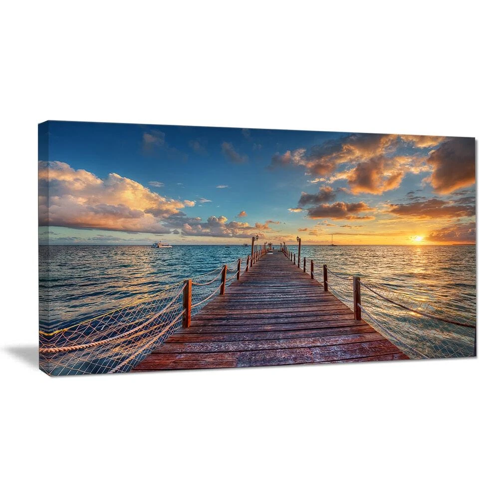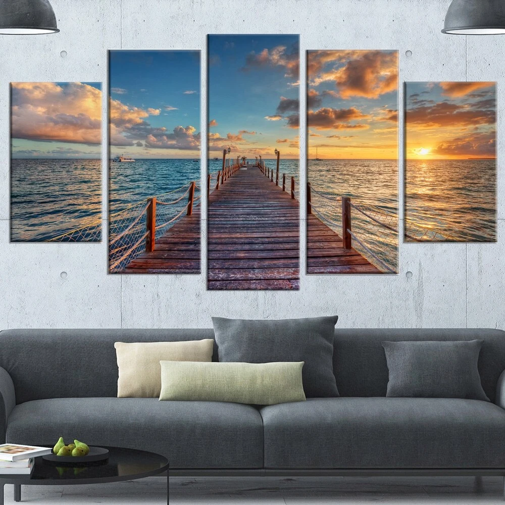 Transport yourself to the beach and consider the horizon at any time with this 'Brilliant Sunrise Over Sea Pier' wall art. Resembling fine art photography, this series of panels are actually high-grad ink applied to durable canvas. The canvas is stretched taut over a wood sub-frame and gallery-wrapped for immediate display.Shape: RectangleOrientation: HorizontalSubject: Photography, Architecture, CityscapesStyle: Contemporary, Fine Art Giclee, ModernSize: Oversized Free Shipping Over $49.99* Details Designart "Brilliant Sunrise over Sea Pier" Modern Bridge 60 in. wide x 32 in. Product Description: Transport yourself to the beach and consider the horizon at any time with this 'Brilliant Sunrise Over Sea Pier' wall art. Resembling fine art photography, this series of panels are actually high-grad ink applied to durable canvas. The canvas is stretched taut over a wood sub-frame and gallery-wrapped for immediate display. ShapeRectangle OrientationHorizontal SubjectPhotography, Architecture, Cityscapes StyleContemporary, Fine Art Giclee, Modern SizeOversized
