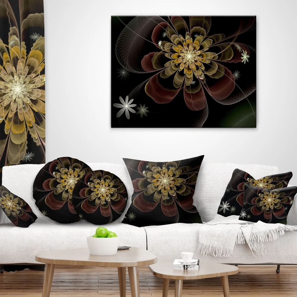 Decorative Throw Pillows for Couch Bed Sofa with Zip CoversAn easy, fun way to add a pop of color or bring new life to any room in your home or office is with these beautiful Floral throw pillows. Dress up your bed, sofa or lounger with this decorative design art pillows. Perfect as Farmhouse bedroom décor, lounge décor Traditional living room décor. It adds a fun accent to any room. Throw pillows really do work wonders: they can transform any room from uninviting discomfort to warm and welcoming. And they really do go almost anywhere - arrange a couple on the couch or sofa, place one in your overstuffed chair for extra coziness, toss a couple on the bed and prop yourself up for a great read.These Floral pillow is printed using High Color Density Italian inks to create a vibrantly colored, Free Shipping Over $49.99* Details Designart 'Brown Fractal Flower with Silver stars' Floral Throw Pillow Product Description: Decorative Throw Pillows for Couch Bed Sofa with Zip Covers An easy, fun way to add a pop of color or bring new life to any room in your home or office is with these beautiful Floral throw pillows. Dress up your bed, sofa or lounger with this decorative design art pillows. Perfect as Farmhouse bedroom décor, lounge décor Traditional living room décor. It adds a fun accent to any room. Throw pillows really do work wondersthey can transform any room from uninviting discomfort to warm and welcoming. And they really do go almost anywhere - arrange a couple on the couch or sofa, place one in your overstuffed chair for extra coziness, toss a couple on the bed and prop yourself up for a great read. These Floral pillow is printed using High Color Density Italian inks to create a vibrantly colored, sharp artwork. Features: Perfect accent to any furniture piece Basic shapes with a modern graphic design twist Printed on 100% light weight polyester Cushion filled with 100% polyester fill Wrinkle resistant fabric Zip Closure so you can remove the pillow from its' cover Down-like comfort - Odorless 100% Hypoallergenic Machine Wash Cold Separately, Gently Cycle Only, No bleach, hang to dry Print on Demand with High Density Italian Ink Available in Several sizes Attribute :Farmhouse, Traditional, Modern Subject Floral, Landscapes, Country Charm