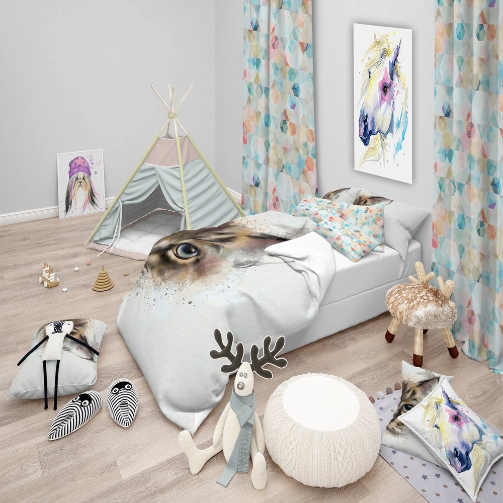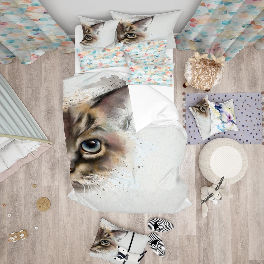 Bring a touch of nature to your bedroom with the Designart 'Cat Half Face Watercolor' Animal Bedding Set. Made with 100% microfiber polyester and high-density Italian ink, this bedding set is both comfortable and vibrant. The set includes one duvet cover and two shams, making it easy to create a complete and stylish look in your bedroom. Available in twin, queen, and king sizes, this Country Wildlife bed set is perfect for any animal lover. Made in Canada, this ultra-soft and lightweight bedding set is wrinkle-resistant and odorless, ensuring a comfortable sleep all night long.Features: High-density Italian ink for extra vibrant colors Ultra-soft, lightweight 100% microfiber polyester material Includes one bed cover and two standard pillow shams Trendy and fun colors to brighten up Free Shipping Over $49.99* Details Designart 'Cat Half Face Watercolor' Animal Bedding Set - Duvet Cover & Shams Product Description: Bring a touch of nature to your bedroom with the Designart 'Cat Half Face Watercolor' Animal Bedding Set. Made with 100% microfiber polyester and high-density Italian ink, this bedding set is both comfortable and vibrant. The set includes one duvet cover and two shams, making it easy to create a complete and stylish look in your bedroom. Available in twin, queen, and king sizes, this Country Wildlife bed set is perfect for any animal lover. Made in Canada, this ultra-soft and lightweight bedding set is wrinkle-resistant and odorless, ensuring a comfortable sleep all night long. Features: High-density Italian ink for extra vibrant colors Ultra-soft, lightweight 100% microfiber polyester material Includes one bed cover and two standard pillow shams Trendy and fun colors to brighten up your bedroom Made in Canada Comforter inserts and pillow inserts not included King: 1 Duvet Cover104 inches wide x 88 inches long 2 King Shams20 inches wide x 36 inches long Queen: 1 Duvet Cover88 inches wide x 88 inches long 2 Standard Shams16 inches wide x 26 inches long Twin: 1 Duvet Cover68 inches wide x 88 inches long 1 Standard Sham16 inches wide x 26 inches long Other Details: MaterialPolyester PatternAnimal Print ColorWhite StyleCountry Wildlife, Cottage/Country, Animals ReversibleNo Care Instructions: Machine wash on cold gentle cycle. Wash separately on first wash. Use only non-chlorine bleach when needed. Tumble dry low. Remove promptly.