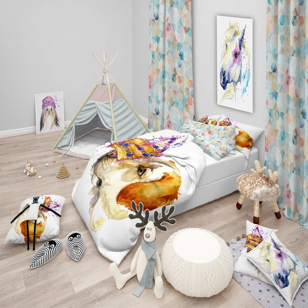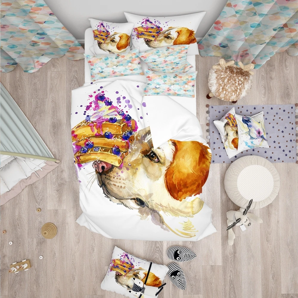 Bring a touch of charm to your bedroom with this Modern & Contemporary bedding set featuring a cute Labrador dog in watercolor. The vibrant colors are printed using High Density Italian Ink, creating a luxurious and inviting look. Made of 100% microfiber polyester, this set is ultra-soft, lightweight, and wrinkle-resistant, ensuring you have a comfortable night's sleep. The set includes a duvet cover and two shams, available in twin, queen, and king sizes. With its trendy and fun design, this Animal Print Bedding Set is the perfect way to update your space.Features: High Density Italian Ink creates extra vibrant colors Made of ultra-soft, lightweight 100% microfiber polyester Includes one duvet cover and two standard pillow shams Trendy and fun design to brighten up your bedroom Made Free Shipping Over $49.99* Details Designart 'Cute Labrador Dog Watercolor' Modern & Contemporary Bedding Set - Product Description: Bring a touch of charm to your bedroom with this Modern & Contemporary bedding set featuring a cute Labrador dog in watercolor. The vibrant colors are printed using High Density Italian Ink, creating a luxurious and inviting look. Made of 100% microfiber polyester, this set is ultra-soft, lightweight, and wrinkle-resistant, ensuring you have a comfortable night's sleep. The set includes a duvet cover and two shams, available in twin, queen, and king sizes. With its trendy and fun design, this Animal Print Bedding Set is the perfect way to update your space. Features: High Density Italian Ink creates extra vibrant colors Made of ultra-soft, lightweight 100% microfiber polyester Includes one duvet cover and two standard pillow shams Trendy and fun design to brighten up your bedroom Made in Canada Comforter and pillow inserts are not included Other Details: MaterialPolyester PatternAnimal Print ColorGold StyleAnimal Print, Modern & Contemporary, Animals ReversibleNo King: 1 Duvet Cover104 inches wide x 88 inches long 2 King Shams20 inches wide x 36 inches long Queen: 1 Duvet Cover88 inches wide x 88 inches long 2 Standard Shams16 inches wide x 26 inches long Twin: 1 Duvet Cover68 inches wide x 88 inches long 1 Standard Sham16 inches wide x 26 inches long Care Instructions: Machine wash on cold gentle cycle. Wash separately on first wash. Use only non-chlorine bleach when needed. Tumble dry low. Remove promptly.