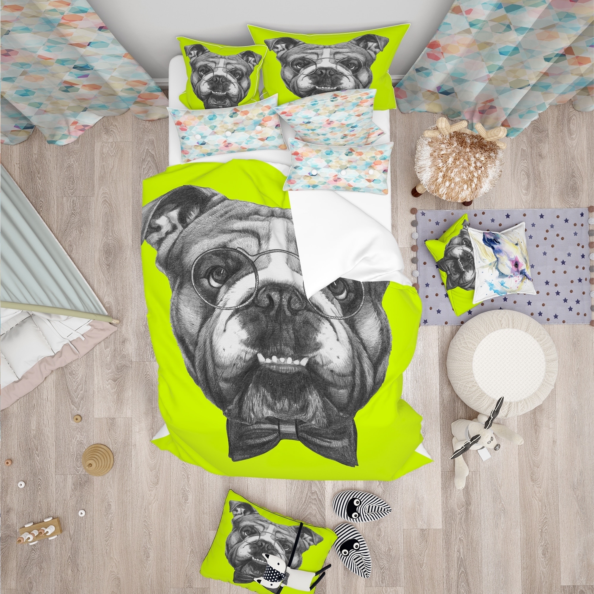 Bring some fun and personality to your bedroom with this Modern & Contemporary bedding set featuring an adorable English Bulldog wearing a bow tie. Made with high density Italian ink and 100% microfiber polyester, this set is both vibrant and ultra-soft, ensuring a comfortable night's sleep. The Animal Print set includes one duvet cover and two shams, available in twin, queen, and king sizes. Plus, it's wrinkle resistant and odorless, making it the perfect addition to any bedroom.Features: High density Italian ink for extra vibrant colors Ultra-soft, lightweight 100% microfiber polyester One bed cover and two standard pillow shams included for a complete look Trendy and fun animal print design Made in Canada Comforter and pillow inserts not includedAdditional Sections: Available in Free Shipping Over $49.99* Details Designart 'English Bulldog with Bow Tie' Modern & Contemporary Bedding Set - Product Description: Bring some fun and personality to your bedroom with this Modern & Contemporary bedding set featuring an adorable English Bulldog wearing a bow tie. Made with high density Italian ink and 100% microfiber polyester, this set is both vibrant and ultra-soft, ensuring a comfortable night's sleep. The Animal Print set includes one duvet cover and two shams, available in twin, queen, and king sizes. Plus, it's wrinkle resistant and odorless, making it the perfect addition to any bedroom. Features: High density Italian ink for extra vibrant colors Ultra-soft, lightweight 100% microfiber polyester One bed cover and two standard pillow shams included for a complete look Trendy and fun animal print design Made in Canada Comforter and pillow inserts not included Additional Sections: Available in twin, queen, and king sizes Decorative wall art and throw pillows matching this set are sold separately Machine washable on cold gentle cycle, tumble dry low
