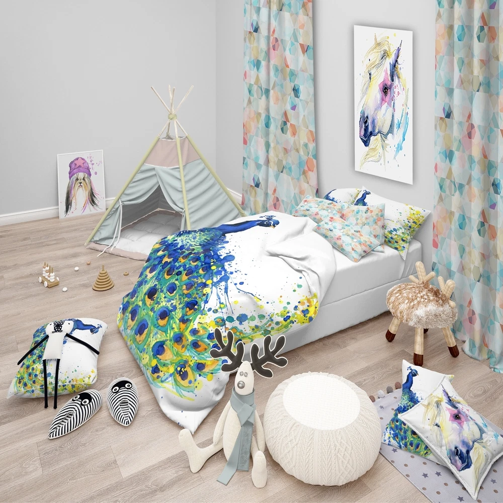 Bring a touch of nature into your bedroom with the Designart 'Exotic Peacock Watercolor' Modern & Contemporary Bedding Set. Featuring a luxurious animal print design created with high density Italian ink, this set is made with ultra-soft, wrinkle-resistant 100% microfiber polyester for a comfortable night's sleep. Available in twin, queen, and king sizes, it includes one duvet cover and two shams to create a complete and stylish look. The elegant and soft colors add a trendy and fun touch to your decor. Made in Canada.Features: Printed with High Density Italian Ink for extra vibrant colors Made from ultra-soft, lightweight 100% microfiber polyester Includes one bed cover and two standard pillow shams Trendy and fun soft colors to brighten and update your bedroom Made in Free Shipping Over $49.99* Details Designart 'Exotic Peacock Watercolor' Modern & Contemporary Bedding Set - Duvet Product Description: Bring a touch of nature into your bedroom with the Designart 'Exotic Peacock Watercolor' Modern & Contemporary Bedding Set. Featuring a luxurious animal print design created with high density Italian ink, this set is made with ultra-soft, wrinkle-resistant 100% microfiber polyester for a comfortable night's sleep. Available in twin, queen, and king sizes, it includes one duvet cover and two shams to create a complete and stylish look. The elegant and soft colors add a trendy and fun touch to your decor. Made in Canada. Features: Printed with High Density Italian Ink for extra vibrant colors Made from ultra-soft, lightweight 100% microfiber polyester Includes one bed cover and two standard pillow shams Trendy and fun soft colors to brighten and update your bedroom Made in Canada Dimensions: King1 Duvet Cover104 inches wide x 88 inches long, 2 King Shams20 inches wide x 36 inches long Queen1 Duvet Cover88 inches wide x 88 inches long, 2 Standard Shams16 inches wide x 26 inches long Twin1 Duvet Cover68 inches wide x 88 inches long, 1 Standard Sham16 inches wide x 26 inches long Product Details: MaterialPolyester PatternAnimal Print ColorBlue StyleAnimal Print, Modern & Contemporary, Animals ReversibleNo Directions: Machine wash on cold gentle cycle. Wash separately on first wash. Use only non-chlorine bleach when needed. Tumble dry low. Remove promptly.