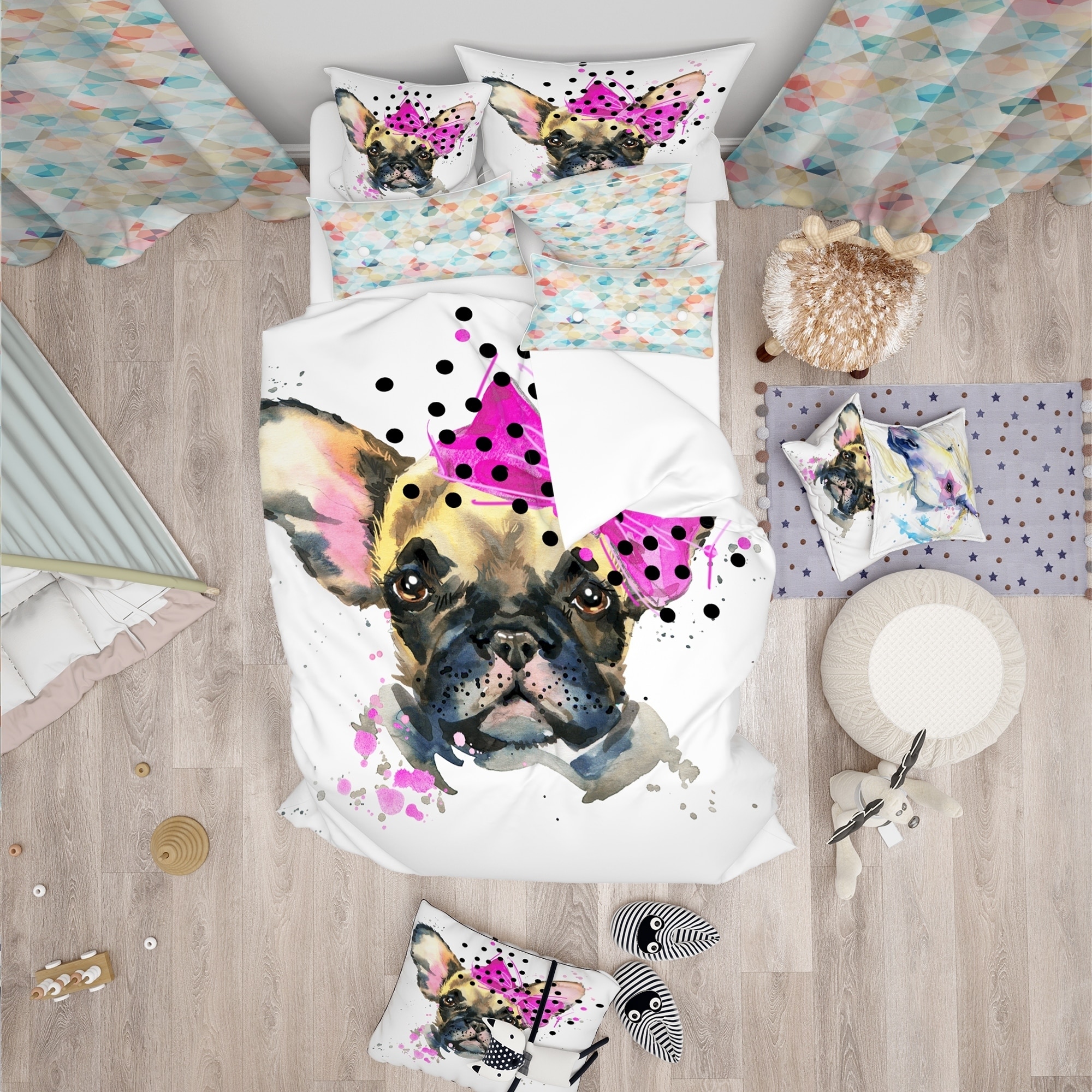 Thrill a young animal lover by decorating her bedroom with this bedding set featuring a large-scale image of a French bulldog. This charming ensemble includes a duvet cover and pillow shams for a fully coordinated look. Made from microfiber for outstanding softness, this set is machine-washable and wrinkle-resistant for easy care. Free Shipping Over $49.99* Details Designart 'Fashionable French Bulldog' Modern & Contemporary Bedding Set - Duvet Product Description: Thrill a young animal lover by decorating her bedroom with this bedding set featuring a large-scale image of a French bulldog. This charming ensemble includes a duvet cover and pillow shams for a fully coordinated look. Made from microfiber for outstanding softness, this set is machine-washable and wrinkle-resistant for easy care.