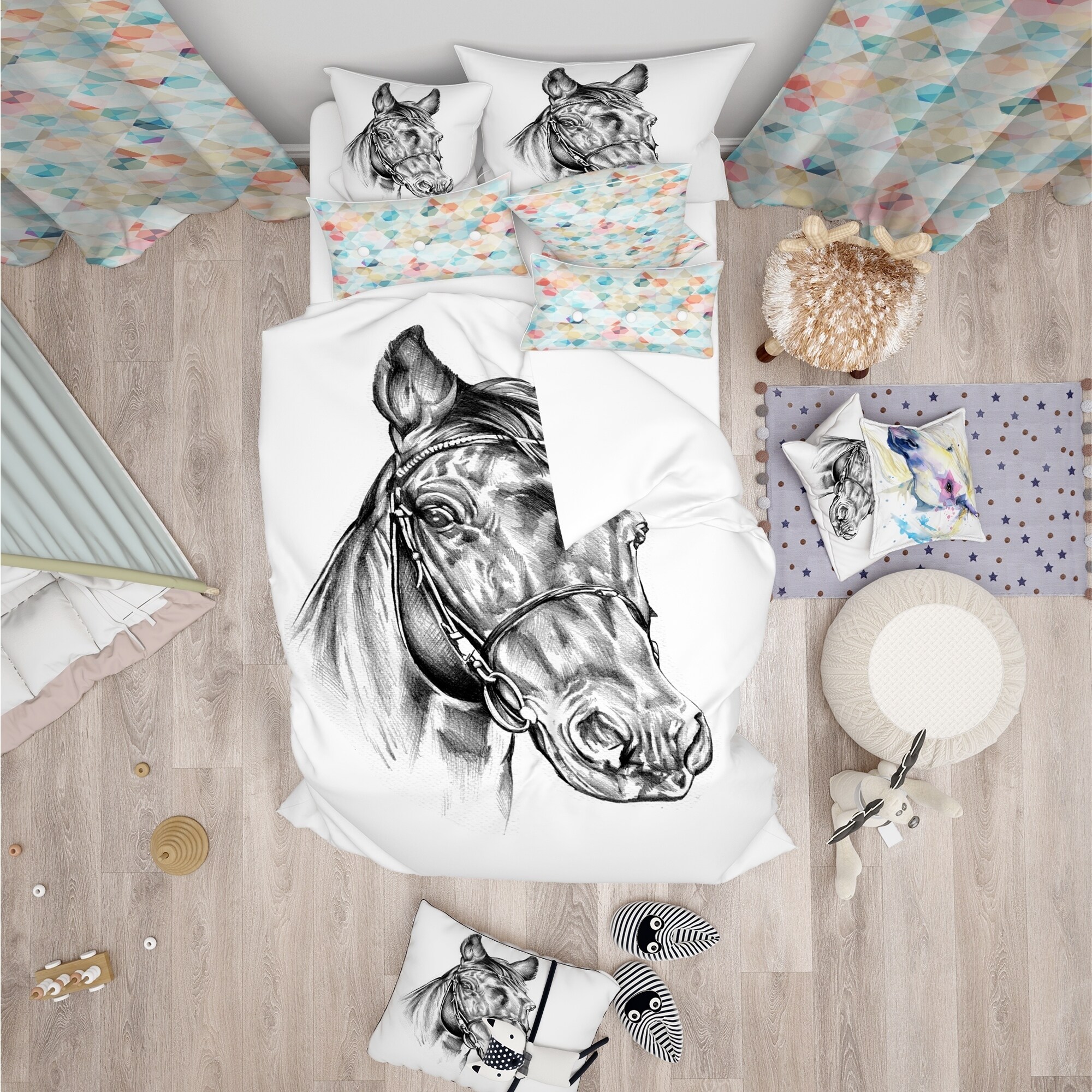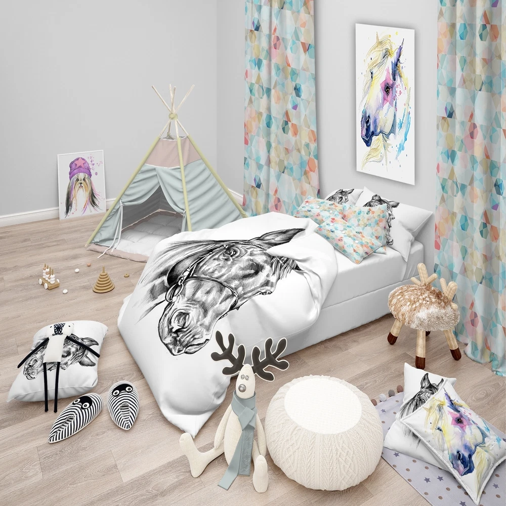 Bring a touch of nature into your bedroom with this Designart 'Freehand Horse Head Pencil Drawing' Animal Bedding Set. The beautiful horse head design is printed with high density Italian ink, making the colors extra vibrant. Made from ultra-soft, lightweight 100% microfiber polyester, this bedding set ensures a comfortable and cozy sleep all night long. The set includes one duvet cover and two pillow shams, making it a complete and stylish look for any bedroom. Available in twin, queen, and king sizes, this animal print bedding set is perfect for any animal or nature lover.Features: High density Italian ink for extra vibrant colors Ultra-soft, lightweight 100% microfiber polyester for a comfortable sleep Set includes one duvet cover and two pillow shams Trendy and fun colors to Free Shipping Over $49.99* Details Designart 'Freehand Horse Head Pencil Drawing' Animal Bedding Set - Duvet Cover Product Description: Bring a touch of nature into your bedroom with this Designart 'Freehand Horse Head Pencil Drawing' Animal Bedding Set. The beautiful horse head design is printed with high density Italian ink, making the colors extra vibrant. Made from ultra-soft, lightweight 100% microfiber polyester, this bedding set ensures a comfortable and cozy sleep all night long. The set includes one duvet cover and two pillow shams, making it a complete and stylish look for any bedroom. Available in twin, queen, and king sizes, this animal print bedding set is perfect for any animal or nature lover. Features: High density Italian ink for extra vibrant colors Ultra-soft, lightweight 100% microfiber polyester for a comfortable sleep Set includes one duvet cover and two pillow shams Trendy and fun colors to brighten and update your bedroom Made in Canada Comforter and pillow inserts not included Wrinkle resistant fabric Dimensions: King1 Duvet Cover - 104 inches wide x 88 inches long, 2 King Shams - 20 inches wide x 36 inches long Queen1 Duvet Cover - 88 inches wide x 88 inches long, 2 Standard Shams - 16 inches wide x 26 inches long Twin1 Duvet Cover - 68 inches wide x 88 inches long, 1 Standard Sham - 16 inches wide x 26 inches long Product Details: MaterialPolyester PatternAnimal Print ColorWhite StyleCabin & Lodge Wildlife, Rustic, Animals ReversibleNo Directions: Machine wash on cold gentle cycle. Wash separately on first wash. Use only non-chlorine bleach when needed. Tumble dry low. Remove promptly.