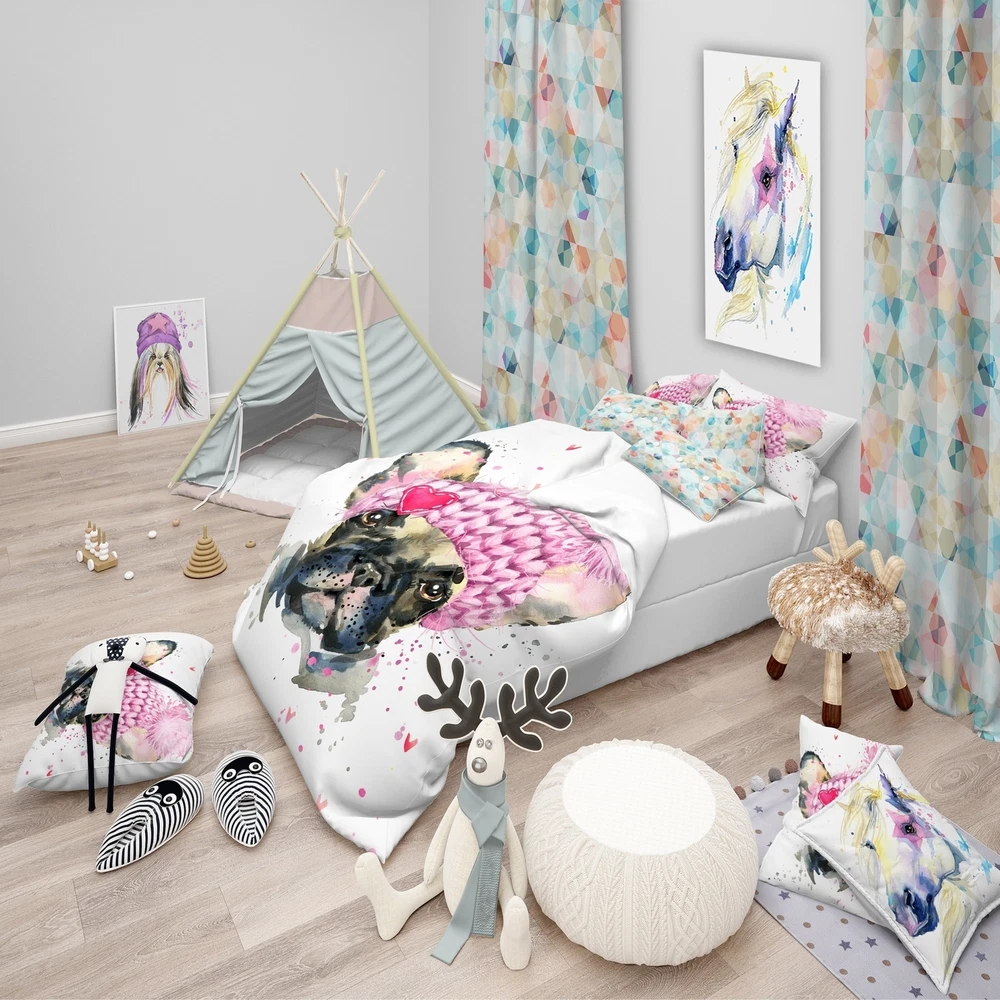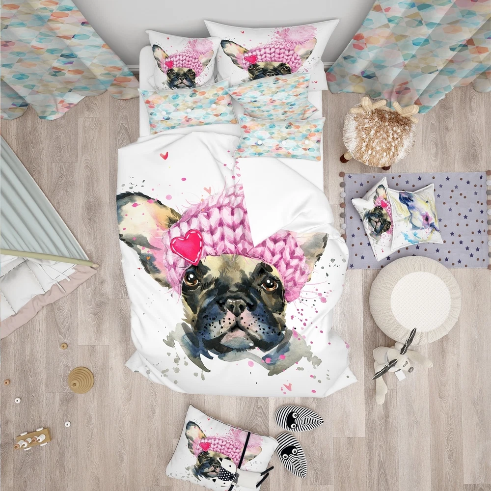 Bring a touch of whimsy to your bedroom with this Modern & Contemporary bedding set featuring a French Bulldog wearing a pink hat. Printed with high density Italian ink, the vibrant colors of this Animals bed design pop against the 100% microfiber polyester fabric, making it both soft and durable. The set includes one duvet cover and two shams, available in twin, queen, and king sizes. This Animal Print Bedding Set is perfect for adding a playful touch to any bedroom decor.Features: Printed using High Density Italian Ink for extra vibrant colors Made from ultra-soft, lightweight 100% microfiber polyester Wrinkle-resistant fabric with down-like comfort and no odor Includes one bed cover and two standard pillow shams for a complete look Trendy and fun colors to brighten up your bedroom Free Shipping Over $49.99* Details Designart 'French Bulldog with Pink Hat' Modern & Contemporary Bedding Set - Product Description: Bring a touch of whimsy to your bedroom with this Modern & Contemporary bedding set featuring a French Bulldog wearing a pink hat. Printed with high density Italian ink, the vibrant colors of this Animals bed design pop against the 100% microfiber polyester fabric, making it both soft and durable. The set includes one duvet cover and two shams, available in twin, queen, and king sizes. This Animal Print Bedding Set is perfect for adding a playful touch to any bedroom decor. Features: Printed using High Density Italian Ink for extra vibrant colors Made from ultra-soft, lightweight 100% microfiber polyester Wrinkle-resistant fabric with down-like comfort and no odor Includes one bed cover and two standard pillow shams for a complete look Trendy and fun colors to brighten up your bedroom Made in Canada Matching decorative wall art and throw pillows available (sold separately) Comforter insert and pillow inserts not included Other Details: MaterialPolyester PatternAnimal Print ColorPink StyleAnimal Print, Modern & Contemporary, Animals ReversibleNo King: Duvet Cover104 inches wide x 88 inches long King Shams20 inches wide x 36 inches long (x2) Queen: Duvet Cover88 inches wide x 88 inches long Standard Shams16 inches wide x 26 inches long (x2) Twin: Duvet Cover68 inches wide x 88 inches long Standard Sham16 inches wide x 26 inches long Care Instructions: Machine wash on cold gentle cycle. Wash separately on first wash. Use only non-chlorine bleach when needed. Tumble dry low. Remove promptly.