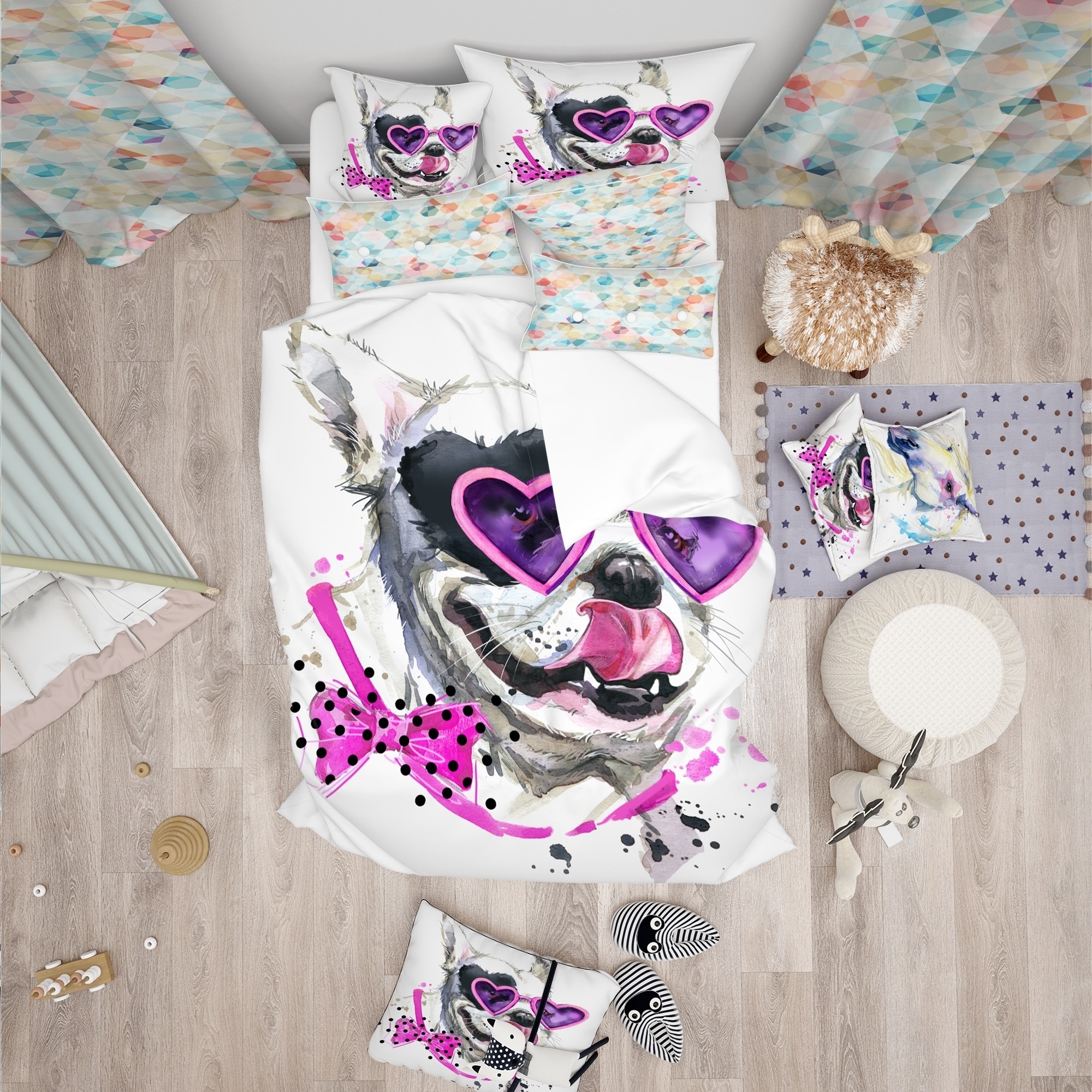 Add a touch of fun and personality to your bedroom with the Designart 'Funny Dog with Heart Glasses' Modern & Contemporary Bedding Set. Featuring a vibrant and colorful animal print design printed using high density Italian ink, this bedding set is made from ultra-soft, lightweight 100% microfiber polyester to ensure a comfortable and relaxing sleep. The set includes one duvet cover and two pillow shams, with twin, queen, and king sizes available. Decorative wall art and throw pillows are also available to match this set, sold separately.Features: High-density Italian ink creates extra vibrant colors Ultra-soft, lightweight 100% microfiber polyester fabric that is wrinkle-resistant and odorless for a down-like comfort Includes one duvet cover and two pillow shams to complete the look of Free Shipping Over $49.99* Details Designart 'Funny Dog with Heart Glasses' Modern & Contemporary Bedding Set - Product Description: Add a touch of fun and personality to your bedroom with the Designart 'Funny Dog with Heart Glasses' Modern & Contemporary Bedding Set. Featuring a vibrant and colorful animal print design printed using high density Italian ink, this bedding set is made from ultra-soft, lightweight 100% microfiber polyester to ensure a comfortable and relaxing sleep. The set includes one duvet cover and two pillow shams, with twin, queen, and king sizes available. Decorative wall art and throw pillows are also available to match this set, sold separately. Features: High-density Italian ink creates extra vibrant colors Ultra-soft, lightweight 100% microfiber polyester fabric that is wrinkle-resistant and odorless for a down-like comfort Includes one duvet cover and two pillow shams to complete the look of your bed Trendy and fun design to brighten your bedroom Made in Canada Product Details: MaterialPolyester PatternAnimal Print ColorWhite StyleAnimal Print, Modern & Contemporary, Animals ReversibleNo King: 1 Duvet Cover104 inches wide x 88 inches long 2 King Shams20 inches wide x 36 inches long Queen: 1 Duvet Cover88 inches wide x 88 inches long 2 Standard Shams16 inches wide x 26 inches long Twin: 1 Duvet Cover68 inches wide x 88 inches long 1 Standard Sham16 inches wide x 26 inches long Directions: Machine wash on cold gentle cycle. Wash separately on first wash. Use only non-chlorine bleach when needed. Tumble dry low. Remove promptly.
