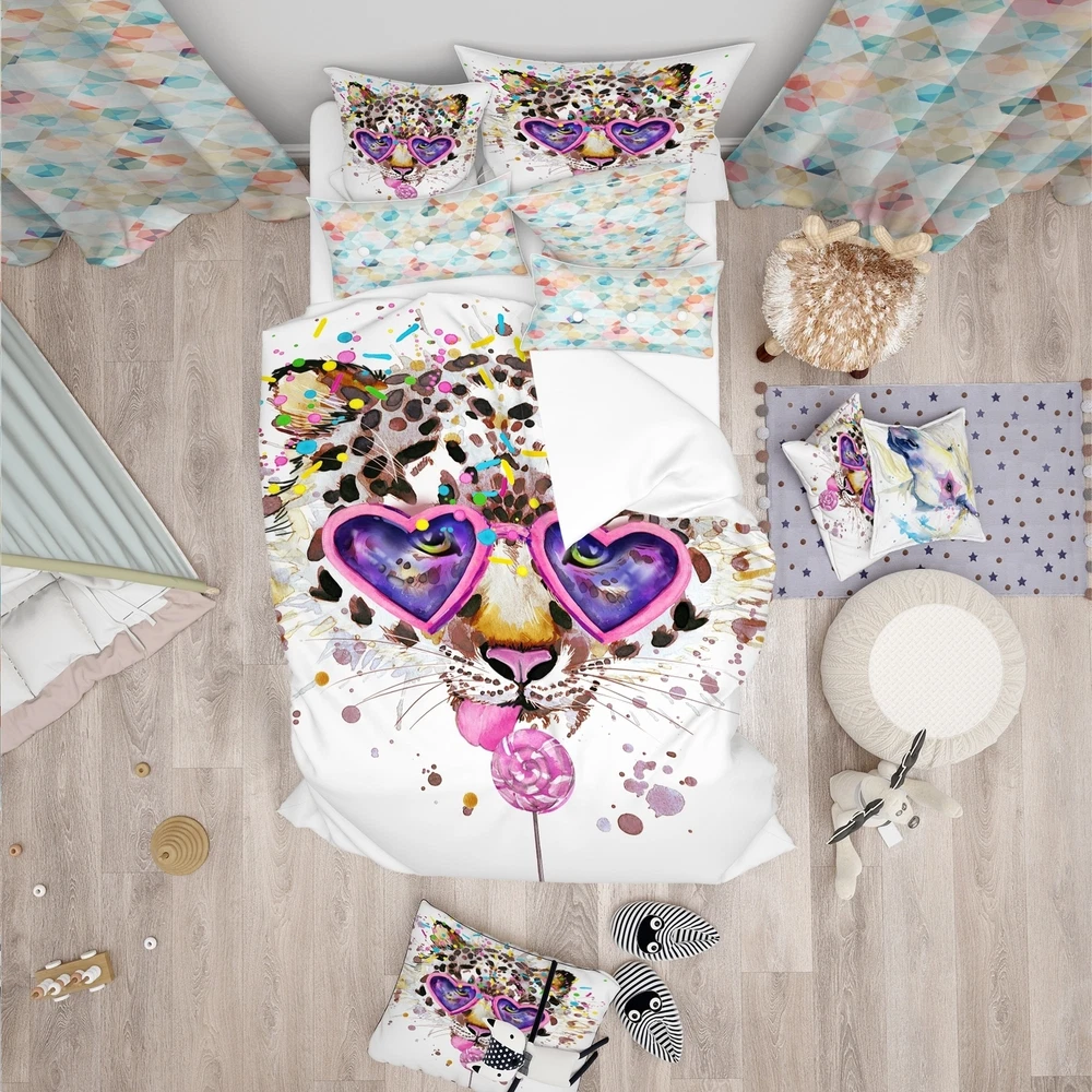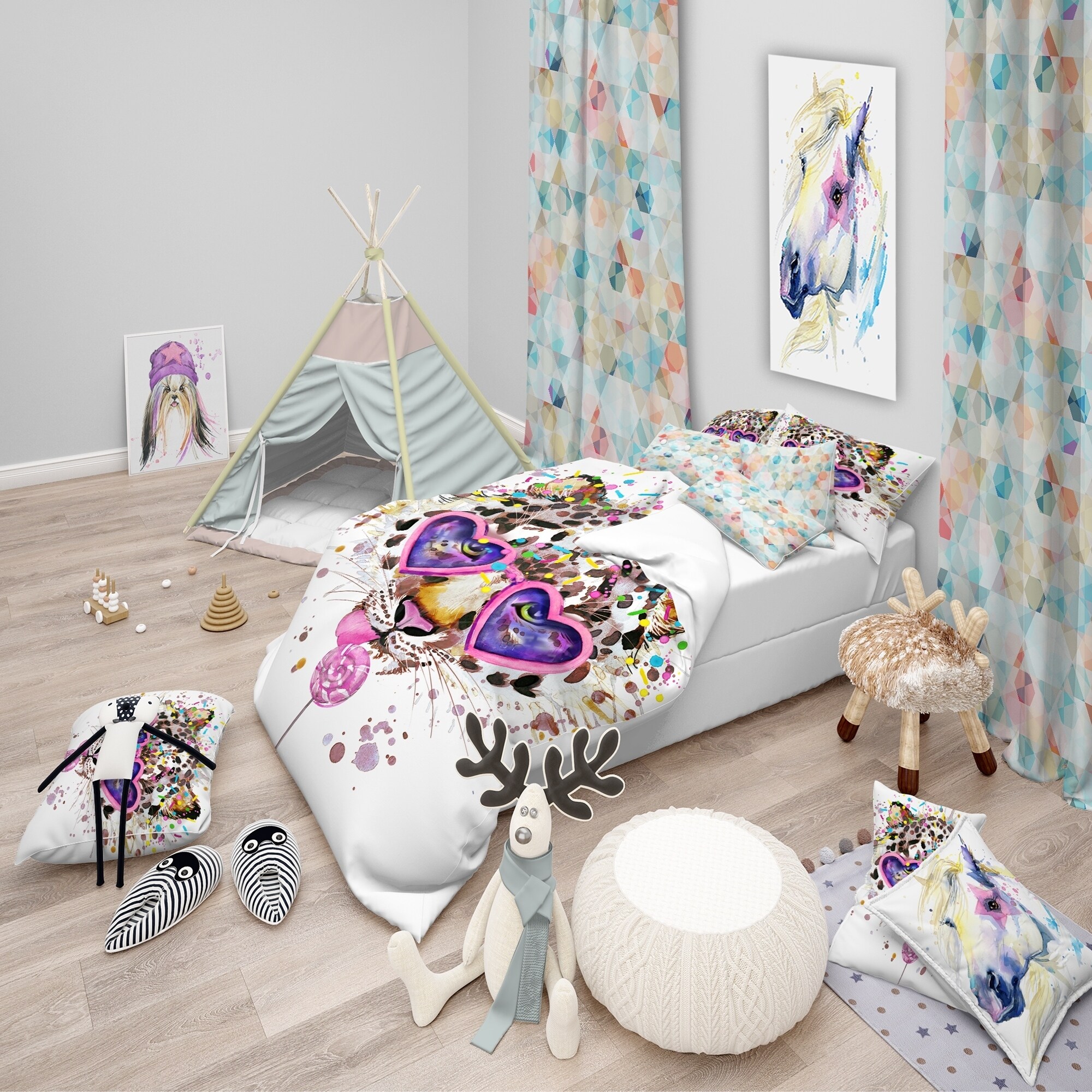 Bring a touch of fun and style to your bedroom with the Designart 'Funny Leopard with Heart Glasses' Tropical Bedding Set. Printed using high-density Italian ink, this Animals bed set features vibrant colors that won't fade over time. Made with 100% microfiber polyester, this Wildlife set is ultra-soft, lightweight, and wrinkle-resistant, ensuring you sleep comfortably all night long. The set includes one bed cover and two pillow shams, available in twin, queen, and king sizes. This Wildlife Bedding Set is the perfect addition to your bedroom decor, adding a trendy and fun touch.Features: High-density Italian ink for extra vibrant colors Ultra-soft, lightweight 100% microfiber polyester Set includes one bed cover and two pillow shams Trendy and fun design to update your bedroom Made Free Shipping Over $49.99* Details Designart 'Funny Leopard with Heart Glasses' Tropical Bedding Set - Duvet Cover Product Description: Bring a touch of fun and style to your bedroom with the Designart 'Funny Leopard with Heart Glasses' Tropical Bedding Set. Printed using high-density Italian ink, this Animals bed set features vibrant colors that won't fade over time. Made with 100% microfiber polyester, this Wildlife set is ultra-soft, lightweight, and wrinkle-resistant, ensuring you sleep comfortably all night long. The set includes one bed cover and two pillow shams, available in twin, queen, and king sizes. This Wildlife Bedding Set is the perfect addition to your bedroom decor, adding a trendy and fun touch. Features: High-density Italian ink for extra vibrant colors Ultra-soft, lightweight 100% microfiber polyester Set includes one bed cover and two pillow shams Trendy and fun design to update your bedroom Made in Canada Comforter and pillow inserts not included Machine washable for easy care Dimensions: King1 Duvet Cover 104" x 88", 2 King Shams 20" x 36" Queen1 Duvet Cover 88" x 88", 2 Standard Shams 16" x 26" Twin1 Duvet Cover 68" x 88", 1 Standard Sham 16" x 26" Product Details: MaterialPolyester PatternWildlife ColorPink StyleWildlife, Tropical, Animals ReversibleNo Directions: Machine wash on cold gentle cycle. Wash separately on first wash. Use only non-chlorine bleach when needed. Tumble dry low. Remove promptly.