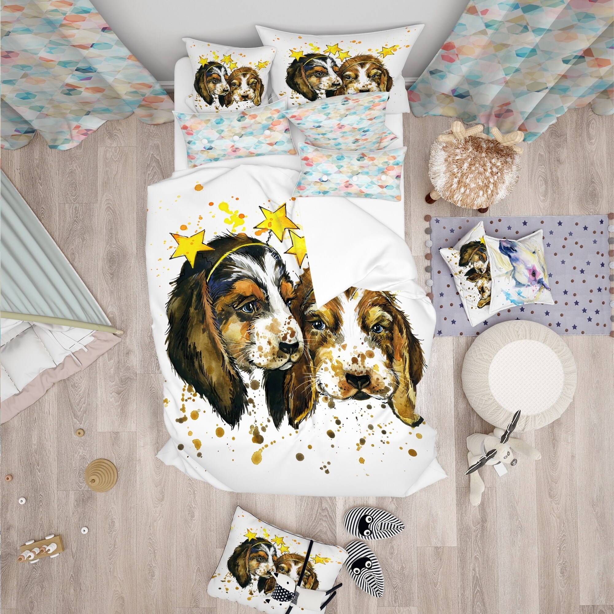 Elevate the comfort and style of your bedroom with this Modern & Contemporary Bedding Set featuring an adorable Funny Puppy Dogs Watercolor design. Made with the highest quality Italian ink and ultra-soft 100% microfiber polyester, this set includes a duvet cover and two shams for a complete and stylish look. The wrinkle resistant fabric is both lightweight and comfortable, while the elegant and soft colors add a trendy and fun touch to your decor. Available in twin, queen, and king sizes, this Animal Print set is perfect for any already decorated space.Features: High Density Italian Ink produces vibrant colors 100% microfiber polyester for ultimate softness and comfort Includes one bed cover and two standard pillow shams Trendy and fun design to brighten up your bedroom Made in Free Shipping Over $49.99* Details Designart 'Funny Puppy Dogs Watercolor' Modern & Contemporary Bedding Set - Product Description: Elevate the comfort and style of your bedroom with this Modern & Contemporary Bedding Set featuring an adorable Funny Puppy Dogs Watercolor design. Made with the highest quality Italian ink and ultra-soft 100% microfiber polyester, this set includes a duvet cover and two shams for a complete and stylish look. The wrinkle resistant fabric is both lightweight and comfortable, while the elegant and soft colors add a trendy and fun touch to your decor. Available in twin, queen, and king sizes, this Animal Print set is perfect for any already decorated space. Features: High Density Italian Ink produces vibrant colors 100% microfiber polyester for ultimate softness and comfort Includes one bed cover and two standard pillow shams Trendy and fun design to brighten up your bedroom Made in Canada Comforter insert and pillow cases not included Other details: Available in twin, queen, and king sizes MaterialPolyester PatternAnimal Print ColorBrown StyleAnimal Print, Modern & Contemporary, Animals ReversibleNo Dimensions: King1 Duvet Cover104 inches wide x 88 inches long, 2 King Shams20 inches wide x 36 inches long Queen1 Duvet Cover88 inches wide x 88 inches long, 2 Standard Shams16 inches wide x 26 inches long Twin1 Duvet Cover68 inches wide x 88 inches long, 1 Standard Sham16 inches wide x 26 inches long Care instructions: Machine wash on cold gentle cycle. Wash separately on first wash. Use only non- chlorine bleach when needed. Tumble dry low. Remove promptly.