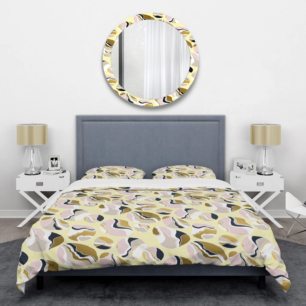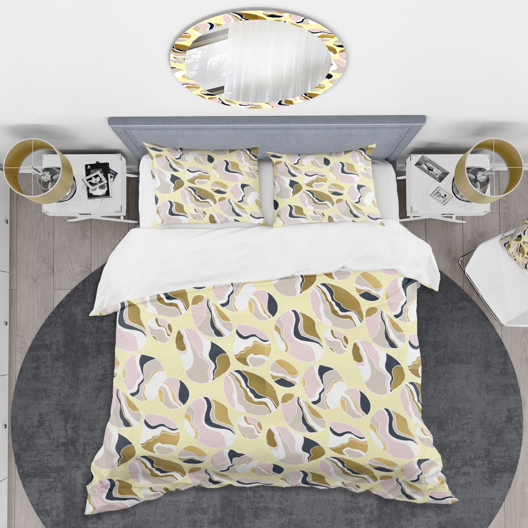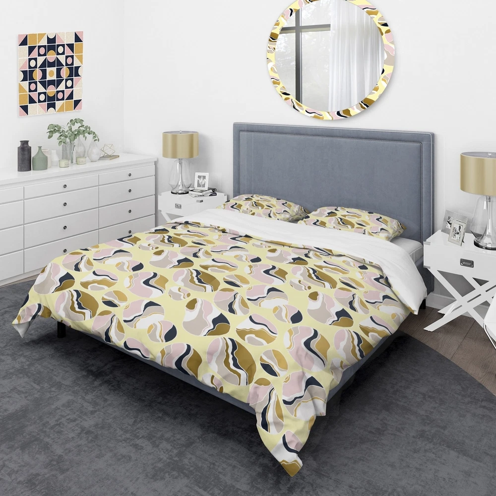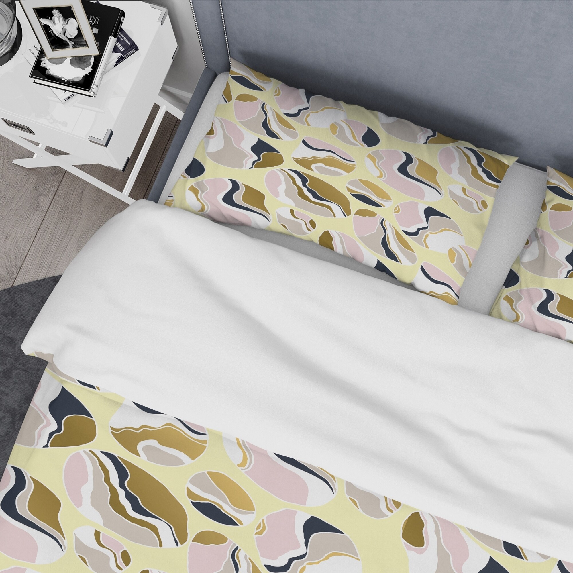 Indulge in the luxurious comfort of this Mid-Century Modern duvet cover set featuring an abstract design of golden river stones. Printed with high density Italian ink and made with the softest materials, this bedding set is perfect for sprucing up your bedroom while ensuring a good night's sleep. The set includes one duvet cover and two shams made of 100% microfiber polyester, which is ultra-soft and wrinkle-resistant. Available in twin, queen, and king sizes, this set is a stylish addition to any already decorated space.Features: Vibrant colors printed with high density Italian ink Made of ultra-soft, lightweight 100% microfiber polyester Includes one duvet cover and two standard pillow shams Trendy and fun soft colors to brighten up your bedroom Made in Canada Comforter and pillow Free Shipping Over $49.99* Details Designart 'Golden River Stones' Mid-Century Duvet Cover Set Product Description: Indulge in the luxurious comfort of this Mid-Century Modern duvet cover set featuring an abstract design of golden river stones. Printed with high density Italian ink and made with the softest materials, this bedding set is perfect for sprucing up your bedroom while ensuring a good night's sleep. The set includes one duvet cover and two shams made of 100% microfiber polyester, which is ultra-soft and wrinkle-resistant. Available in twin, queen, and king sizes, this set is a stylish addition to any already decorated space. Features: Vibrant colors printed with high density Italian ink Made of ultra-soft, lightweight 100% microfiber polyester Includes one duvet cover and two standard pillow shams Trendy and fun soft colors to brighten up your bedroom Made in Canada Comforter and pillow inserts are not included Decorative wall art and matching throw pillows available but sold separately King: 1 Duvet Cover104 inches wide x 88 inches long 2 King Shams20 inches wide x 36 inches long Queen: 1 Duvet Cover88 inches wide x 88 inches long 2 Standard Shams16 inches wide x 26 inches long Twin: 1 Duvet Cover68 inches wide x 88 inches long 1 Standard Sham16 inches wide x 26 inches long Product Details: MaterialPolyester PatternAbstract ColorYellow StyleGlam Abstract, Mid-Century Modern, Abstract ReversibleNo Directions: Machine wash on cold gentle cycle. Wash separately on first wash. Use only non-chlorine bleach when needed. Tumble dry low. Remove promptly.