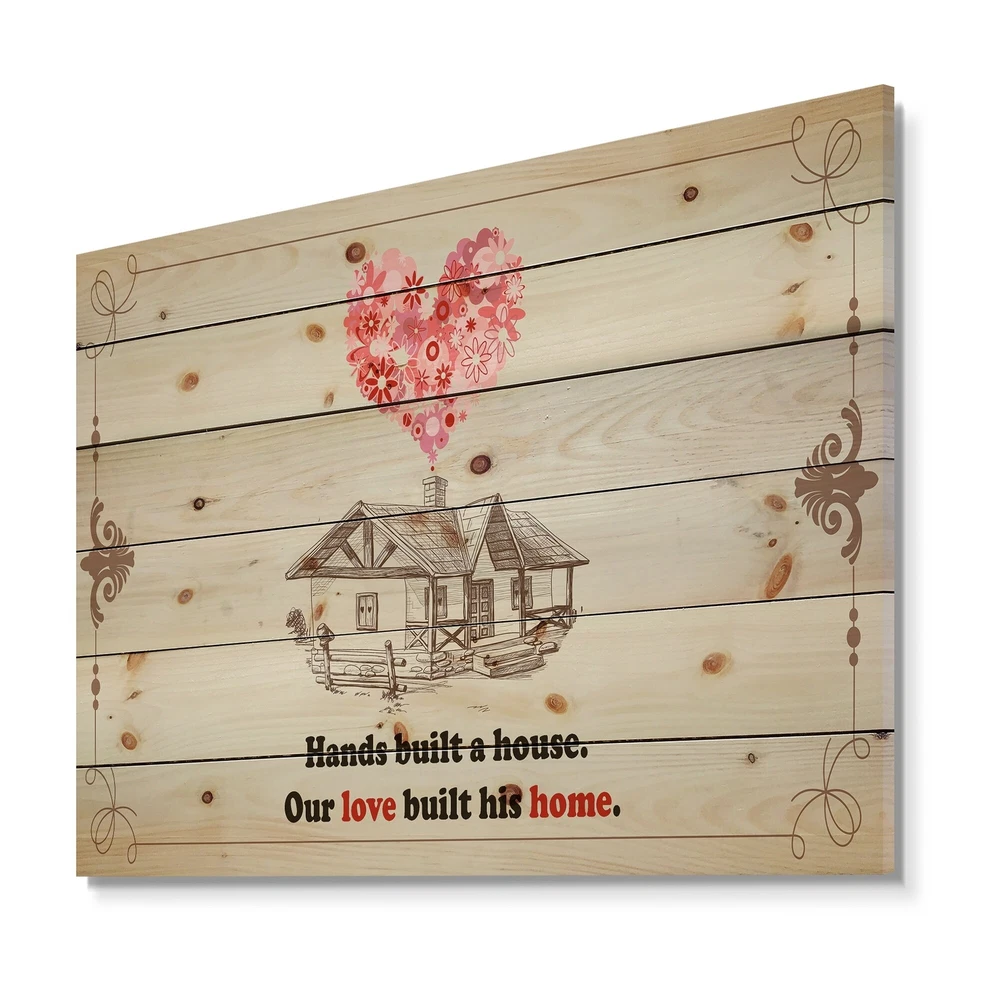 Greet your guests with this beautiful Entrance Wall Art to make them feel welcome. Once typically found only in rustic or farmhouse style decor settings, this Illustration wood wall art will easily fit into even the most contemporary of homes or offices.Using the highest quality 6 Color Canon UV Ink, this, this Vintage wood wall art incorporates several aspects of fine design into one stunning piece. With its slightly visible wood grain appearing through the colors and sleekly finished edges, it is a wonderful choice for any room in your home or office, being it a traditional or modern space. As each piece of wood has natural grain differences from the next, each of these wood wall arts is a truly unique addition to your space.Each Wood wall art is 100% handmade in Canada on Natural pine Free Shipping Over $49.99* Details Designart 'Hands built a house. Vintage Pink Heart ' Textual Entrance Art on Product Description: Greet your guests with this beautiful Entrance Wall Art to make them feel welcome. Once typically found only in rustic or farmhouse style decor settings, this Illustration wood wall art will easily fit into even the most contemporary of homes or offices. Using the highest quality 6 Color Canon UV Ink, this, this Vintage wood wall art incorporates several aspects of fine design into one stunning piece. With its slightly visible wood grain appearing through the colors and sleekly finished edges, it is a wonderful choice for any room in your home or office, being it a traditional or modern space. As each piece of wood has natural grain differences from the next, each of these wood wall arts is a truly unique addition to your space. Each Wood wall art is 100% handmade in Canada on Natural pine wood, using the highest quality ink which will not fade over time. Available in 3 Different sizes :20x10; 40x20; 40x30 - OrientationHorizontal - SubjectIllustration TypeWood Wall Art, Fine Art, Wood Fine Art, Print on Plaque - Arrives ready to hang on the wall with hanging kit included - MaterialMade with 100% natural pine wood - StyleVintage - Number of Pieces1 - SizeLarge, Medium, Small