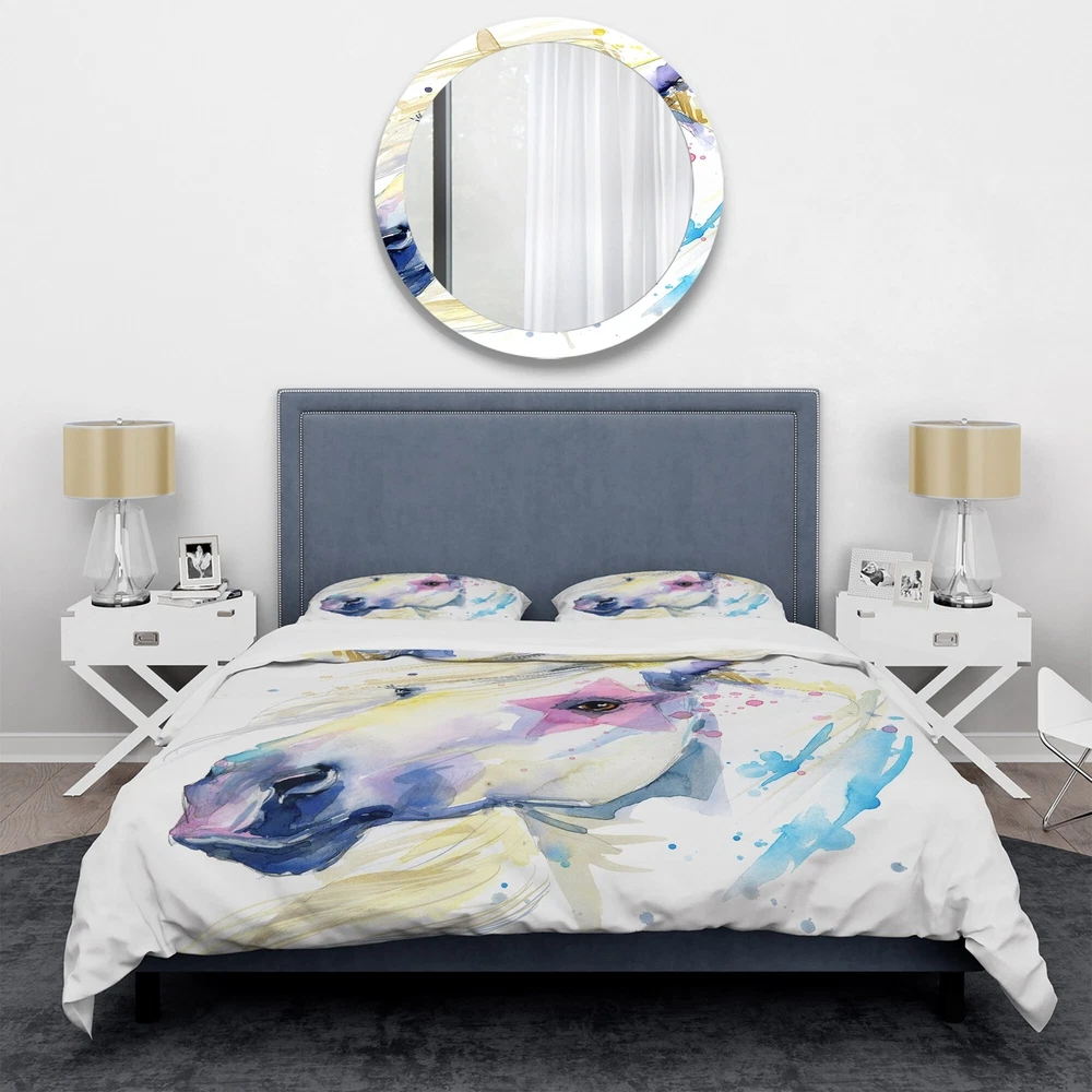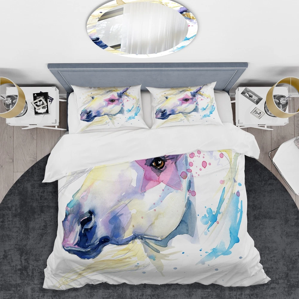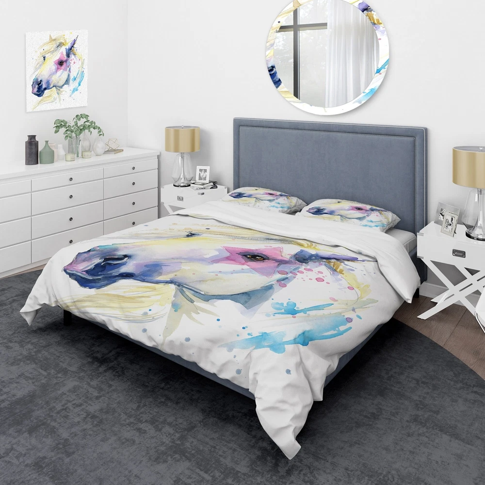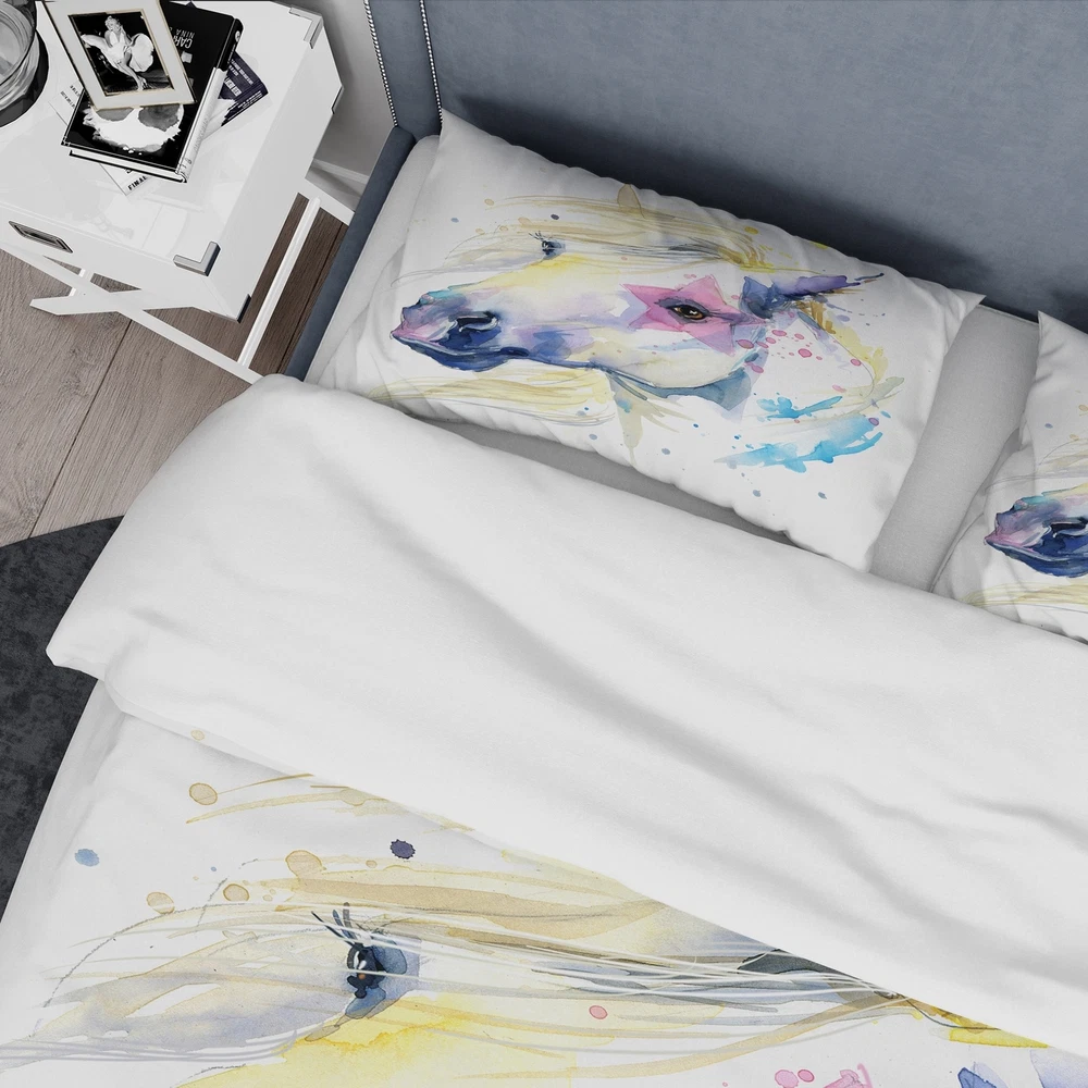 Delight the young equestrian in your family with this magical bedding set featuring a whimsical horse illustration. The wrinkle-resistant duvet cover and sham set are made from soft polyester microfiber that keeps her warm and cozy with down-like comfort. High-density Italian ink provides the vibrant color she loves in a machine-washable bedding set you appreciate. Free Shipping Over $49.99* Details Designart 'Horse Illustration with Splash' Modern & Contemporary Bedding Set - Product Description: Delight the young equestrian in your family with this magical bedding set featuring a whimsical horse illustration. The wrinkle-resistant duvet cover and sham set are made from soft polyester microfiber that keeps her warm and cozy with down-like comfort. High-density Italian ink provides the vibrant color she loves in a machine-washable bedding set you appreciate.