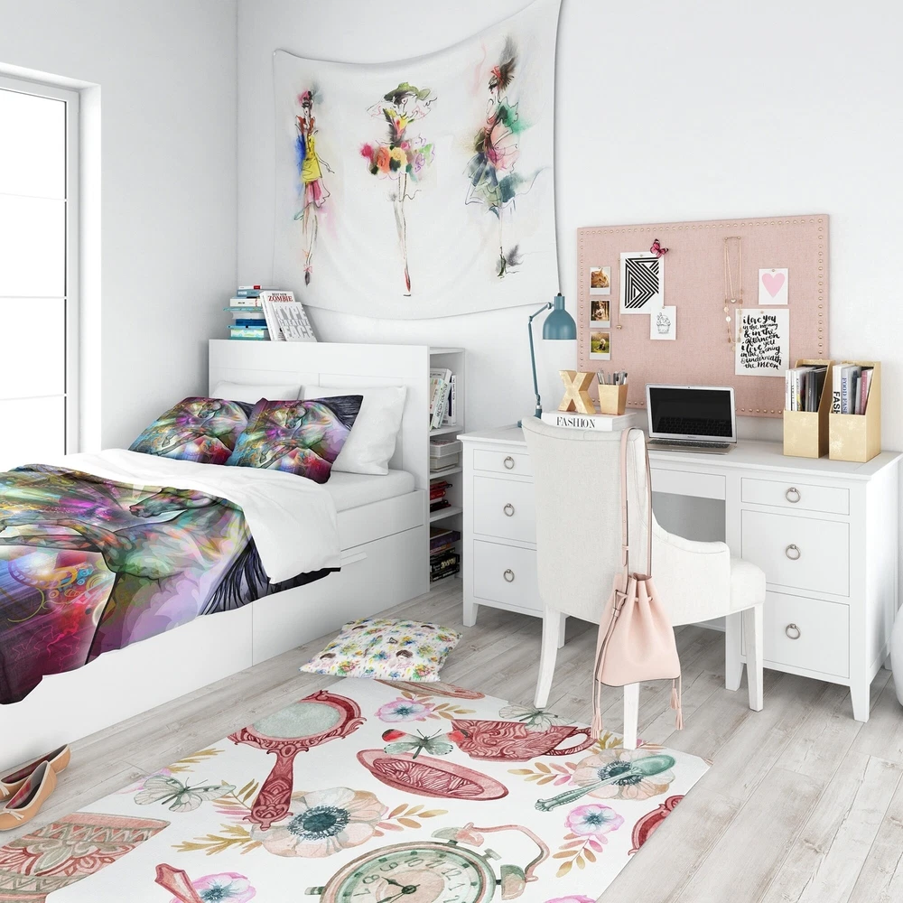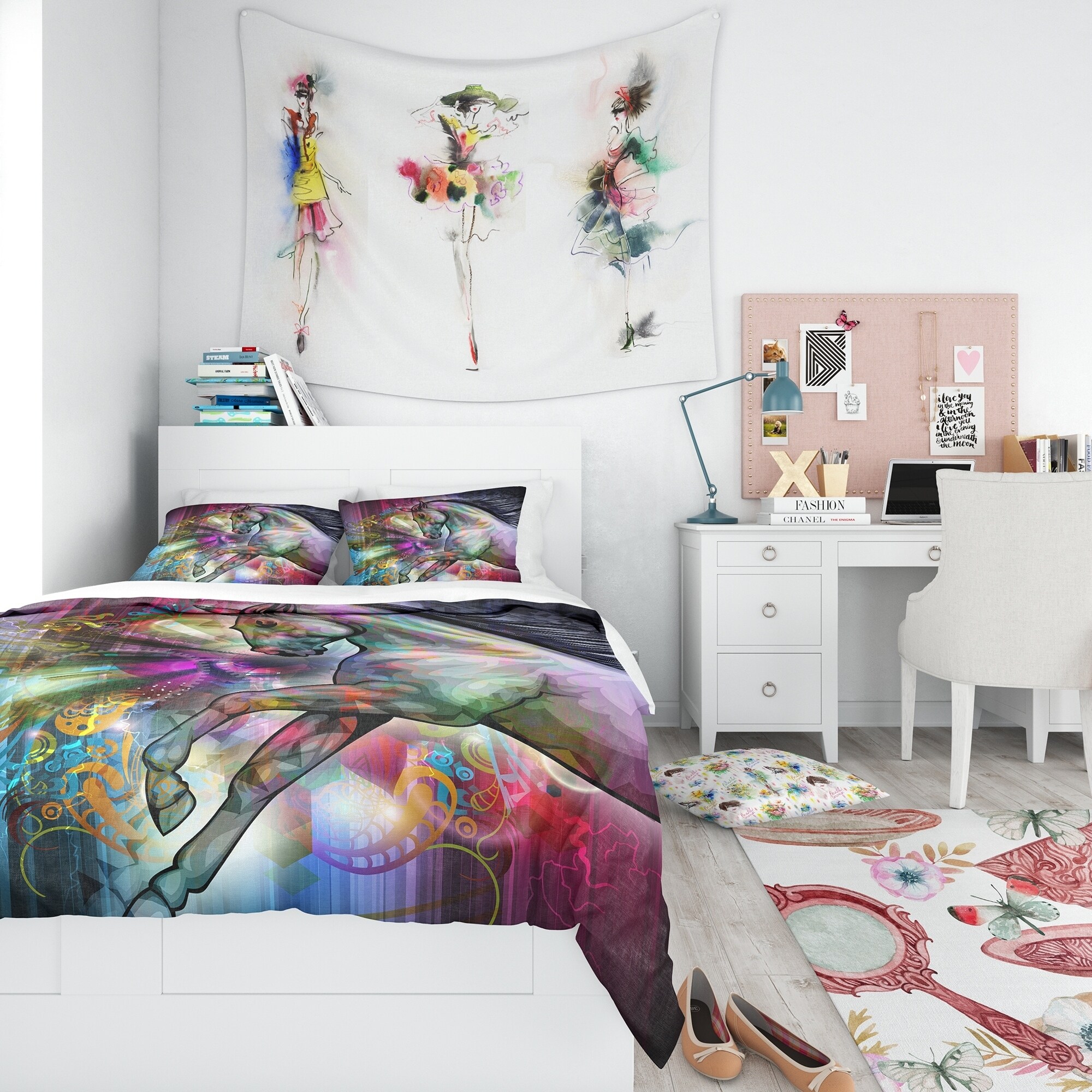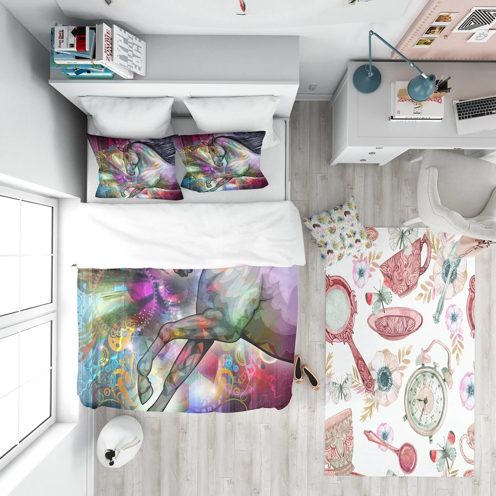 Create a colorful and inviting sleeping space with this Modern & Contemporary Horse Over Colorful Abstract Image bedding set from Designart. Made using high-density Italian ink, this Animals print bed set features rich colors that are sure to brighten up your bedroom. The ultra-soft and lightweight microfiber polyester fabric ensures that you sleep comfortably all night long. This luxurious bedding set includes one duvet cover and two shams, available in twin, queen, and king sizes. Plus, it's wrinkle-resistant, down-like comfort, and odorless.Features: Vibrant colors thanks to high-density Italian ink Ultra-soft and lightweight 100% microfiber polyester that's wrinkle-resistant and odorless Includes one duvet cover and two shams to create a complete and stylish look Trendy and fun Free Shipping Over $49.99* Details Designart 'Horse Over Colorful Abstract Image' Modern & Contemporary Bedding Set Product Description: Create a colorful and inviting sleeping space with this Modern & Contemporary Horse Over Colorful Abstract Image bedding set from Designart. Made using high-density Italian ink, this Animals print bed set features rich colors that are sure to brighten up your bedroom. The ultra-soft and lightweight microfiber polyester fabric ensures that you sleep comfortably all night long. This luxurious bedding set includes one duvet cover and two shams, available in twin, queen, and king sizes. Plus, it's wrinkle-resistant, down-like comfort, and odorless. Features: Vibrant colors thanks to high-density Italian ink Ultra-soft and lightweight 100% microfiber polyester that's wrinkle-resistant and odorless Includes one duvet cover and two shams to create a complete and stylish look Trendy and fun design to update your bedroom decor Made in Canada Comforter inserts and pillow inserts not included Other Details: MaterialPolyester PatternAnimal Print ColorPurple StyleAnimal Print, Modern & Contemporary, Animals ReversibleNo Dimensions: King1 Duvet Cover104 inches wide x 88 inches long; 2 King Shams20 inches wide x 36 inches long Queen1 Duvet Cover88 inches wide x 88 inches long; 2 Standard Shams16 inches wide x 26 inches long Twin1 Duvet Cover68 inches wide x 88 inches long; 1 Standard Sham16 inches wide x 26 inches long Care Instructions: Machine wash on cold gentle cycle. Wash separately on first wash. Use only non-chlorine bleach when needed. Tumble dry low. Remove promptly.