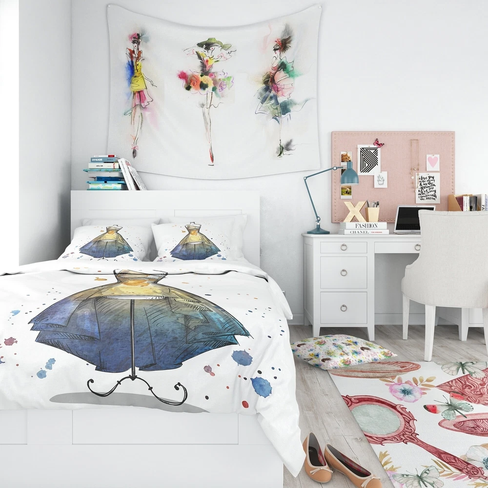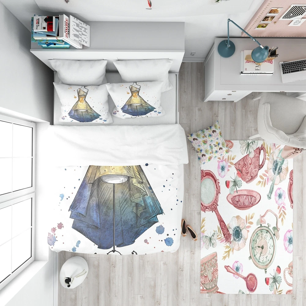 Spruce up your bedroom with this luxurious and comfortable Modern & Contemporary bedding set featuring the 'Mannequin with Long Dress' abstract design. Made from ultra-soft, wrinkle-resistant 100% microfiber polyester, this set includes one duvet cover and two shams, adding a stylish and trendy touch to your already decorated space. Printed using High Density Italian Ink, the colors are extra vibrant and the fabric is odorless, providing a down-like comfort. Available in twin, queen and king sizes, this set is machine washable for easy care.Features: Vibrant colors printed using High Density Italian Ink Made from ultra-soft, wrinkle-resistant 100% microfiber polyester Includes one duvet cover and two standard pillow shams Elegant and soft colors to brighten up your bedroom Made in Free Shipping Over $49.99* Details Designart 'Mannequin with Long Dress' Abstract Bedding Set - Duvet Cover & Shams Product Description: Spruce up your bedroom with this luxurious and comfortable Modern & Contemporary bedding set featuring the 'Mannequin with Long Dress' abstract design. Made from ultra-soft, wrinkle-resistant 100% microfiber polyester, this set includes one duvet cover and two shams, adding a stylish and trendy touch to your already decorated space. Printed using High Density Italian Ink, the colors are extra vibrant and the fabric is odorless, providing a down-like comfort. Available in twin, queen and king sizes, this set is machine washable for easy care. Features: Vibrant colors printed using High Density Italian Ink Made from ultra-soft, wrinkle-resistant 100% microfiber polyester Includes one duvet cover and two standard pillow shams Elegant and soft colors to brighten up your bedroom Made in Canada Comforter insert and pillow cases not included Decorative wall art and throw pillows to match available but sold separately Dimensions: King1 Duvet Cover (104" x 88") and 2 King Shams (20" x 36") Queen1 Duvet Cover (88" x 88") and 2 Standard Shams (16" x 26") Twin1 Duvet Cover (68" x 88") and 1 Standard Sham (16" x 26") Other Details: MaterialPolyester PatternAbstract ColorYellow StyleAbstract, Modern & Contemporary, People ReversibleNo Care Instructions: Machine wash on cold gentle cycle. Wash separately on first wash. Use only non-chlorine bleach when needed. Tumble dry low. Remove promptly.