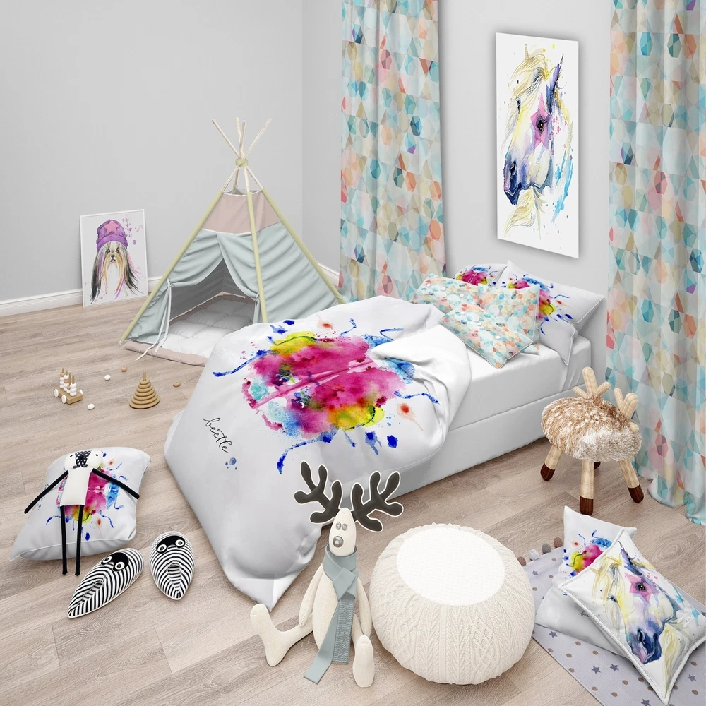 Transform your bedroom into a cozy and stylish sanctuary with this luxurious Animals Bedding Set. Made with the softest 100% microfiber polyester and printed using high-density Italian ink, this traditional bed set features a colorful beetle design that adds a touch of fun and brightness to your space. The wrinkle-resistant fabric ensures effortless maintenance and a comfortable sleep all night long. Available in twin, queen, and king sizes, this set includes one duvet cover and two shams to create a complete and elegant look.Features: Vibrant colors printed with high-density Italian ink Soft and lightweight 100% microfiber polyester for a comfortable sleep One bed cover and two standard pillow shams for a complete look Trendy yet elegant colors to spruce up your bedroom Made in Free Shipping Over $49.99* Details Designart 'Monotype color beetle' Animals Bedding Set - Duvet Cover & Shams Product Description: Transform your bedroom into a cozy and stylish sanctuary with this luxurious Animals Bedding Set. Made with the softest 100% microfiber polyester and printed using high-density Italian ink, this traditional bed set features a colorful beetle design that adds a touch of fun and brightness to your space. The wrinkle-resistant fabric ensures effortless maintenance and a comfortable sleep all night long. Available in twin, queen, and king sizes, this set includes one duvet cover and two shams to create a complete and elegant look. Features: Vibrant colors printed with high-density Italian ink Soft and lightweight 100% microfiber polyester for a comfortable sleep One bed cover and two standard pillow shams for a complete look Trendy yet elegant colors to spruce up your bedroom Made in Canada Comforter insert and pillow cases not included Other Sections: MaterialPolyester PatternAnimal Print ColorWhite StyleTraditional Wildlife, Traditional, Animals ReversibleNo Care InstructionsMachine washable on cold gentle cycle. Wash separately on the first wash. Use only non-chlorine bleach when needed. Tumble dry low. Remove promptly.