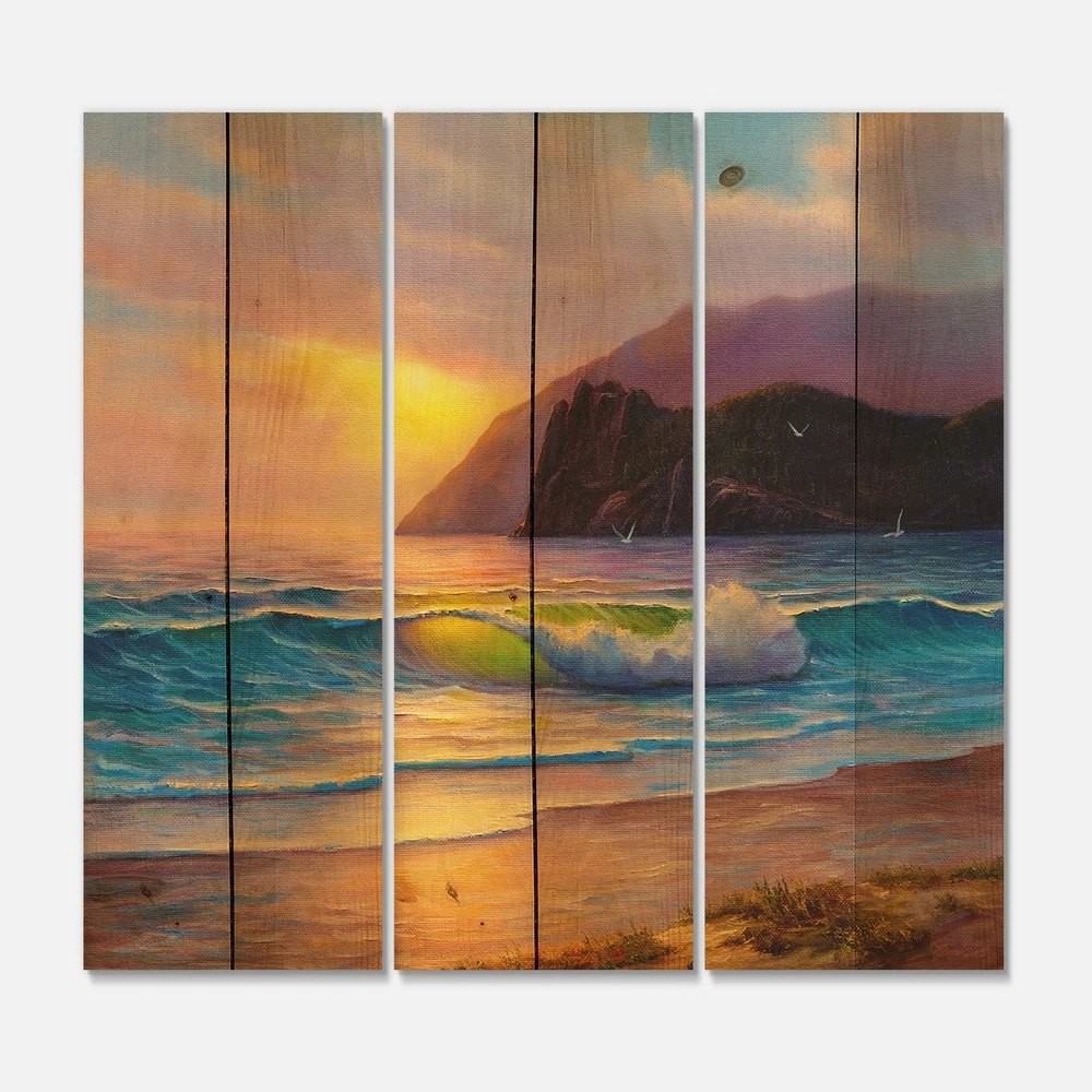 Alas, a modern take on wood wall art. Once typically a wall art piece found only in rustic or farmhouse style decor settings, this Beach wood wall art will easily fit into even the most contemporary of designs.Using the highest quality 6 Color Canon UV Ink, this Nautical & Coastal wood wall art incorporates several aspects of fine design into one stunning piece. With its slightly visible wood grain appearing through the colors and sleekly finished edges, it is a wonderful choice for any room in your home or office, being it a traditional or modern space. As each piece of wood has natural grain differences from the next, each of these wood wall arts is a truly unique addition to your space.Each Wood wall art is 100% handmade in Canada on Natural pine wood, using the highest quality ink Free Shipping Over $49.99* Details Designart 'Morning Sunlight On The Sea Waves V' Nautical & Coastal Print on Product Description: Alas, a modern take on wood wall art. Once typically a wall art piece found only in rustic or farmhouse style decor settings, this Beach wood wall art will easily fit into even the most contemporary of designs. Using the highest quality 6 Color Canon UV Ink, this Nautical & Coastal wood wall art incorporates several aspects of fine design into one stunning piece. With its slightly visible wood grain appearing through the colors and sleekly finished edges, it is a wonderful choice for any room in your home or office, being it a traditional or modern space. As each piece of wood has natural grain differences from the next, each of these wood wall arts is a truly unique addition to your space. Each Wood wall art is 100% handmade in Canada on Natural pine wood, using the highest quality ink which will not fade over time. - OrientationHorizontal - SubjectBeach TypeWood Wall Art, Fine Art, Wood Fine Art, Print on Plaque - Arrives ready to hang on the wall with hanging kit included - MaterialMade with 100% natural pine wood - StyleNautical & Coastal - Number of Pieces3 - ColorPurple