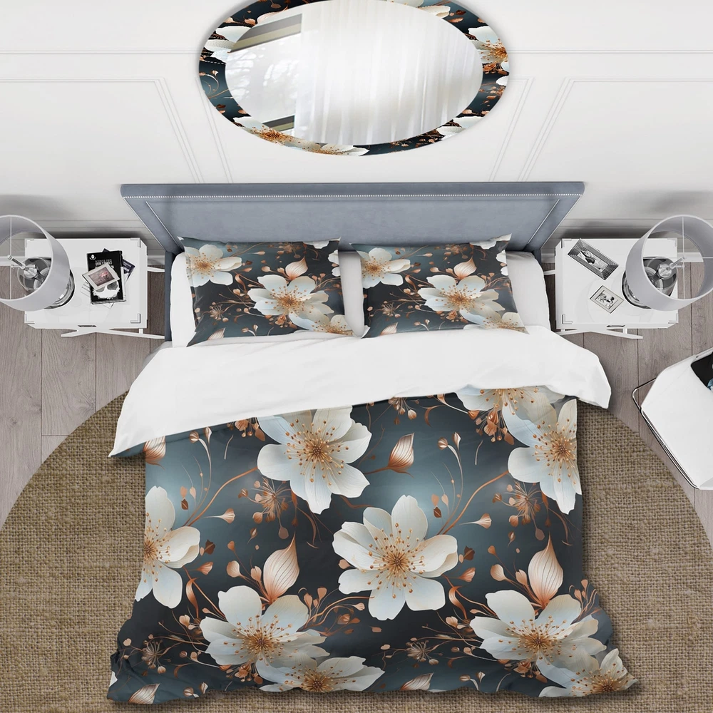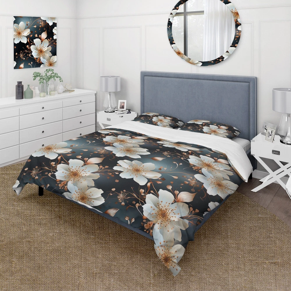 There is just nothing better than a beautiful, inviting comfortable bed after a long day. This Floral bed set is created using the richest colors stemming from high density Italian ink and the softest fabrics making it the perfect way to spruce up your bedroom, while keeping it ultra-comfortable. This luxurious Mystic Aura White And Gold Floral Delight bed design is made with 100% microfiber polyester, making it ultra-soft to ensure you sleep comfortably all night long. This Cottage set includes 1 Bed Cover and 2 Shams and is available in twin, queen and king sizes.This Bedding Set is easily integrated into your already decorated space.What's Included? - Duvet Cover - Shams - Pillow Cases not included but can be buy separately - Comforter Insert NOT INCLUDEDFeatures - Free Shipping Over $49.99* Details Designart "Mystic Aura White And Gold Floral Delight" Gold Cottage Bedding Set Product Description: There is just nothing better than a beautiful, inviting comfortable bed after a long day. This Floral bed set is created using the richest colors stemming from high density Italian ink and the softest fabrics making it the perfect way to spruce up your bedroom, while keeping it ultra-comfortable. This luxurious Mystic Aura White And Gold Floral Delight bed design is made with 100% microfiber polyester, making it ultra-soft to ensure you sleep comfortably all night long. This Cottage set includes 1 Bed Cover and 2 Shams and is available in twin, queen and king sizes. This Bedding Set is easily integrated into your already decorated space. What's Included? - Duvet Cover - Shams - Pillow Cases not included but can be buy separately - Comforter Insert NOT INCLUDED Features - Printed using High Density Italian Ink making the colors extra vibrant. - Made from ultra-soft, lightweight 100% microfiber polyester. Wrinkle resistant fabric. Down-like comfort, odorless. - The Cottage bed set includes one bed cover and two standard pillow shams to create a complete and stylish look. - The elegant and soft colors are both trendy and fun to brighten and update your bedroom. - Made in Canada - Decorative Wall Art and throw pillows to match this set are available but sold separately. - Actual comforter inserts and pillow inserts are not included. This set includes the two pillow shams and comforter cover only. King Dimensions: - 1 Duvet Cover104 inches wide x 88 inches long - 2 King Shams20 inches wide x 36 inches long Queen Dimensions: - 1 Duvet Cover88 inches wide x 88 inches long - 2 Standard Shams16 inches wide x 26 inches long Twin Dimensions: - 1 Duvet Cover68 inches wide x 88 inches long - 1 Standard Sham16 inches wide x 26 inches long Product Details - MaterialPolyester. - PatternFloral - ColorWhite; Gold - StyleCottage; traditional - ReversibleNo Directions: Fabric Care InstructionsMachine wash on cold gentle cycle. Wash separately on first wash. Use only non- chlorine bleach when needed. Tumble dry low. Remove promptly.
