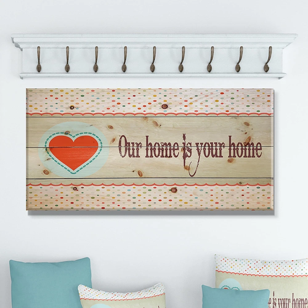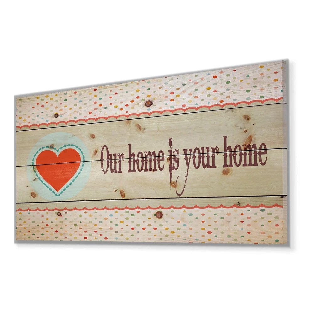 Greet your guests with this beautiful Entrance Wall Art to make them feel welcome. Once typically found only in rustic or farmhouse style decor settings, this Vintage wood wall art will easily fit into even the most contemporary of homes or offices.Using the highest quality 6 Color Canon UV Ink, this, this Farmhouse wood wall art incorporates several aspects of fine design into one stunning piece. With its slightly visible wood grain appearing through the colors and sleekly finished edges, it is a wonderful choice for any room in your home or office, being it a traditional or modern space. As each piece of wood has natural grain differences from the next, each of these wood wall arts is a truly unique addition to your space.Each Wood wall art is 100% handmade in Canada on Natural pine Free Shipping Over $49.99* Details Designart 'Our home is your home. Vintage Heart' Textual Entrance Art on Wood Product Description: Greet your guests with this beautiful Entrance Wall Art to make them feel welcome. Once typically found only in rustic or farmhouse style decor settings, this Vintage wood wall art will easily fit into even the most contemporary of homes or offices. Using the highest quality 6 Color Canon UV Ink, this, this Farmhouse wood wall art incorporates several aspects of fine design into one stunning piece. With its slightly visible wood grain appearing through the colors and sleekly finished edges, it is a wonderful choice for any room in your home or office, being it a traditional or modern space. As each piece of wood has natural grain differences from the next, each of these wood wall arts is a truly unique addition to your space. Each Wood wall art is 100% handmade in Canada on Natural pine wood, using the highest quality ink which will not fade over time. Available in 3 Different sizes :20x10; 40x20; 40x30 - OrientationHorizontal - SubjectVintage TypeWood Wall Art, Fine Art, Wood Fine Art, Print on Plaque - Arrives ready to hang on the wall with hanging kit included - MaterialMade with 100% natural pine wood - StyleFarmhouse - Number of Pieces1 - SizeLarge, Medium, Small