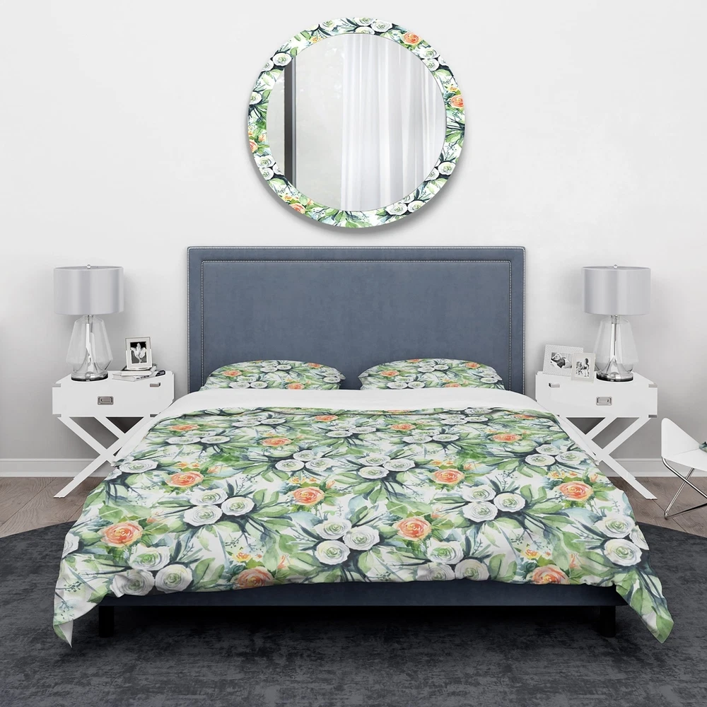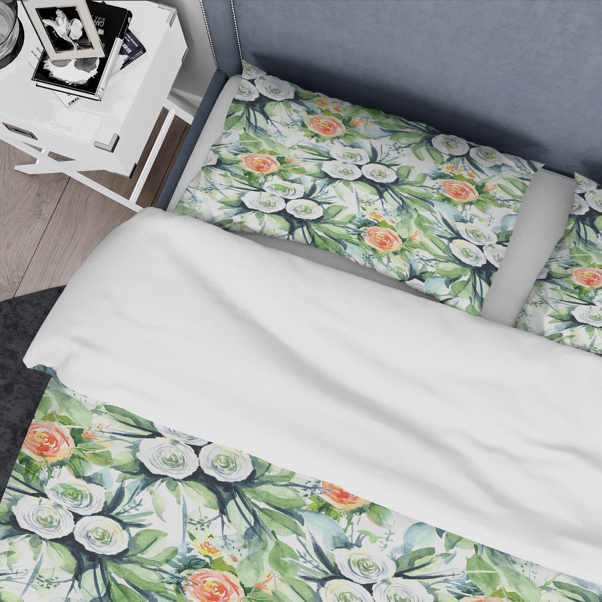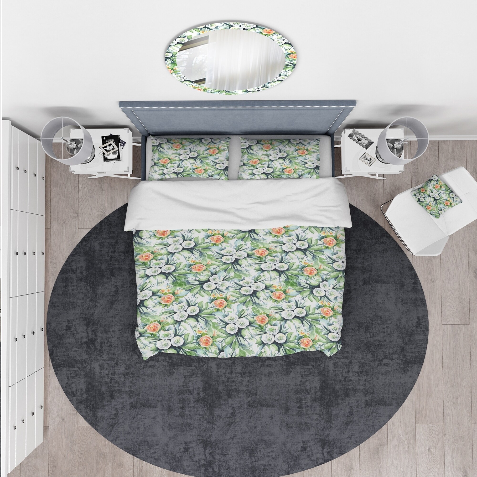 Transform your bedroom into a cozy and stylish sanctuary with Designart's 'Pattern with Flowers' Traditional Bedding Set. Made from 100% microfiber polyester, this Floral/Flower bed design is ultra-soft and wrinkle-resistant, ensuring a comfortable and luxurious sleep every night. The set comes with 1 Duvet Cover and 2 Shams, making it a complete and stylish addition to any bedroom. The vibrant colors are printed using High Density Italian Ink, creating a trendy and elegant look that will elevate your decor. Available in twin, queen, and king sizes, this Floral/Flower Bedding Set is perfect for any space.Features: Vibrant colors printed with High Density Italian Ink Made from ultra-soft, lightweight 100% microfiber polyester Wrinkle-resistant fabric that offers down-like comfort and is Free Shipping Over $49.99* Details Designart 'Pattern with Flowers' Traditional Bedding Set - Duvet Cover & Shams Product Description: Transform your bedroom into a cozy and stylish sanctuary with Designart's 'Pattern with Flowers' Traditional Bedding Set. Made from 100% microfiber polyester, this Floral/Flower bed design is ultra-soft and wrinkle-resistant, ensuring a comfortable and luxurious sleep every night. The set comes with 1 Duvet Cover and 2 Shams, making it a complete and stylish addition to any bedroom. The vibrant colors are printed using High Density Italian Ink, creating a trendy and elegant look that will elevate your decor. Available in twin, queen, and king sizes, this Floral/Flower Bedding Set is perfect for any space. Features: Vibrant colors printed with High Density Italian Ink Made from ultra-soft, lightweight 100% microfiber polyester Wrinkle-resistant fabric that offers down-like comfort and is odorless The set includes 1 bed cover and 2 standard pillow shams Available in twin, queen, and king sizes Made in Canada Comforter Insert NOT INCLUDED Dimensions: King1 Duvet Cover (104 inches wide x 88 inches long), 2 King Shams (20 inches wide x 36 inches long) Queen1 Duvet Cover (88 inches wide x 88 inches long), 2 Standard Shams (16 inches wide x 26 inches long) Twin1 Duvet Cover (68 inches wide x 88 inches long), 1 Standard Sham (16 inches wide x 26 inches long) Product Details: MaterialPolyester PatternFloral/Flower ColorGreen StyleFloral/Flower, Traditional ReversibleNo Care Instructions: Machine wash on cold gentle cycle. Wash separately on first wash. Use only non-chlorine bleach when needed. Tumble dry low. Remove promptly. *Pillow cases are not included but can be purchased separately. Decorative Wall Art and throw pillows to match this set are available but sold separately.