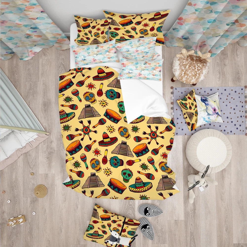 Create a vibrant and inviting atmosphere in your bedroom with Designart's 'Pattern with Mexican Symbols' Tropical Bedding Set. This luxurious Vintage bed design is made with 100% microfiber polyester, ensuring a comfortable and cozy night's sleep. The set includes a duvet cover and two shams, all printed using High Density Italian Ink for extra vibrancy. Available in twin, queen, and king sizes, this Tropical Holiday set is both trendy and fun to brighten up any space.Features: Printed using High Density Italian Ink for extra vibrancy Made from ultra-soft, lightweight 100% microfiber polyester with wrinkle-resistant fabric Includes one duvet cover and two standard pillow shams for a complete and stylish look Elegant and soft colors in a Tropical Holiday, Tropical, Vintage style Made Free Shipping Over $49.99* Details Designart 'Pattern with Mexican Symbols' Tropical Bedding Set - Duvet Cover & Product Description: Create a vibrant and inviting atmosphere in your bedroom with Designart's 'Pattern with Mexican Symbols' Tropical Bedding Set. This luxurious Vintage bed design is made with 100% microfiber polyester, ensuring a comfortable and cozy night's sleep. The set includes a duvet cover and two shams, all printed using High Density Italian Ink for extra vibrancy. Available in twin, queen, and king sizes, this Tropical Holiday set is both trendy and fun to brighten up any space. Features: Printed using High Density Italian Ink for extra vibrancy Made from ultra-soft, lightweight 100% microfiber polyester with wrinkle-resistant fabric Includes one duvet cover and two standard pillow shams for a complete and stylish look Elegant and soft colors in a Tropical Holiday, Tropical, Vintage style Made in Canada Comforter inserts and pillow inserts are not included Dimensions: King1 Duvet Cover (104 inches wide x 88 inches long), 2 King Shams (20 inches wide x 36 inches long) Queen1 Duvet Cover (88 inches wide x 88 inches long), 2 Standard Shams (16 inches wide x 26 inches long) Twin1 Duvet Cover (68 inches wide x 88 inches long), 1 Standard Sham (16 inches wide x 26 inches long) Other Details: MaterialPolyester PatternHoliday ColorYellow & Gold ReversibleNo Care InstructionsMachine wash on cold gentle cycle. Wash separately on first wash. Use only non-chlorine bleach when needed. Tumble dry low. Remove promptly.