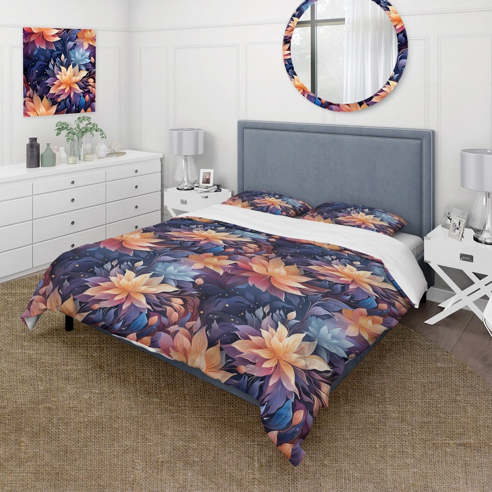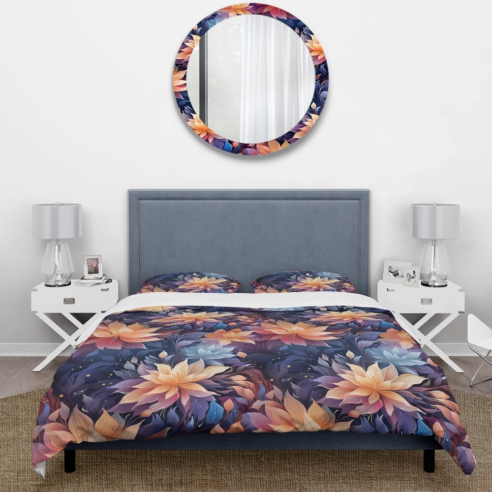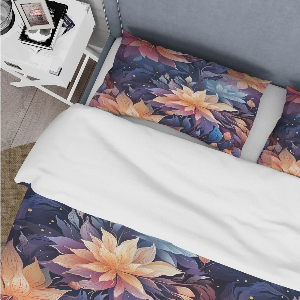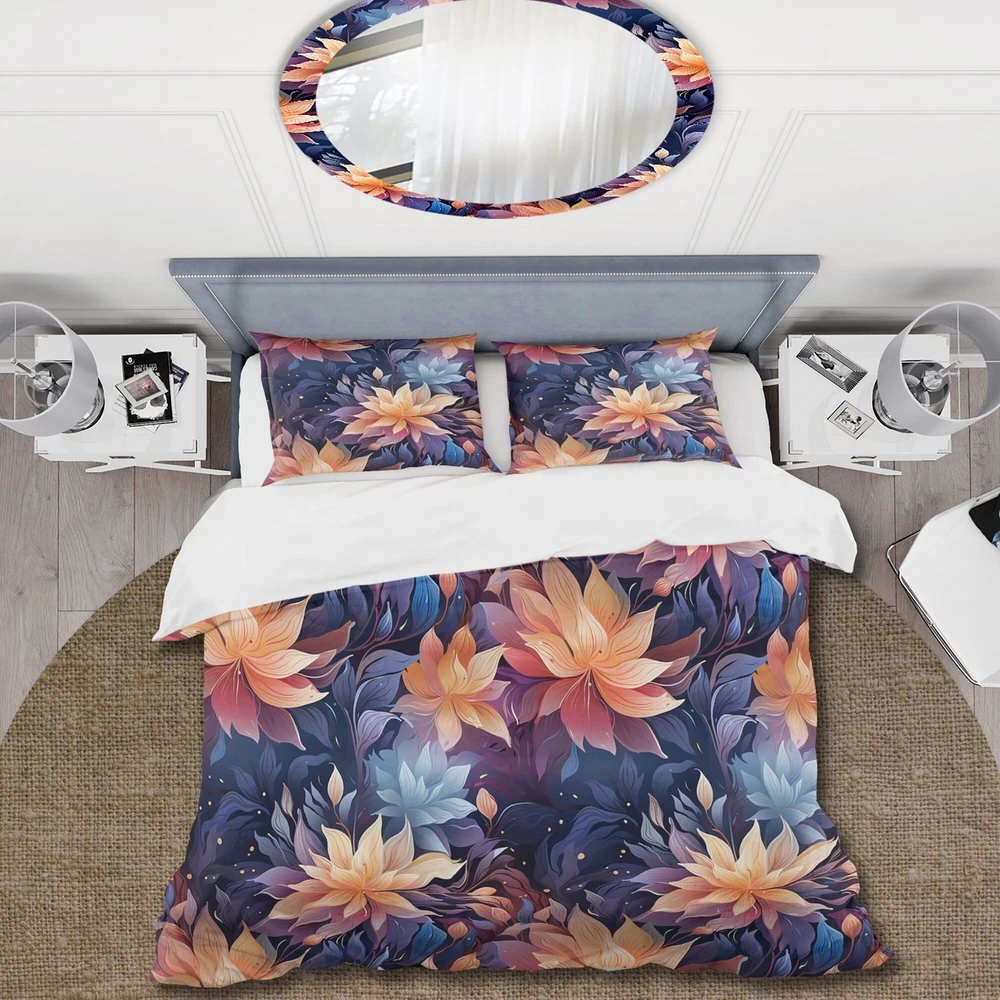There is just nothing better than a beautiful, inviting comfortable bed after a long day. This Floral bed set is created using the richest colors stemming from high density Italian ink and the softest fabrics making it the perfect way to spruce up your bedroom, while keeping it ultra-comfortable. This luxurious Peach And Blue Mystic Aura Floral Fantasy Magic I bed design is made with 100% microfiber polyester, making it ultra-soft to ensure you sleep comfortably all night long. This Cottage set includes 1 Bed Cover and 2 Shams and is available in twin, queen and king sizes.This Bedding Set is easily integrated into your already decorated space.What's Included? - Duvet Cover - Shams - Pillow Cases not included but can be buy separately - Comforter Insert NOT INCLUDEDFeatures Free Shipping Over $49.99* Details Designart "Peach And Blue Mystic Aura Floral Fantasy Magic I" Blue Cottage Bed Product Description: There is just nothing better than a beautiful, inviting comfortable bed after a long day. This Floral bed set is created using the richest colors stemming from high density Italian ink and the softest fabrics making it the perfect way to spruce up your bedroom, while keeping it ultra-comfortable. This luxurious Peach And Blue Mystic Aura Floral Fantasy Magic I bed design is made with 100% microfiber polyester, making it ultra-soft to ensure you sleep comfortably all night long. This Cottage set includes 1 Bed Cover and 2 Shams and is available in twin, queen and king sizes. This Bedding Set is easily integrated into your already decorated space. What's Included? - Duvet Cover - Shams - Pillow Cases not included but can be buy separately - Comforter Insert NOT INCLUDED Features - Printed using High Density Italian Ink making the colors extra vibrant. - Made from ultra-soft, lightweight 100% microfiber polyester. Wrinkle resistant fabric. Down-like comfort, odorless. - The Cottage bed set includes one bed cover and two standard pillow shams to create a complete and stylish look. - The elegant and soft colors are both trendy and fun to brighten and update your bedroom. - Made in Canada - Decorative Wall Art and throw pillows to match this set are available but sold separately. - Actual comforter inserts and pillow inserts are not included. This set includes the two pillow shams and comforter cover only. King Dimensions: - 1 Duvet Cover104 inches wide x 88 inches long - 2 King Shams20 inches wide x 36 inches long Queen Dimensions: - 1 Duvet Cover88 inches wide x 88 inches long - 2 Standard Shams16 inches wide x 26 inches long Twin Dimensions: - 1 Duvet Cover68 inches wide x 88 inches long - 1 Standard Sham16 inches wide x 26 inches long Product Details - MaterialPolyester. - PatternFloral - ColorPeach; Blue - StyleCottage; traditional - ReversibleNo Directions: Fabric Care InstructionsMachine wash on cold gentle cycle. Wash separately on first wash. Use only non- chlorine bleach when needed. Tumble dry low. Remove promptly.