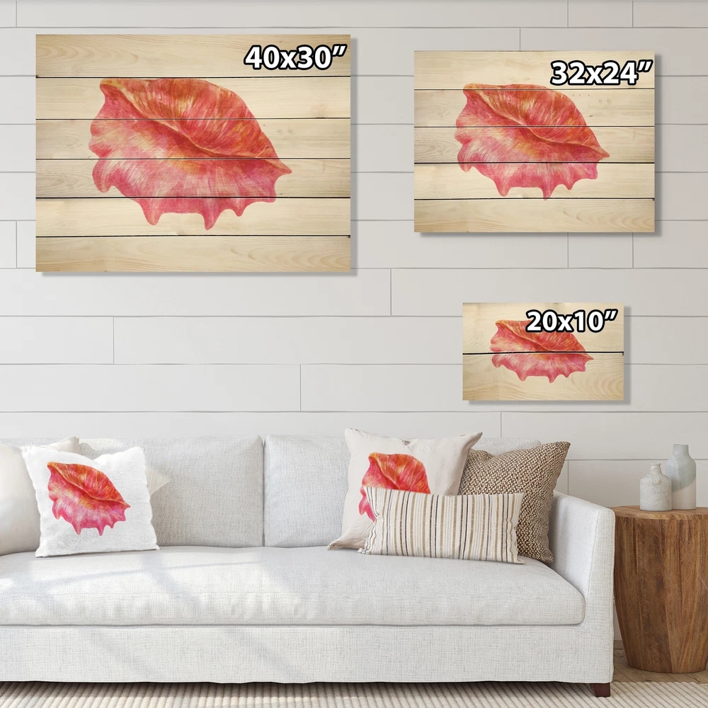Alas, a modern take on wood wall art. Once typically a wall art piece found only in rustic or farmhouse style decor settings, this Animals wood wall art will easily fit into even the most contemporary of designs.Using the highest quality 6 Color Canon UV Ink, this Nautical & Coastal wood wall art incorporates several aspects of fine design into one stunning piece. With its slightly visible wood grain appearing through the colors and sleekly finished edges, it is a wonderful choice for any room in your home or office, being it a traditional or modern space. As each piece of wood has natural grain differences from the next, each of these wood wall arts is a truly unique addition to your space.Each Wood wall art is 100% handmade in Canada on Natural pine wood, using the highest quality ink Free Shipping Over $49.99* Details Designart 'Pink Sea Shell' Nautical & Coastal Wood Wall Art Décor - Natural Pine Product Description: Alas, a modern take on wood wall art. Once typically a wall art piece found only in rustic or farmhouse style decor settings, this Animals wood wall art will easily fit into even the most contemporary of designs. Using the highest quality 6 Color Canon UV Ink, this Nautical & Coastal wood wall art incorporates several aspects of fine design into one stunning piece. With its slightly visible wood grain appearing through the colors and sleekly finished edges, it is a wonderful choice for any room in your home or office, being it a traditional or modern space. As each piece of wood has natural grain differences from the next, each of these wood wall arts is a truly unique addition to your space. Each Wood wall art is 100% handmade in Canada on Natural pine wood, using the highest quality ink which will not fade over time. Available in Differents sizes - OrientationHorizontal - SubjectAnimals TypeWood Wall Art, Fine Art, Wood Fine Art, Print on Plaque - Arrives ready to hang on the wall with hanging kit included - MaterialMade with 100% natural pine wood - StyleNautical & Coastal - Number of Pieces1 - ColorPink