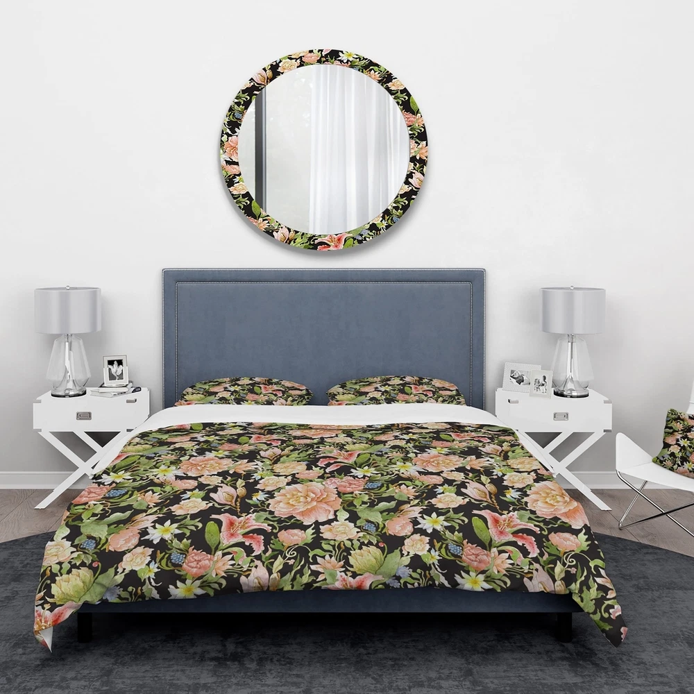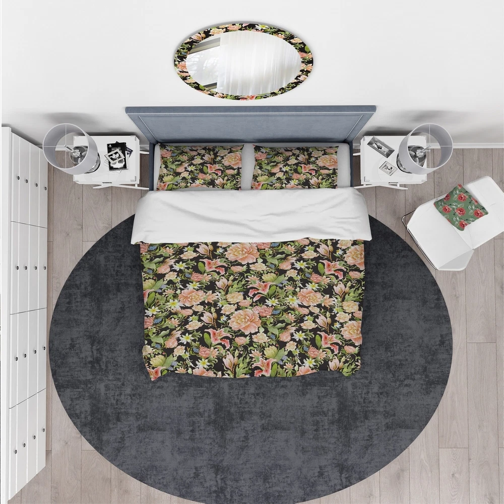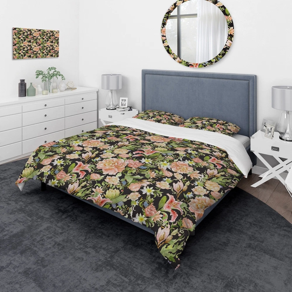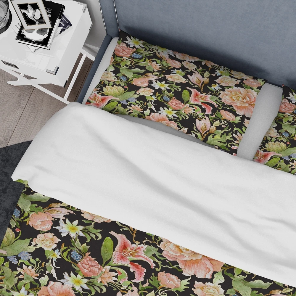 Transform your bedroom into a stunning retreat with the Designart 'Pink Watercolored Blossoming Flowers' Floral Bedding Set. Created with high density Italian ink and the softest microfiber polyester, this bed set is both luxurious and ultra-comfortable. The vibrant colors and elegant floral design of this duvet cover and shams set add a trendy and stylish touch to any bedroom decor. This set includes one duvet cover and two shams, available in twin, queen, and king sizes. Made in Canada, this wrinkle-resistant bedding set is perfect for achieving a complete and stylish look in your bedroom.Features: High density Italian ink makes the colors extra vibrant Made from ultra-soft, lightweight 100% microfiber polyester that is wrinkle resistant and odorless Includes one duvet cover and two Free Shipping Over $49.99* Details Designart 'Pink Watercolored Blossoming Flowers' Floral Bedding Set - Duvet Product Description: Transform your bedroom into a stunning retreat with the Designart 'Pink Watercolored Blossoming Flowers' Floral Bedding Set. Created with high density Italian ink and the softest microfiber polyester, this bed set is both luxurious and ultra-comfortable. The vibrant colors and elegant floral design of this duvet cover and shams set add a trendy and stylish touch to any bedroom decor. This set includes one duvet cover and two shams, available in twin, queen, and king sizes. Made in Canada, this wrinkle-resistant bedding set is perfect for achieving a complete and stylish look in your bedroom. Features: High density Italian ink makes the colors extra vibrant Made from ultra-soft, lightweight 100% microfiber polyester that is wrinkle resistant and odorless Includes one duvet cover and two pillow shams for a complete look Elegant floral design with soft, trendy colors Made in Canada Comforter insert and pillow cases not included King: Duvet Cover104 inches wide x 88 inches long King Shams20 inches wide x 36 inches long Queen: Duvet Cover88 inches wide x 88 inches long Standard Shams16 inches wide x 26 inches long Twin: Duvet Cover68 inches wide x 88 inches long Standard Sham16 inches wide x 26 inches long Other details: MaterialPolyester PatternFloral/Flower ColorPink StyleFloral/Flower, Traditional, Floral ReversibleNo Directions: Machine wash on cold gentle cycle. Wash separately on first wash. Use only non-chlorine bleach when needed. Tumble dry low. Remove promptly.