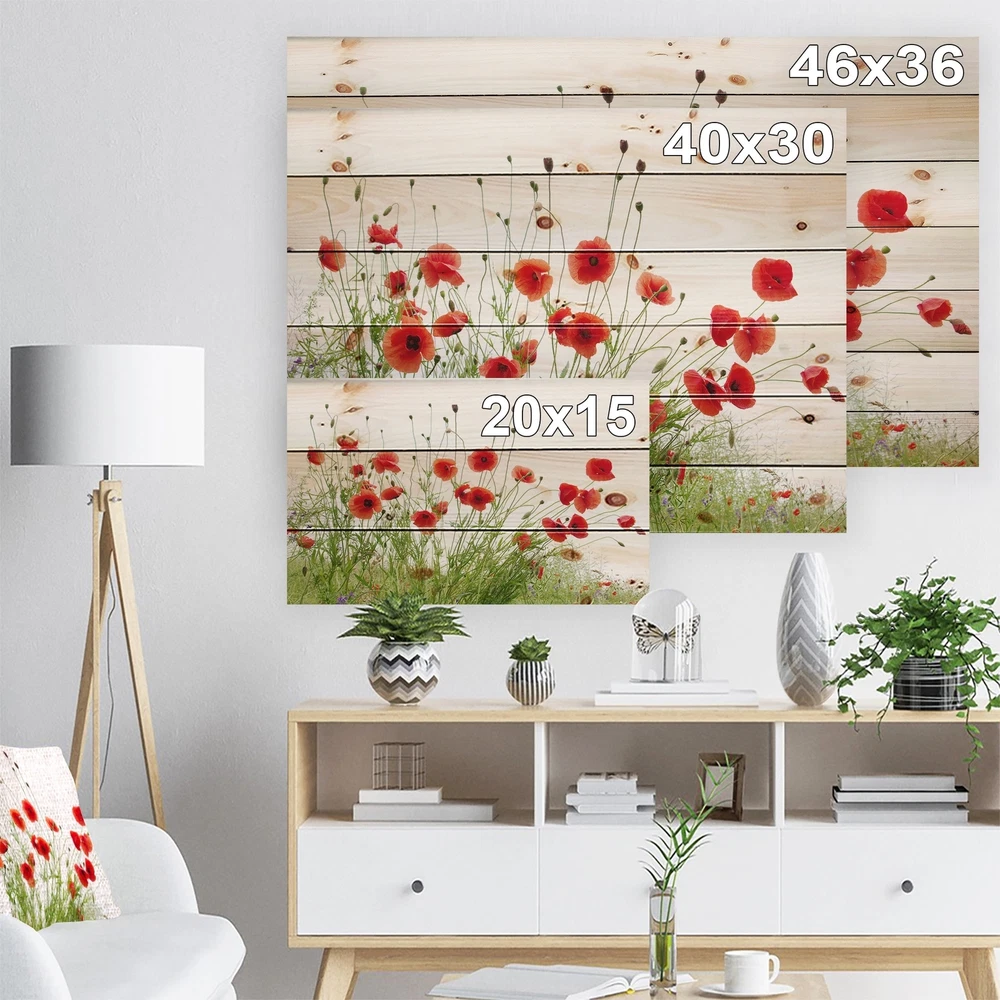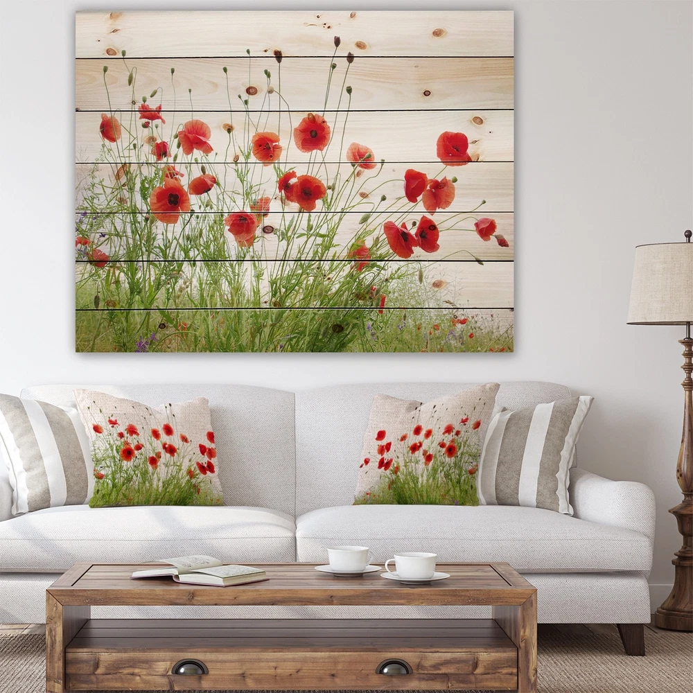 Alas, a modern take on wood wall art. Once typically a wall art piece found only in rustic or farmhouse style decor settings, this Floral wood wall art will easily fit into even the most contemporary of designs.Using the highest quality 6 Color Canon UV Ink, this Nautical & Coastal wood wall art incorporates several aspects of fine design into one stunning piece. With its slightly visible wood grain appearing through the colors and sleekly finished edges, it is a wonderful choice for any room in your home or office, being it a traditional or modern space. As each piece of wood has natural grain differences from the next, each of these wood wall arts is a truly unique addition to your space.Each Wood wall art is 100% handmade in Canada on Natural pine wood, using the highest quality ink Free Shipping Over $49.99* Details Designart 'Poppies On White Background' Nautical & Coastal Wood Wall Art Panels Product Description: Alas, a modern take on wood wall art. Once typically a wall art piece found only in rustic or farmhouse style decor settings, this Floral wood wall art will easily fit into even the most contemporary of designs. Using the highest quality 6 Color Canon UV Ink, this Nautical & Coastal wood wall art incorporates several aspects of fine design into one stunning piece. With its slightly visible wood grain appearing through the colors and sleekly finished edges, it is a wonderful choice for any room in your home or office, being it a traditional or modern space. As each piece of wood has natural grain differences from the next, each of these wood wall arts is a truly unique addition to your space. Each Wood wall art is 100% handmade in Canada on Natural pine wood, using the highest quality ink which will not fade over time. Available in Differents sizes - OrientationHorizontal - SubjectFloral TypeWood Wall Art, Fine Art, Wood Fine Art, Print on Plaque - Arrives ready to hang on the wall with hanging kit included - MaterialMade with 100% natural pine wood - StyleNautical & Coastal - Number of Pieces1 - ColorWhite