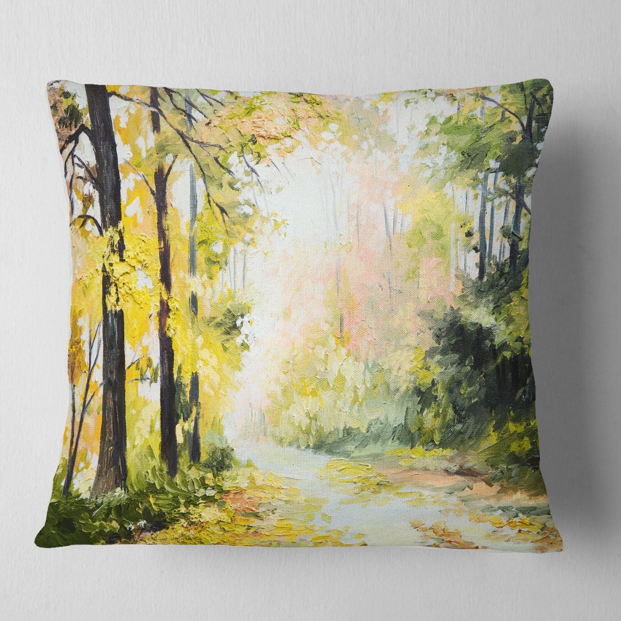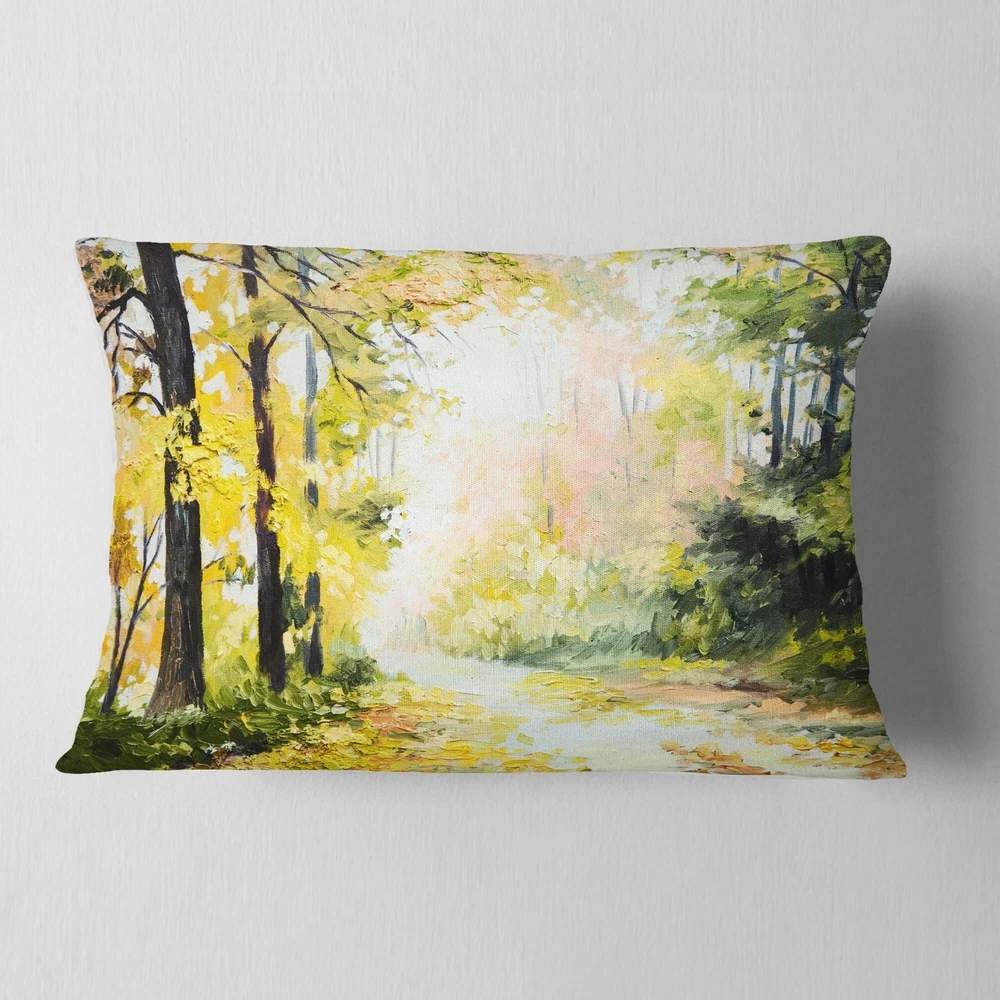 Decorative Throw Pillows for Couch Bed Sofa with Zip CoversAn easy, fun way to add a pop of color or bring new life to any room in your home or office is with these beautiful Landscape throw pillows. Dress up your bed, sofa or lounger with this decorative design art pillows. Perfect as Traditional bedroom décor, lounge décor Cottage living room décor. It adds a fun accent to any room. Throw pillows really do work wonders: they can transform any room from uninviting discomfort to warm and welcoming. And they really do go almost anywhere - arrange a couple on the couch or sofa, place one in your overstuffed chair for extra coziness, toss a couple on the bed and prop yourself up for a great read.These Landscapes pillow is printed using High Color Density Italian inks to create a vibrantly Free Shipping Over $49.99* Details Designart 'Road in Colorful Forest' Landscape Printed Throw Pillow Product Description: Decorative Throw Pillows for Couch Bed Sofa with Zip Covers An easy, fun way to add a pop of color or bring new life to any room in your home or office is with these beautiful Landscape throw pillows. Dress up your bed, sofa or lounger with this decorative design art pillows. Perfect as Traditional bedroom décor, lounge décor Cottage living room décor. It adds a fun accent to any room. Throw pillows really do work wondersthey can transform any room from uninviting discomfort to warm and welcoming. And they really do go almost anywhere - arrange a couple on the couch or sofa, place one in your overstuffed chair for extra coziness, toss a couple on the bed and prop yourself up for a great read. These Landscapes pillow is printed using High Color Density Italian inks to create a vibrantly colored, sharp artwork. Features: Perfect accent to any furniture piece Basic shapes with a modern graphic design twist Printed on 100% light weight polyester Cushion filled with 100% polyester fill Wrinkle resistant fabric Zip Closure so you can remove the pillow from its' cover Down-like comfort - Odorless 100% Hypoallergenic Machine Wash Cold Separately, Gently Cycle Only, No bleach, hang to dry Print on Demand with High Density Italian Ink Available in Several sizes Attribute :Traditional, Cottage, Fine Art Giclee Subject Landscapes, Country Charm,