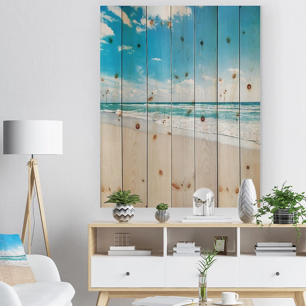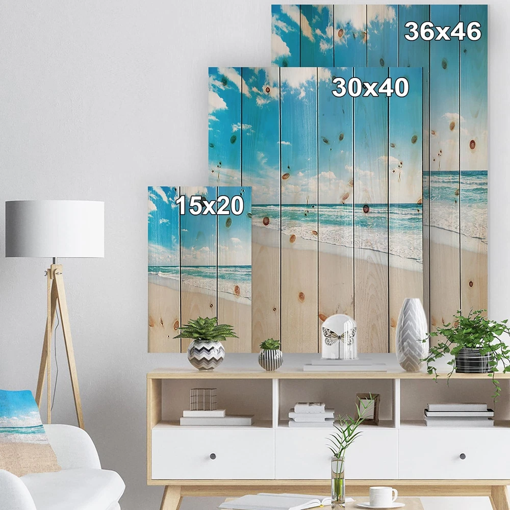 Alas, a modern take on wood wall art. Once typically a wall art piece found only in rustic or farmhouse style decor settings, this Beach wood wall art will easily fit into even the most contemporary of designs.Using the highest quality 6 Color Canon UV Ink, this Nautical & Coastal wood wall art incorporates several aspects of fine design into one stunning piece. With its slightly visible wood grain appearing through the colors and sleekly finished edges, it is a wonderful choice for any room in your home or office, being it a traditional or modern space. As each piece of wood has natural grain differences from the next, each of these wood wall arts is a truly unique addition to your space.Each Wood wall art is 100% handmade in Canada on Natural pine wood, using the highest quality ink Free Shipping Over $49.99* Details Designart 'Sea Beach Against Wave Foaming' Nautical & Coastal Wood Wall Art - Product Description: Alas, a modern take on wood wall art. Once typically a wall art piece found only in rustic or farmhouse style decor settings, this Beach wood wall art will easily fit into even the most contemporary of designs. Using the highest quality 6 Color Canon UV Ink, this Nautical & Coastal wood wall art incorporates several aspects of fine design into one stunning piece. With its slightly visible wood grain appearing through the colors and sleekly finished edges, it is a wonderful choice for any room in your home or office, being it a traditional or modern space. As each piece of wood has natural grain differences from the next, each of these wood wall arts is a truly unique addition to your space. Each Wood wall art is 100% handmade in Canada on Natural pine wood, using the highest quality ink which will not fade over time. Available in Differents sizes - OrientationVertical - SubjectBeach TypeWood Wall Art, Fine Art, Wood Fine Art, Print on Plaque - Arrives ready to hang on the wall with hanging kit included - MaterialMade with 100% natural pine wood - StyleNautical & Coastal - Number of Pieces1 - ColorBlue