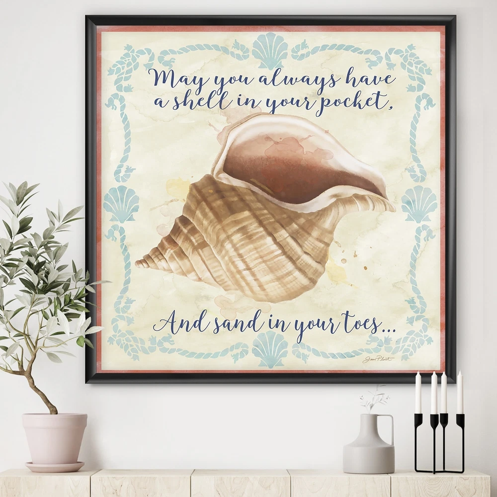 Amp up the coastal vibes in your home with this 'Sea Shells-B' art print from Designart. Featuring a large conch shell graphic bordered with delicate pieces of rope and seashells, this piece delivers a nautical look to tie together the other sea-themed elements in your space. A beach-themed quote completes the relaxed, welcoming feeling. Choose from a variety of frame colors to match your room's color palette, and rely on the included hardware for fast and convenient installation on any wall.This framed art print is available in many different color frames. All of our framed art prints are carefully packaged with corner protectors, fragile labeling, and sturdy boxes to ensure a safe delivery. Every framed art arrives ready to hang on the wall, with the hanging kit included.Features:Style : Free Shipping Over $49.99* Details Designart "Sea Shells-B" Nautical & Coastal Framed Art Print Product Description: Amp up the coastal vibes in your home with this 'Sea Shells-B' art print from Designart. Featuring a large conch shell graphic bordered with delicate pieces of rope and seashells, this piece delivers a nautical look to tie together the other sea-themed elements in your space. A beach-themed quote completes the relaxed, welcoming feeling. Choose from a variety of frame colors to match your room's color palette, and rely on the included hardware for fast and convenient installation on any wall. This framed art print is available in many different color frames. All of our framed art prints are carefully packaged with corner protectors, fragile labeling, and sturdy boxes to ensure a safe delivery. Every framed art arrives ready to hang on the wall, with the hanging kit included. Features: Style Nautical & Coastal Subject Animals Color Brown Premium quality cotton canvas mounted. Available in several frame colors. Arrives with instructions and hanging kit