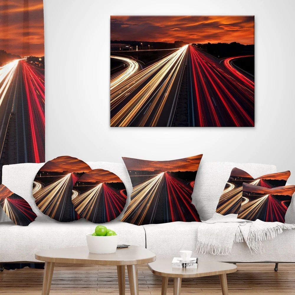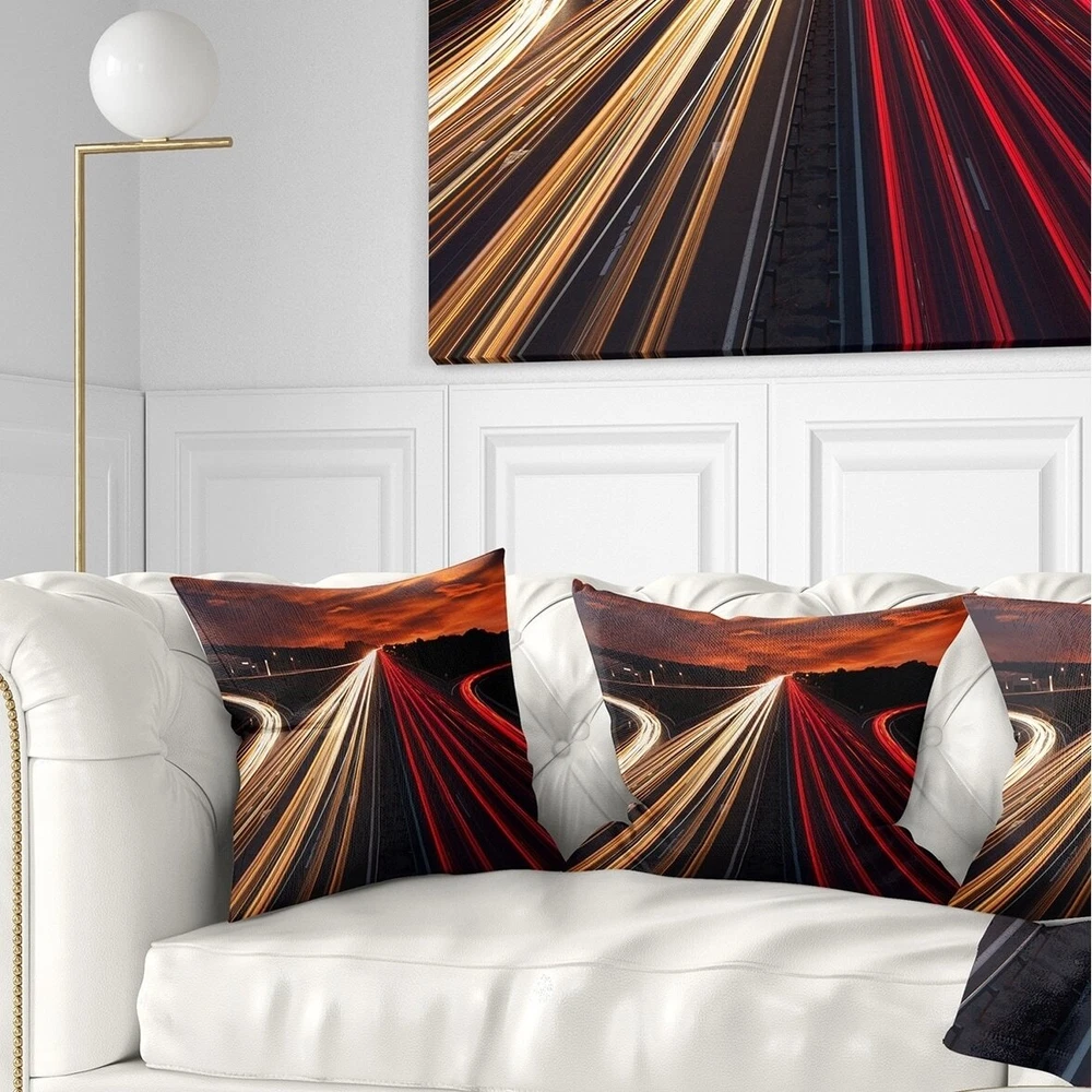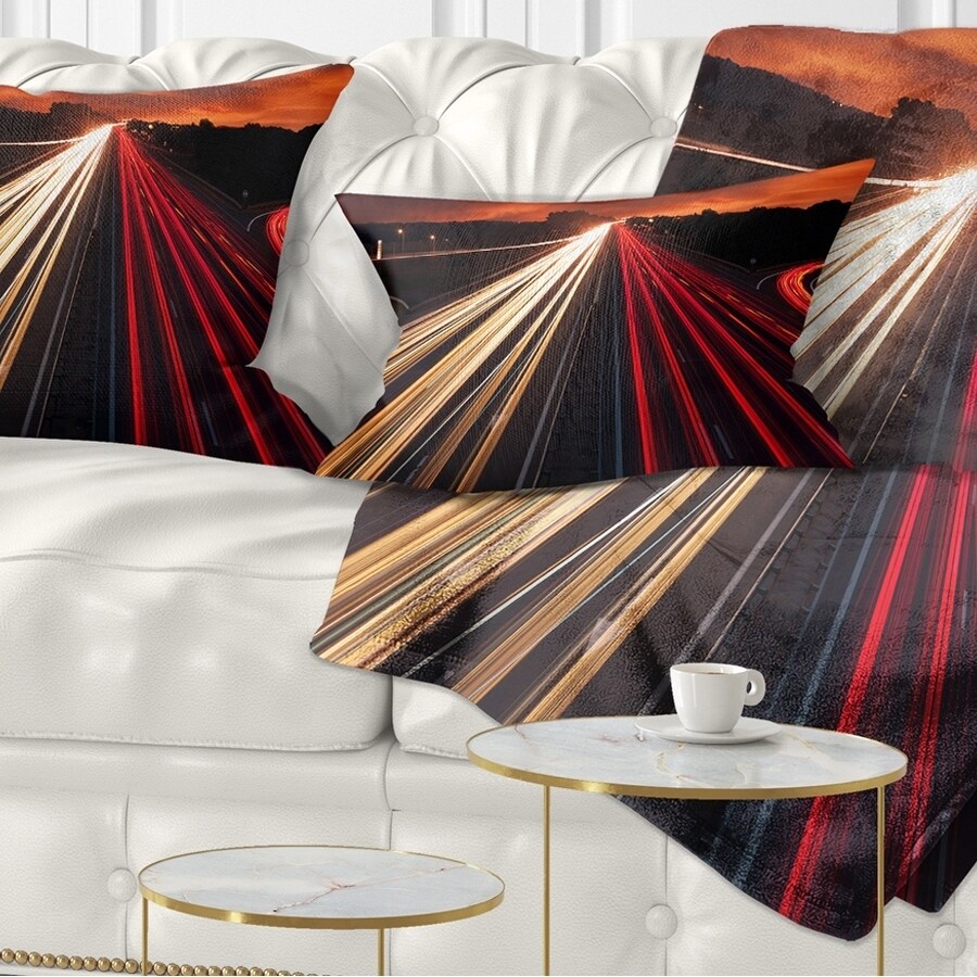 Decorative Throw Pillows for Couch Bed Sofa with Zip CoversAn easy, fun way to add a pop of color or bring new life to any room in your home or office is with these beautiful Cityscape throw pillows. Dress up your bed, sofa or lounger with this decorative design art pillows. Perfect as Industrial bedroom décor, lounge décor Panoramic Art living room décor. It adds a fun accent to any room. Throw pillows really do work wonders: they can transform any room from uninviting discomfort to warm and welcoming. And they really do go almost anywhere - arrange a couple on the couch or sofa, place one in your overstuffed chair for extra coziness, toss a couple on the bed and prop yourself up for a great read.These Architecture pillow is printed using High Color Density Italian inks to create a Free Shipping Over $49.99* Details Designart 'Speed Traffic Trails' Cityscape Digital Throw Pillow Product Description: Decorative Throw Pillows for Couch Bed Sofa with Zip Covers An easy, fun way to add a pop of color or bring new life to any room in your home or office is with these beautiful Cityscape throw pillows. Dress up your bed, sofa or lounger with this decorative design art pillows. Perfect as Industrial bedroom décor, lounge décor Panoramic Art living room décor. It adds a fun accent to any room. Throw pillows really do work wondersthey can transform any room from uninviting discomfort to warm and welcoming. And they really do go almost anywhere - arrange a couple on the couch or sofa, place one in your overstuffed chair for extra coziness, toss a couple on the bed and prop yourself up for a great read. These Architecture pillow is printed using High Color Density Italian inks to create a vibrantly colored, sharp artwork. Features: Perfect accent to any furniture piece Basic shapes with a modern graphic design twist Printed on 100% light weight polyester Cushion filled with 100% polyester fill Wrinkle resistant fabric Zip Closure so you can remove the pillow from its' cover Down-like comfort - Odorless 100% Hypoallergenic Machine Wash Cold Separately, Gently Cycle Only, No bleach, hang to dry Print on Demand with High Density Italian Ink Available in Several sizes Attribute :Industrial, Panoramic Art, Modern Subject Architecture, Cityscapes, Photography