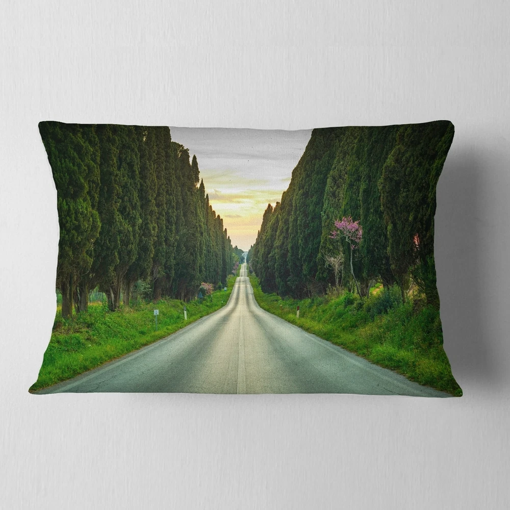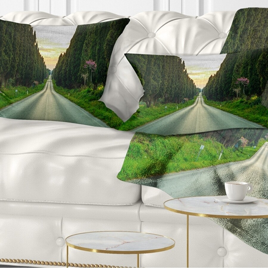 Decorative Throw Pillows for Couch Bed Sofa with Zip CoversAn easy, fun way to add a pop of color or bring new life to any room in your home or office is with these beautiful Landscape throw pillows. Dress up your bed, sofa or lounger with this decorative design art pillows. Perfect as Farmhouse bedroom décor, lounge décor Traditional living room décor. It adds a fun accent to any room. Throw pillows really do work wonders: they can transform any room from uninviting discomfort to warm and welcoming. And they really do go almost anywhere - arrange a couple on the couch or sofa, place one in your overstuffed chair for extra coziness, toss a couple on the bed and prop yourself up for a great read.These Landscapes pillow is printed using High Color Density Italian inks to create a vibrantly Free Shipping Over $49.99* Details Designart 'Straight Road through Cypress Trees' Landscape Wall Throw Pillow Product Description: Decorative Throw Pillows for Couch Bed Sofa with Zip Covers An easy, fun way to add a pop of color or bring new life to any room in your home or office is with these beautiful Landscape throw pillows. Dress up your bed, sofa or lounger with this decorative design art pillows. Perfect as Farmhouse bedroom décor, lounge décor Traditional living room décor. It adds a fun accent to any room. Throw pillows really do work wondersthey can transform any room from uninviting discomfort to warm and welcoming. And they really do go almost anywhere - arrange a couple on the couch or sofa, place one in your overstuffed chair for extra coziness, toss a couple on the bed and prop yourself up for a great read. These Landscapes pillow is printed using High Color Density Italian inks to create a vibrantly colored, sharp artwork. Features: Perfect accent to any furniture piece Basic shapes with a modern graphic design twist Printed on 100% light weight polyester Cushion filled with 100% polyester fill Wrinkle resistant fabric Zip Closure so you can remove the pillow from its' cover Down-like comfort - Odorless 100% Hypoallergenic Machine Wash Cold Separately, Gently Cycle Only, No bleach, hang to dry Print on Demand with High Density Italian Ink Available in Several sizes Attribute :Farmhouse, Traditional, Fine Art Giclee Subject Landscapes, Country Charrm, photography