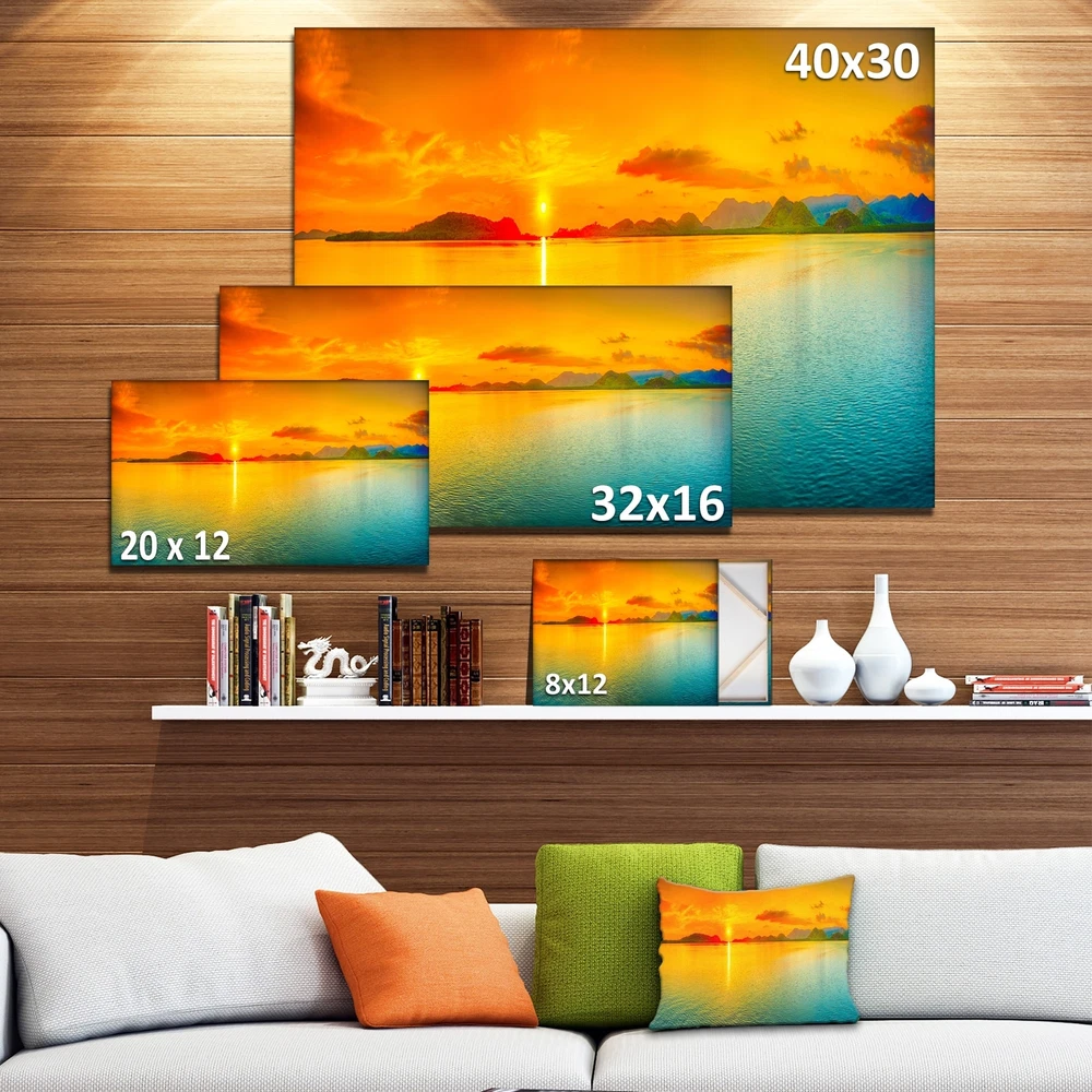 This beautiful Canvas Art is printed using the highest quality fade resistant ink on canvas. Every one of our fine art giclee canvas prints is printed on premium quality cotton canvas, using the finest quality inks which will not fade over time. Each giclee print is stretched tightly over a 1 inch wood sub frame ensuring the canvas is taught and does not buckle. This canvas art print is gallery-wrapped (the design continues on the sides) , giving it a real art gallery feel. All of our canvas prints are carefully packaged with bubble wrap, fragile labeling and sturdy boxes to ensure a safe delivery. Every canvas print arrives ready to hang on the wall, with the hanging kits included Orientation: HorizontalSubject: Nautical, Decorative, Sea & ShoreType: Canvas Art, Fine Art Giclee, Free Shipping Over $49.99* Details Designart - Sunset Over Sea Panorama - Seascape Photography Canvas Print Product Description: This beautiful Canvas Art is printed using the highest quality fade resistant ink on canvas. Every one of our fine art giclee canvas prints is printed on premium quality cotton canvas, using the finest quality inks which will not fade over time. Each giclee print is stretched tightly over a 1 inch wood sub frame ensuring the canvas is taught and does not buckle. This canvas art print is gallery-wrapped (the design continues on the sides) , giving it a real art gallery feel. All of our canvas prints are carefully packaged with bubble wrap, fragile labeling and sturdy boxes to ensure a safe delivery. Every canvas print arrives ready to hang on the wall, with the hanging kits included OrientationHorizontal SubjectNautical, Decorative, Sea & Shore TypeCanvas Art, Fine Art Giclee, Wrapped MaterialCanvas, Wood StylePhotography, Framed Art FramedFramed Exact ColorOrange SizeLarge, Oversized, Small Factory sealed boxes cannot be returned if opened.
