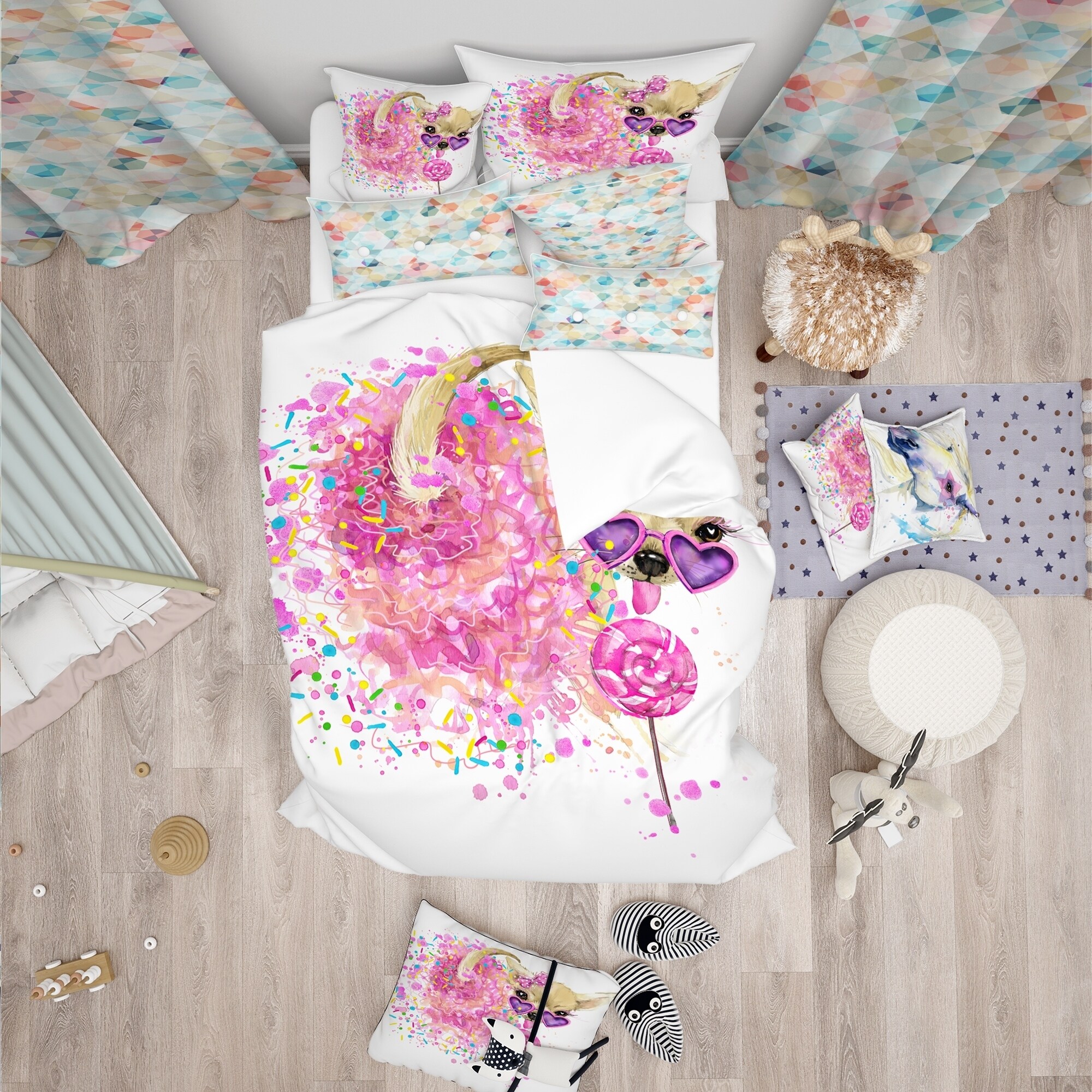 Add a touch of fun and comfort to your bedroom with this Modern & Contemporary bedding set featuring a Sweet Pink Dog with Glasses design. Made with the softest 100% microfiber polyester and high density Italian ink, this bed set is both stylish and comfortable. The Animal Print set includes 1 Duvet Cover and 2 Shams, and is available in Twin, Queen, and King sizes. The elegant and soft colors are both trendy and fun, perfect to brighten up your bedroom. This bed set is made in Canada and is easily integrated into any already-decorated space.Features: Printed using High Density Italian Ink for extra vibrant colors Made from ultra-soft, lightweight 100% microfiber polyester. Wrinkle-resistant fabric. Down-like comfort, odorless Includes one bed cover and two standard pillow shams to Free Shipping Over $49.99* Details Designart 'Sweet Pink Dog with Glasses' Modern & Contemporary Bedding Set - Product Description: Add a touch of fun and comfort to your bedroom with this Modern & Contemporary bedding set featuring a Sweet Pink Dog with Glasses design. Made with the softest 100% microfiber polyester and high density Italian ink, this bed set is both stylish and comfortable. The Animal Print set includes 1 Duvet Cover and 2 Shams, and is available in Twin, Queen, and King sizes. The elegant and soft colors are both trendy and fun, perfect to brighten up your bedroom. This bed set is made in Canada and is easily integrated into any already-decorated space. Features: Printed using High Density Italian Ink for extra vibrant colors Made from ultra-soft, lightweight 100% microfiber polyester. Wrinkle-resistant fabric. Down-like comfort, odorless Includes one bed cover and two standard pillow shams to create a complete and stylish look Trendy and fun colors to brighten your bedroom Made in Canada Comforter inserts and pillow inserts not included Dimensions: King1 Duvet Cover (104" x 88"), 2 King Shams (20" x 36") Queen1 Duvet Cover (88" x 88"), 2 Standard Shams (16" x 26") Twin1 Duvet Cover (68" x 88"), 1 Standard Sham (16" x 26") Product Details: MaterialPolyester PatternAnimal Print ColorPink StyleAnimal Print, Modern & Contemporary, Animals ReversibleNo Directions: Machine wash on cold gentle cycle. Wash separately on first wash. Use only non-chlorine bleach when needed. Tumble dry low. Remove promptly.