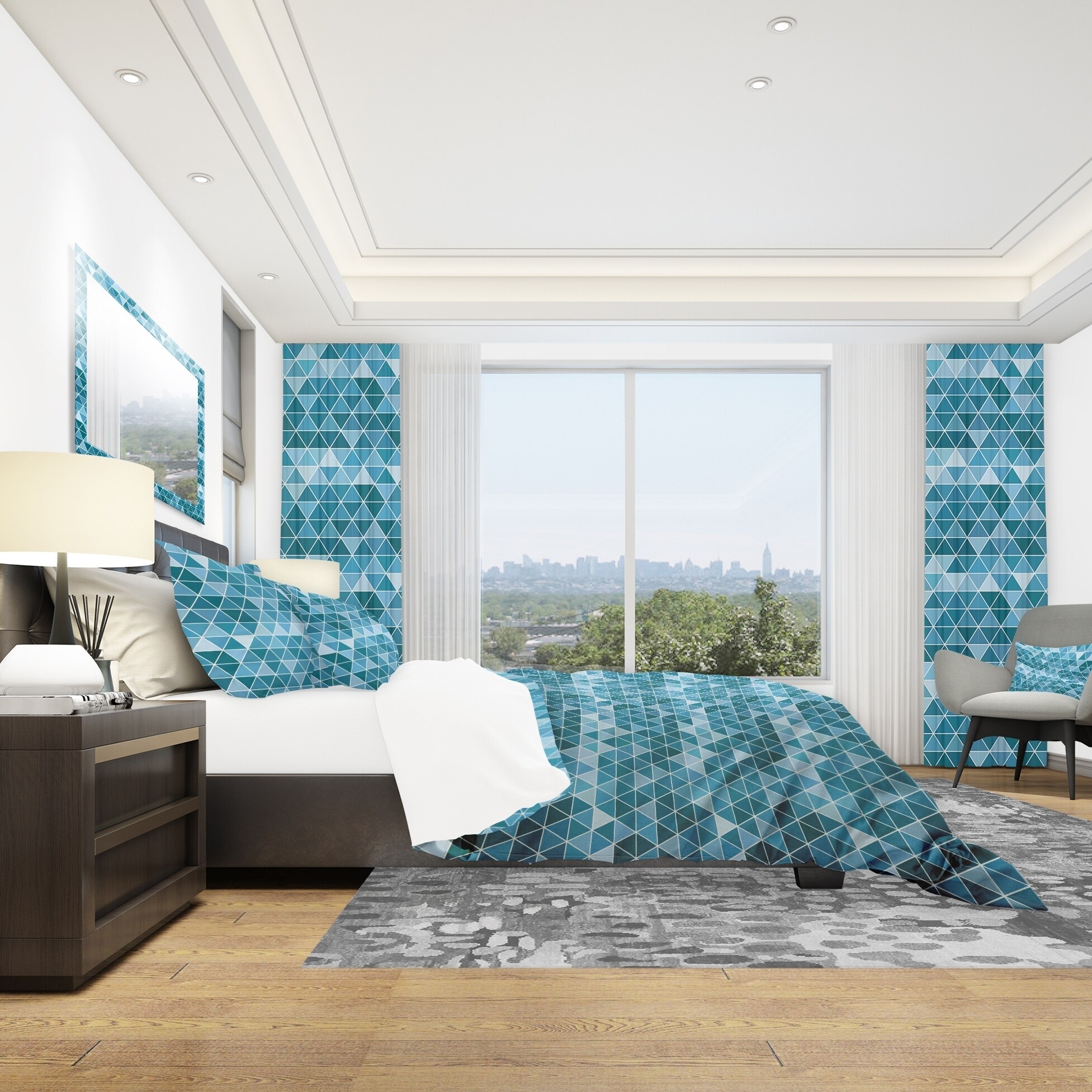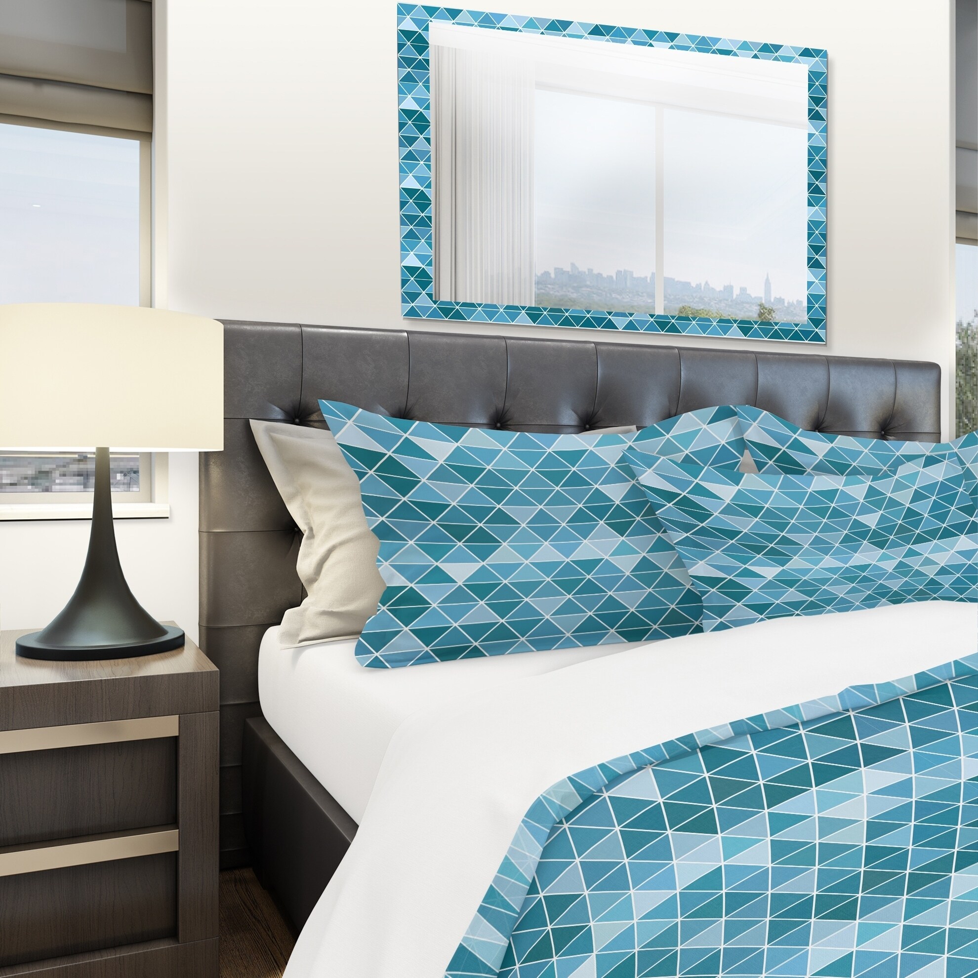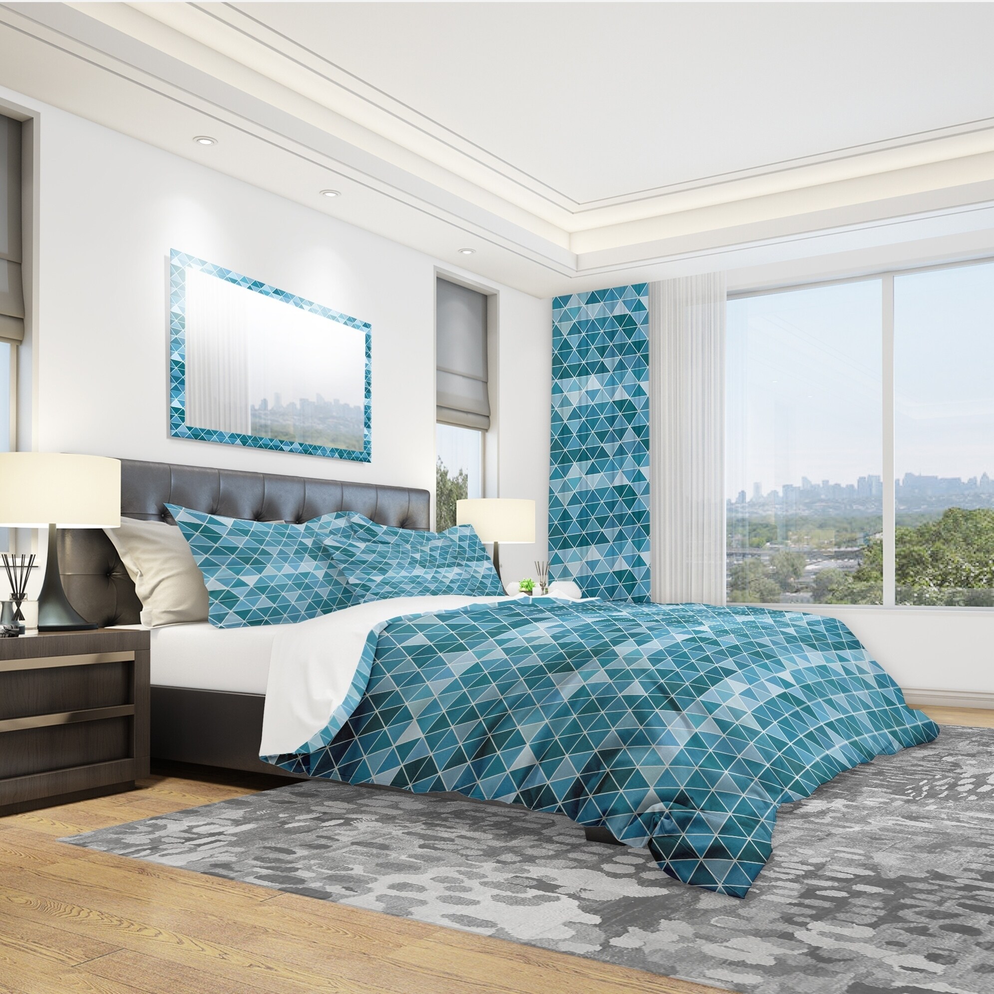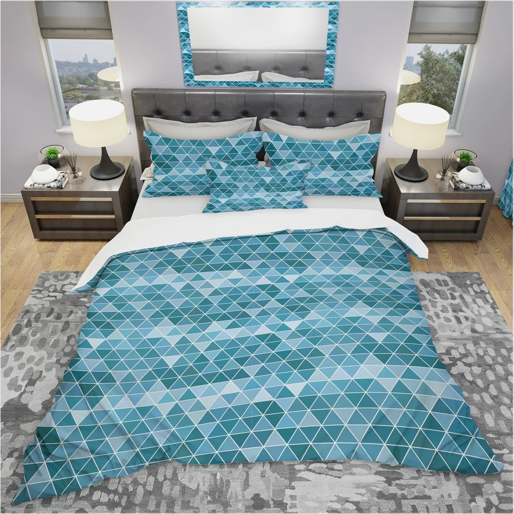 Add a touch of modern elegance to your bedroom with this Geometric Bedding Set from Designart. The beautiful shades of blue and high-density Italian ink create a vibrant and inviting design that will spruce up your space while keeping it ultra-comfortable. Made from 100% microfiber polyester, this luxurious bed set is wrinkle-resistant, odorless, and ultra-soft, ensuring a comfortable and restful sleep. The set includes one duvet cover and two pillow shams, available in twin, queen, and king sizes. Upgrade your bedroom decor with this elegant Modern & Contemporary Geometric bedding set, made in Canada.Features: Vibrant colors from high-density Italian ink Ultra-soft and lightweight 100% microfiber polyester Includes one duvet cover and two pillow shams for a complete and stylish look Free Shipping Over $49.99* Details Designart 'Triangular Geometry in Shades of Blue' Modern & Contemporary Bedding Product Description: Add a touch of modern elegance to your bedroom with this Geometric Bedding Set from Designart. The beautiful shades of blue and high-density Italian ink create a vibrant and inviting design that will spruce up your space while keeping it ultra-comfortable. Made from 100% microfiber polyester, this luxurious bed set is wrinkle-resistant, odorless, and ultra-soft, ensuring a comfortable and restful sleep. The set includes one duvet cover and two pillow shams, available in twin, queen, and king sizes. Upgrade your bedroom decor with this elegant Modern & Contemporary Geometric bedding set, made in Canada. Features: Vibrant colors from high-density Italian ink Ultra-soft and lightweight 100% microfiber polyester Includes one duvet cover and two pillow shams for a complete and stylish look Trendy and fun soft colors to brighten up your bedroom Made in Canada Comforter inserts and pillow inserts not included Dimensions: King1 Duvet Cover (104" x 88"), 2 King Shams (20" x 36") Queen1 Duvet Cover (88" x 88"), 2 Standard Shams (16" x 26") Twin1 Duvet Cover (68" x 88"), 1 Standard Sham (16" x 26") Product Details: MaterialPolyester PatternGeometric ColorBlue StyleModern Contemporary Geometric, Modern & Contemporary, Modern ReversibleNo Directions: Machine wash on cold gentle cycle. Wash separately on first wash. Use only non-chlorine bleach when needed. Tumble dry low. Remove promptly.