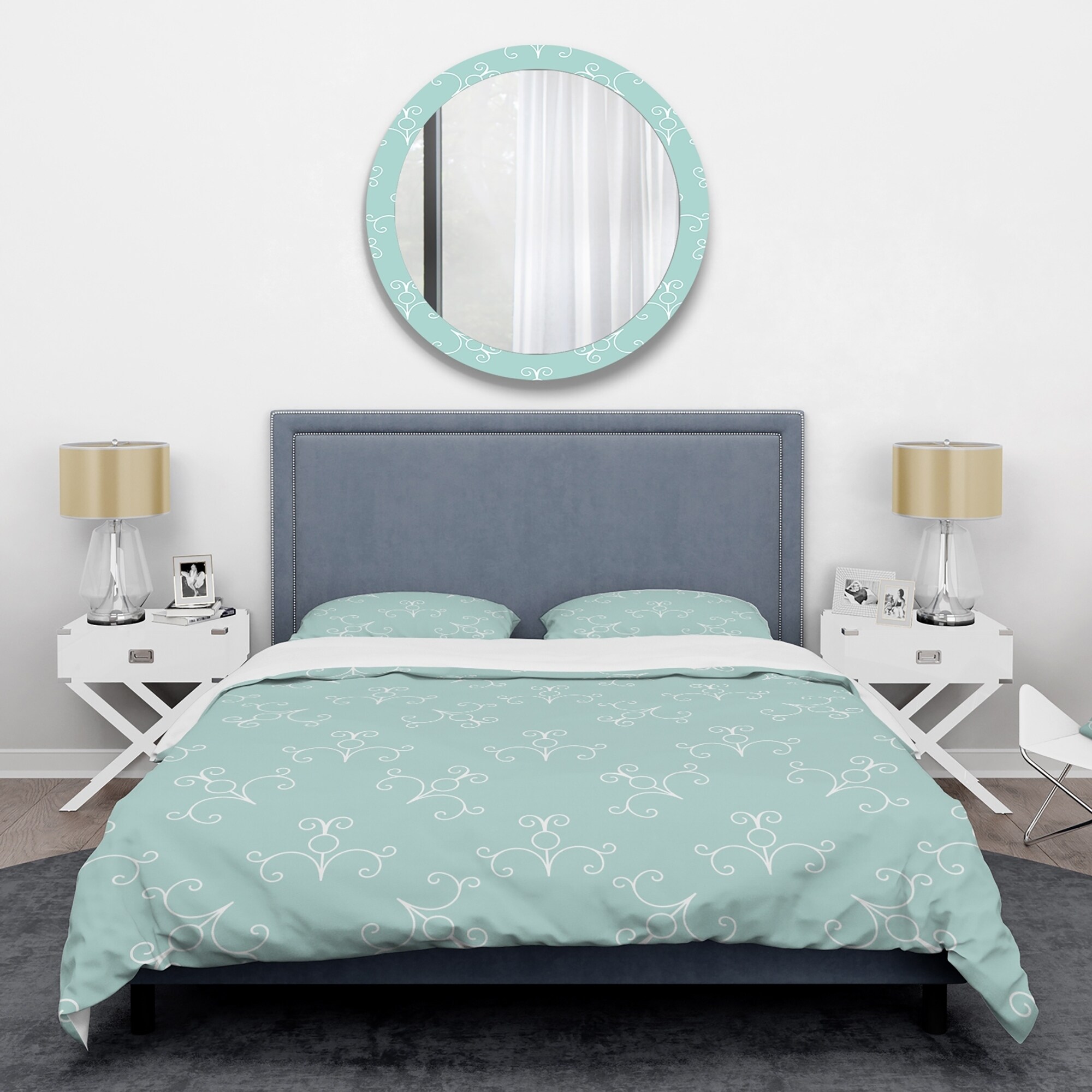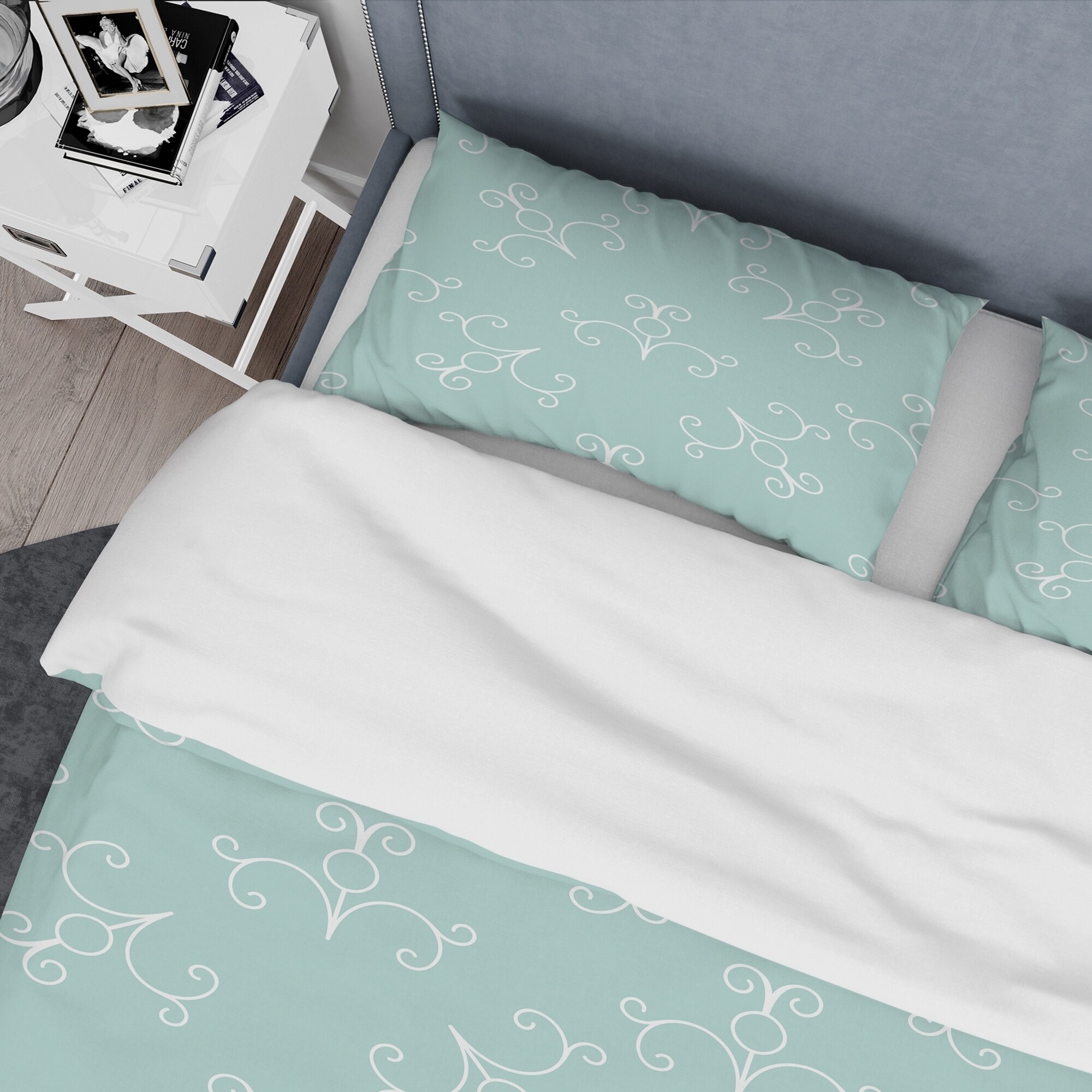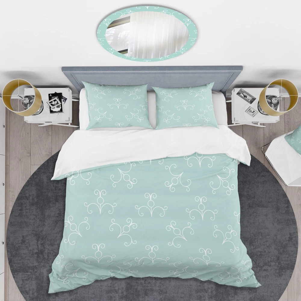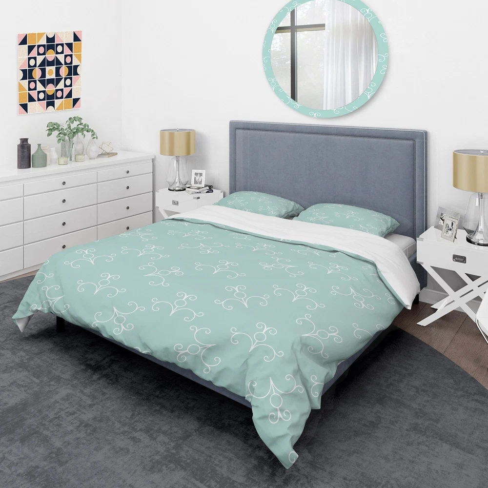 Transform your bedroom into a cozy and stylish haven with the Designart 'Turquoise Minimal Ornament' Mid-Century Duvet Cover Set. The abstract bedding set features a vintage abstract design printed with high density Italian ink, making the colors extra vibrant. Made from ultra-soft, lightweight 100% microfiber polyester, this set is wrinkle-resistant, odorless, and provides down-like comfort for a restful sleep every night. This set includes one duvet cover and two pillow shams (comforter insert not included) and is available in twin, queen, and king sizes.Features: Printed using High Density Italian Ink making the colors extra vibrant Made from ultra-soft, lightweight 100% microfiber polyester. Wrinkle resistant fabric. Down-like comfort, odorless Includes one duvet cover and two Free Shipping Over $49.99* Details Designart 'Turquoise Minimal Ornament' Mid-Century Duvet Cover Set Product Description: Transform your bedroom into a cozy and stylish haven with the Designart 'Turquoise Minimal Ornament' Mid-Century Duvet Cover Set. The abstract bedding set features a vintage abstract design printed with high density Italian ink, making the colors extra vibrant. Made from ultra-soft, lightweight 100% microfiber polyester, this set is wrinkle-resistant, odorless, and provides down-like comfort for a restful sleep every night. This set includes one duvet cover and two pillow shams (comforter insert not included) and is available in twin, queen, and king sizes. Features: Printed using High Density Italian Ink making the colors extra vibrant Made from ultra-soft, lightweight 100% microfiber polyester. Wrinkle resistant fabric. Down-like comfort, odorless Includes one duvet cover and two standard pillow shams to create a complete and stylish look Elegant and soft colors are both trendy and fun to brighten and update your bedroom Made in Canada Comforter inserts and pillow inserts are not included Product Details: MaterialPolyester PatternAbstract ColorBlue StyleVintage Abstract, Mid-Century Modern, Abstract ReversibleNo King: 1 Duvet Cover104 inches wide x 88 inches long 2 King Shams20 inches wide x 36 inches long Queen: 1 Duvet Cover88 inches wide x 88 inches long 2 Standard Shams16 inches wide x 26 inches long Twin: 1 Duvet Cover68 inches wide x 88 inches long 1 Standard Sham16 inches wide x 26 inches long Care Instructions: Machine wash on cold gentle cycle. Wash separately on first wash. Use only non-chlorine bleach when needed. Tumble dry low. Remove promptly.