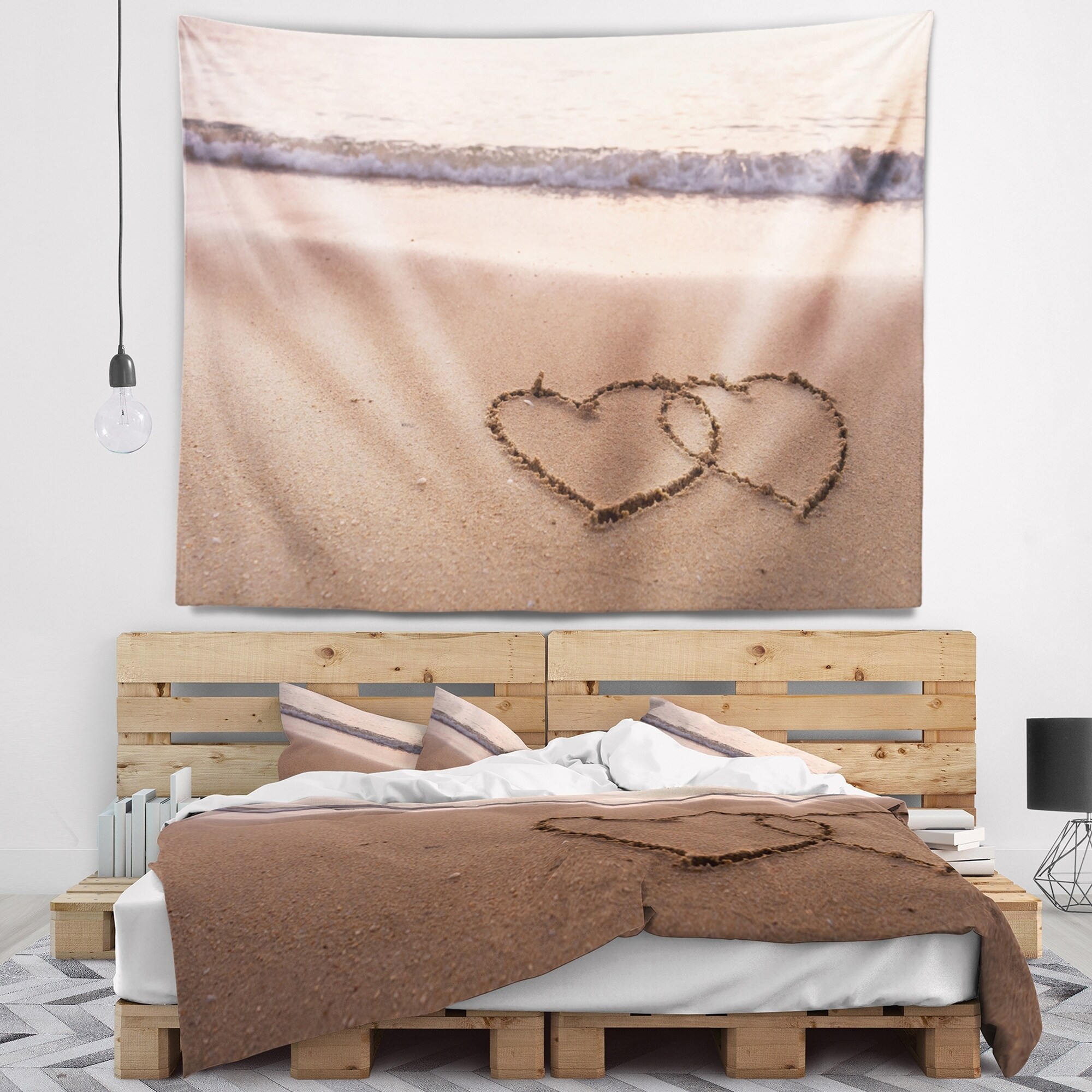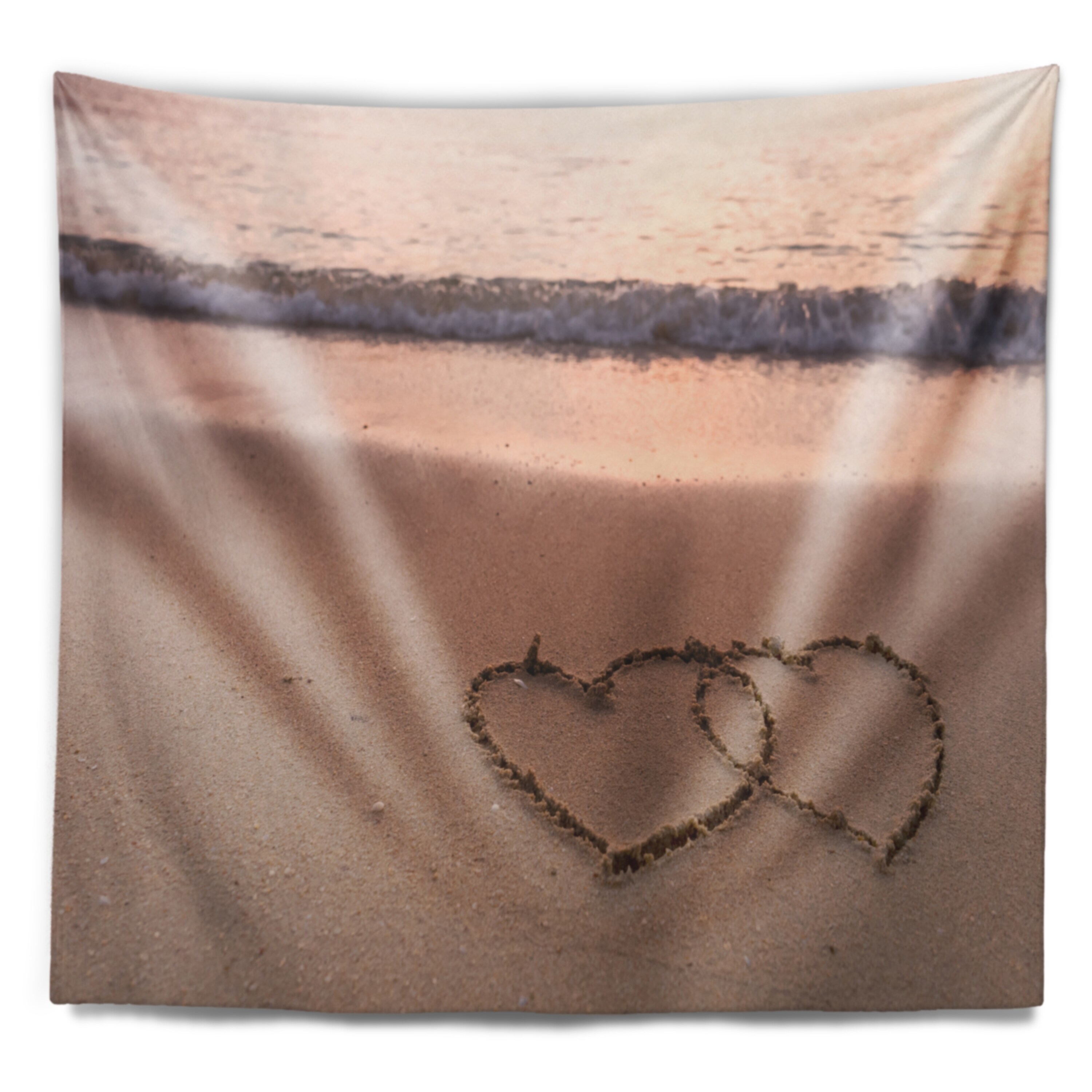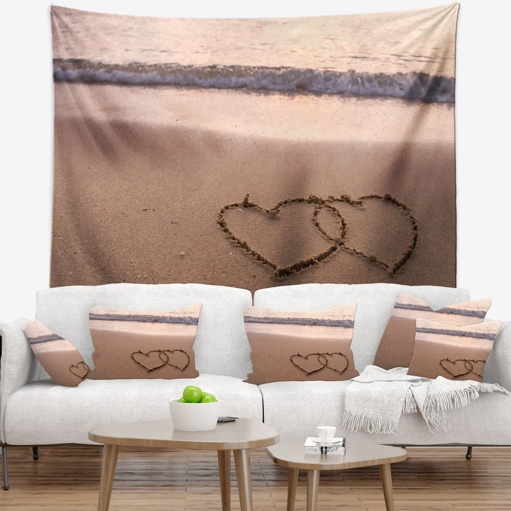 For a quick and easy home or office makeover, our wall tapestries are a great way to add a modern touch of décor and a pop of color to any room in your home or office. This Sea & Shore wall tapestry is created on light weight, wrinkle resistant, polyester fabric making it very easy to install on any wall.These Coastal wall tapestry is printed using High Color Density Italian inks to create a vibrantly colored, sharp artwork.This beautiful Two Hearts Drawn on the Beach wall hanging artwork can also be used as a Bedspread, Bed Cover, Room Décor Tapestry, Beach Throw.This Sea & Shore tapestry will easily change the plainest wall into an art display. This tapestry serves as a beautiful piece of wall art and through our vast selection of designs and such easy hanging, can be changed frequently Free Shipping Over $49.99* Details Designart 'Two Hearts Drawn on the Beach' Seascape Wall Tapestry Product Description: For a quick and easy home or office makeover, our wall tapestries are a great way to add a modern touch of décor and a pop of color to any room in your home or office. This Sea & Shore wall tapestry is created on light weight, wrinkle resistant, polyester fabric making it very easy to install on any wall. These Coastal wall tapestry is printed using High Color Density Italian inks to create a vibrantly colored, sharp artwork. This beautiful Two Hearts Drawn on the Beach wall hanging artwork can also be used as a Bedspread, Bed Cover, Room Décor Tapestry, Beach Throw. This Sea & Shore tapestry will easily change the plainest wall into an art display. This tapestry serves as a beautiful piece of wall art and through our vast selection of designs and such easy hanging, can be changed frequently with the seasons or simply your mood. Features Created on 100% lightweight polyester fabric Anti-wrinkle Easy to hang Vibrant rich colors and sharp details Available in multiple sizes and designs Print on Demand with High Density Italian Ink Available in Several sizes Attribute Coastal, Beach, Tropical Subject Sea & Shore, Nautical, Landscapes Care Instructions: - Hand wash or machine wash on gentle cycle.