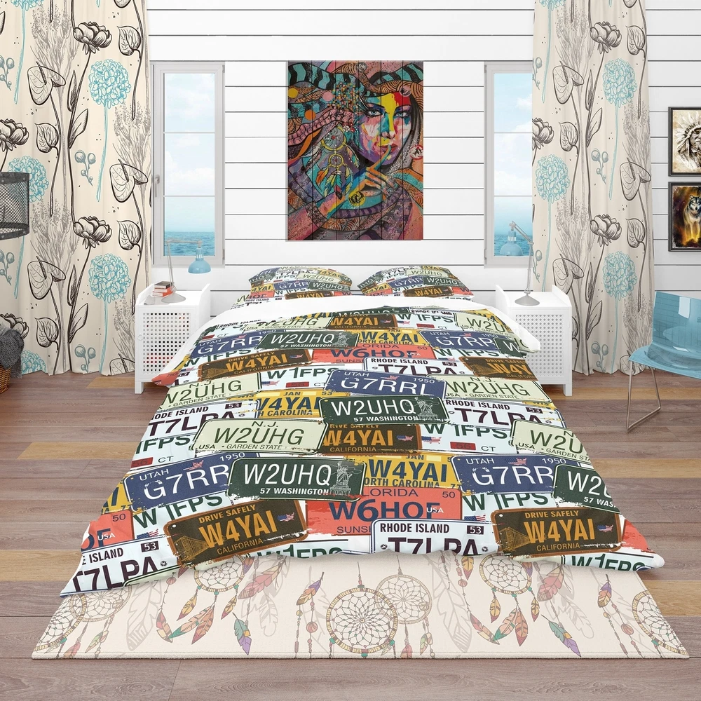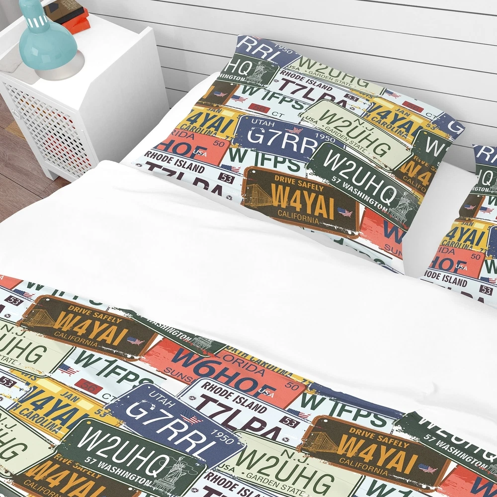 Transform your bedroom into a cozy retreat with this luxurious and stylish Modern & Contemporary bedding set. Featuring a stunning design of US California licence plates, printed with high density Italian ink, this set boasts rich and vibrant colors that will bring life to your space. Made from ultra-soft and lightweight 100% microfiber polyester, this set is wrinkle-resistant and offers down-like comfort, ensuring you sleep soundly all night. The set includes one duvet cover and two shams, making it a complete and stylish package. Available in twin, queen, and king sizes, this Contemporary Abstract set is a must-have for any bedroom.Features: Vibrant colors printed with high density Italian ink Made from ultra-soft and lightweight 100% microfiber polyester Includes one duvet cover and Free Shipping Over $49.99* Details Designart 'Us California Licence Plates' Modern & Contemporary Bedding Set - Product Description: Transform your bedroom into a cozy retreat with this luxurious and stylish Modern & Contemporary bedding set. Featuring a stunning design of US California licence plates, printed with high density Italian ink, this set boasts rich and vibrant colors that will bring life to your space. Made from ultra-soft and lightweight 100% microfiber polyester, this set is wrinkle-resistant and offers down-like comfort, ensuring you sleep soundly all night. The set includes one duvet cover and two shams, making it a complete and stylish package. Available in twin, queen, and king sizes, this Contemporary Abstract set is a must-have for any bedroom. Features: Vibrant colors printed with high density Italian ink Made from ultra-soft and lightweight 100% microfiber polyester Includes one duvet cover and two shams for a complete and stylish look Trendy and fun color scheme to brighten and update your bedroom Made in Canada Actual comforter inserts and pillow inserts are not included. This set includes the two pillow shams and comforter cover only. Decorative wall art and throw pillows to match this set are available but sold separately King: 1 Duvet Cover104 inches wide x 88 inches long 2 King Shams20 inches wide x 36 inches long Queen: 1 Duvet Cover88 inches wide x 88 inches long 2 Standard Shams16 inches wide x 26 inches long Twin: 1 Duvet Cover68 inches wide x 88 inches long 1 Standard Sham16 inches wide x 26 inches long Product Details: MaterialPolyester PatternAbstract ColorBlue StyleContemporary Abstract, Modern & Contemporary, Transportation ReversibleNo Care Instructions: Machine wash on cold gentle cycle. Wash separately on first wash. Use only non-chlorine bleach when needed. Tumble dry low. Remove promptly.